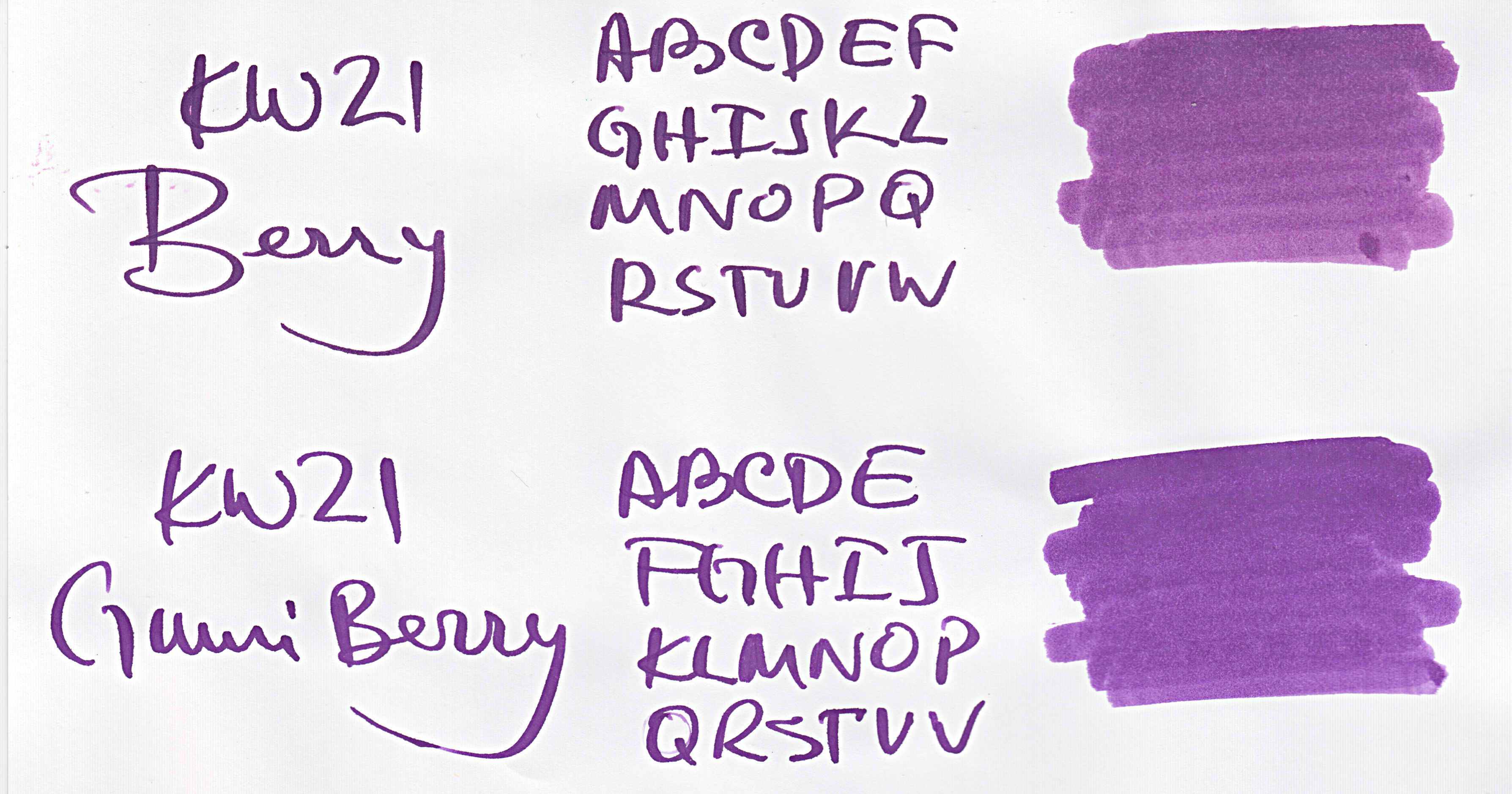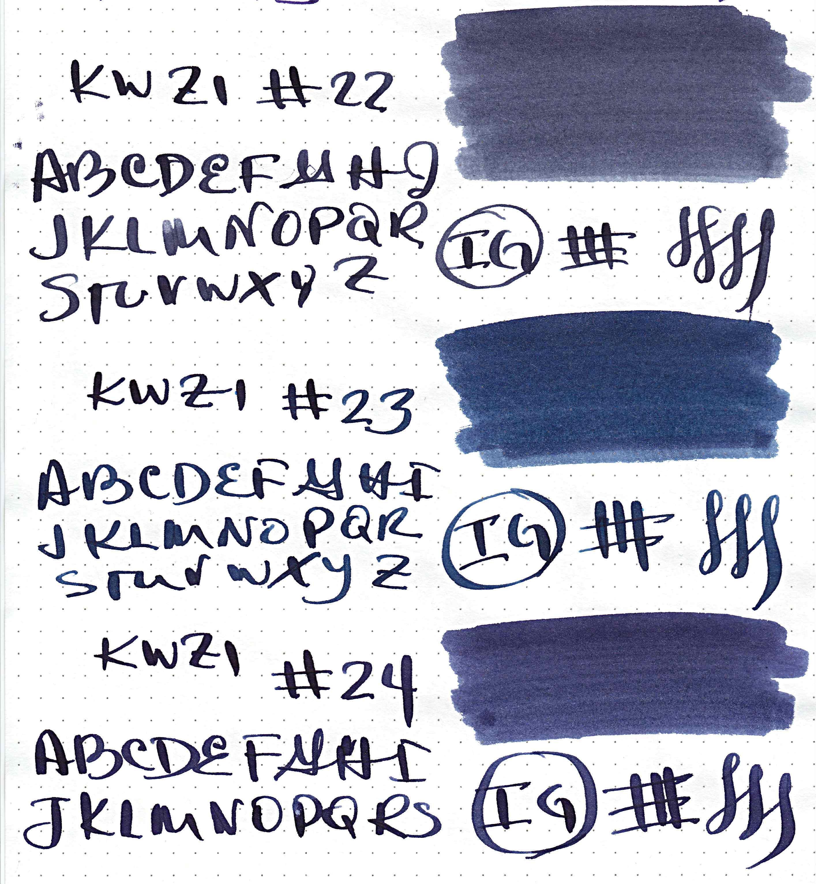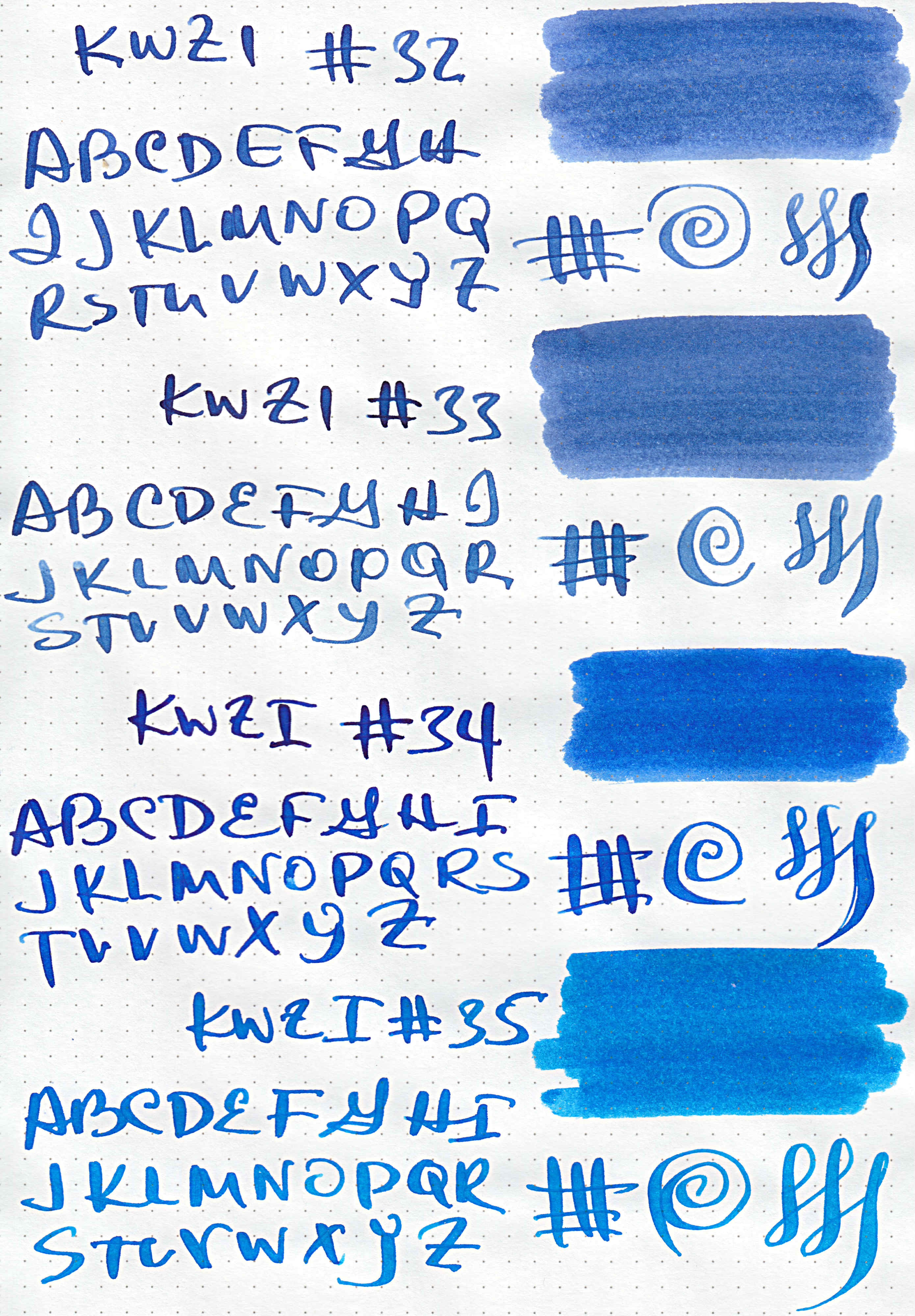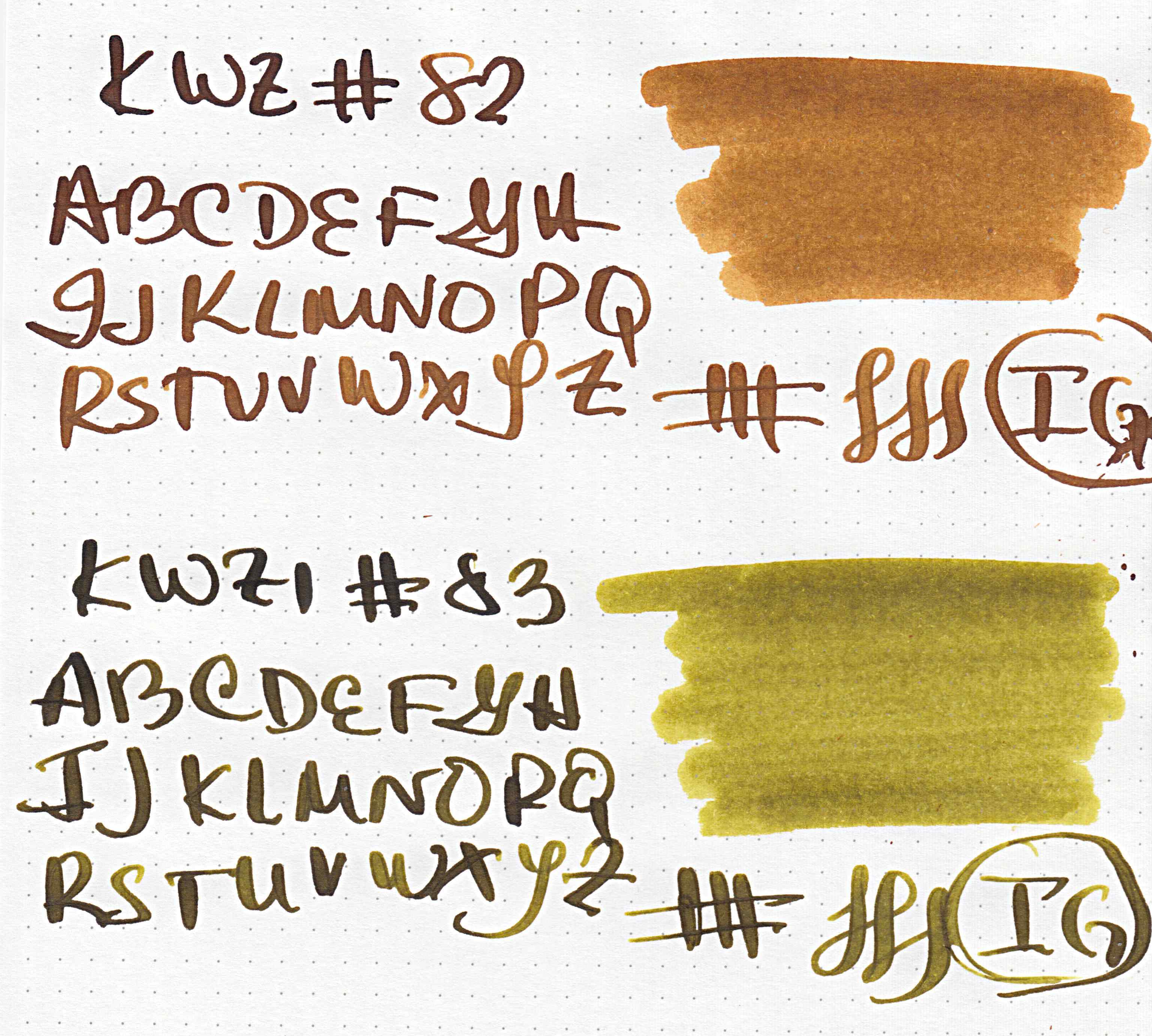 Nelle foto, i numeri di due cifre che vedete affiancati alla scritta "KWZI" fanno riferimento al vecchio indice di classificazione adottato da Konrad (da ignorare): provvedo a elencare in ordine, sopra ogni immagine, il nome corretto con numero identificativo corrente di ogni inchiostro.