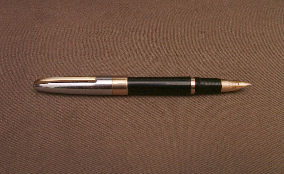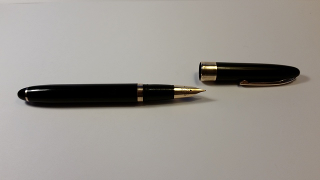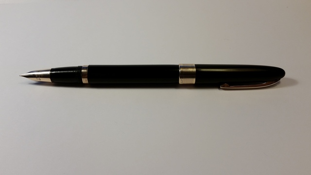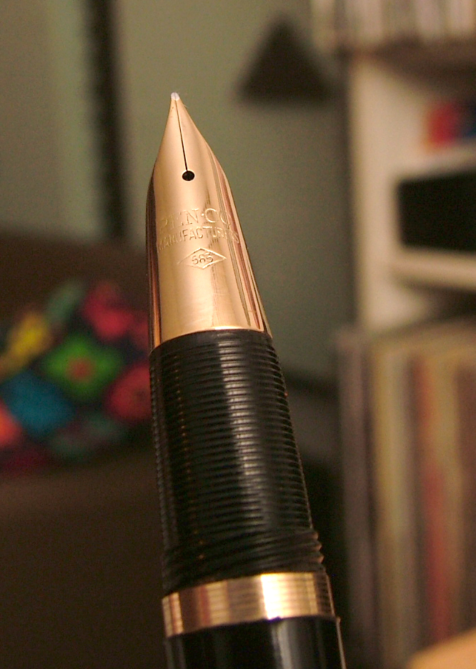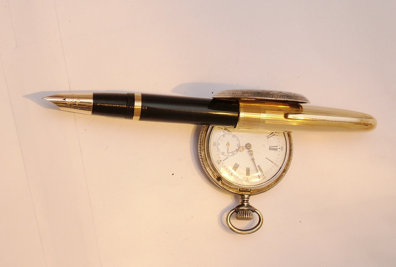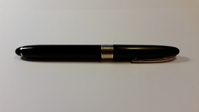 Oggi son qui per condividere con voi appassionati una penna meravigliosa. Ieri mattina, nella mia solita ricerca tra i mercatini di paese (ieri era a Treviglio), ho trovato in mezzo a rottami la penna in questione che mi ha incuriosito parecchio. Il venditore credeva fosse una Parker, dato il marchio della scatola che la conteneva. A prima vista sembrava una Sheaffer, con il suo pennino triumph. Osservandola meglio notai la scritta Penco sia sulla vera del cappuccio sia sul pennino. Acquistata per una somma esigua (data la delusione del venditore per il fatto di non essere una Parker), l'ho portata a casa, pulendola minuziosamente dall'enorme quantità di inchiostro secco su tutta la penna. Ho lucidato il pennino e la vera, ho eliminato il vecchio sacchetto oramai distruttoe ho fissato il piccolo anellino sotto la sezione. La Penco è una penna che cercavo da molto tempo e che mi ha sempre affascinato. L'ho intravista al Pen Show di Milano per la prima volta (la versione con il cappuccio totalmente dorato) e ora sono finalmente contento di averne una. Due cose mi lasciano un pochino perplesso: