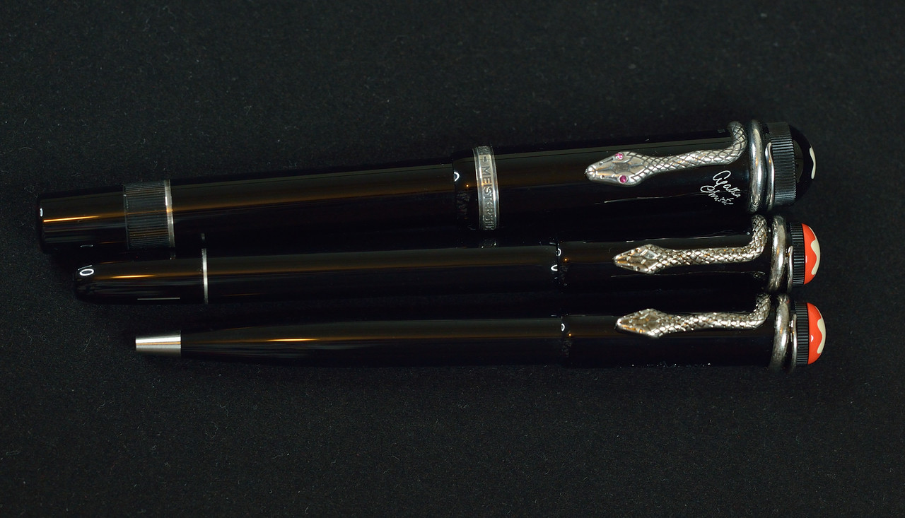 Piston Fountain Pen and Rollerball are made out of original hard rubber, picking up historical materials Montblanc used to work with in the 1920s. Two green gemstones set as eyes of the snake clip. The limitation is based on the year of the origin of Montblanc – 1906.