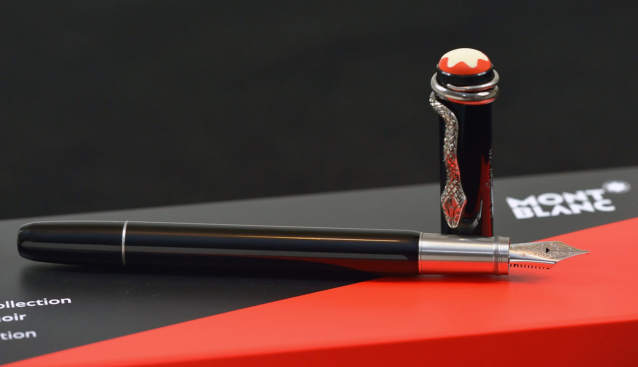 Piston Fountain Pen, Rollerball and Ballpoint Pen in black precious resin, a barrel in black lacquer and a metal forepart. The cap top is refined with the traditional off-white snow cap, embedded in coral red precious resin that refers to the former Rouge & Noir collection. The snake clip, which was already very popular in the 1920s, appeals with a vintage appearance and matching fittings.