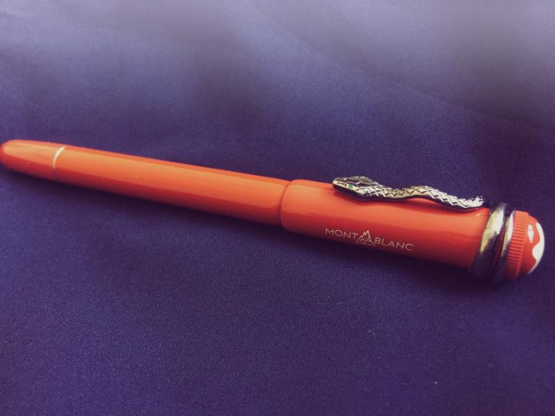 Piston Fountain Pen, Rollerball and Ballpoint Pen with coral lacquered barrel and precious resin cap as well as a metal forepart. The cap top is refined with the traditional off-white snow cap, embedded in coral red precious resin that refers to the former Rouge & Noir collection. The coral colour is a reminiscence of the colour code back in the twenties. Two green gemstones set as eyes of the snake clip.