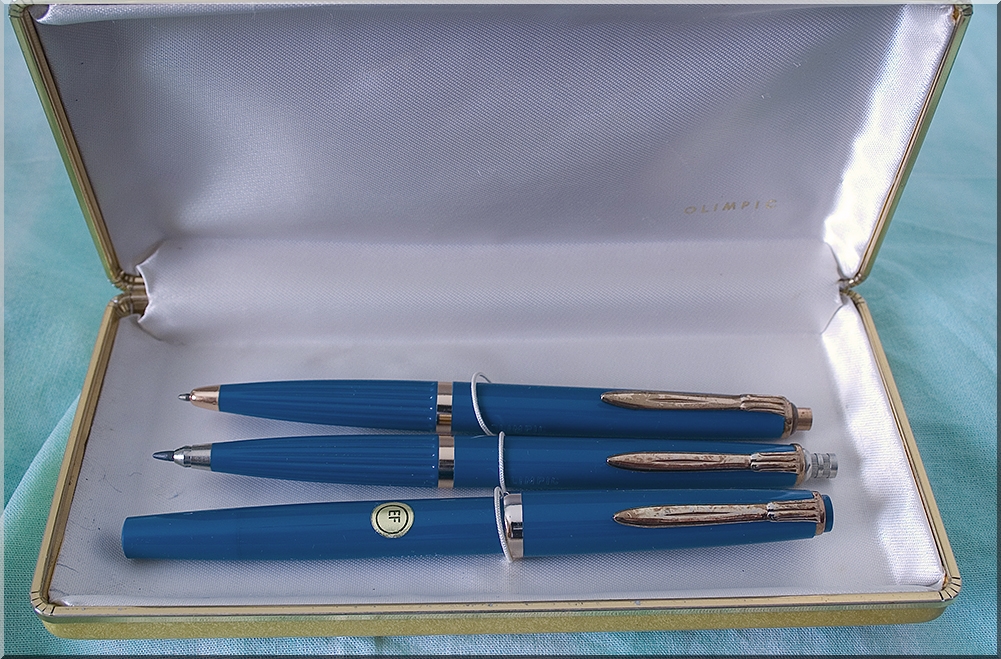 Ad uno sguardo superficiale il nome Olimpic mi aveva richiamato alla mente un marchio di Settimo Torinese, ma poi la lettura del foglietto di garanzia accluso mi ha subito deviato verso Est in particolare a Vicenza, e in tutti casi il marchio di Settimo è Olimpica e non Olimpic. La stilografica è inserita in un "trio" con la matita meccanica e la penna a sfera le cui linee richiamano smaccatamente la svedese Ballograf Epoca, penna di grandissimo successo ai tempi.