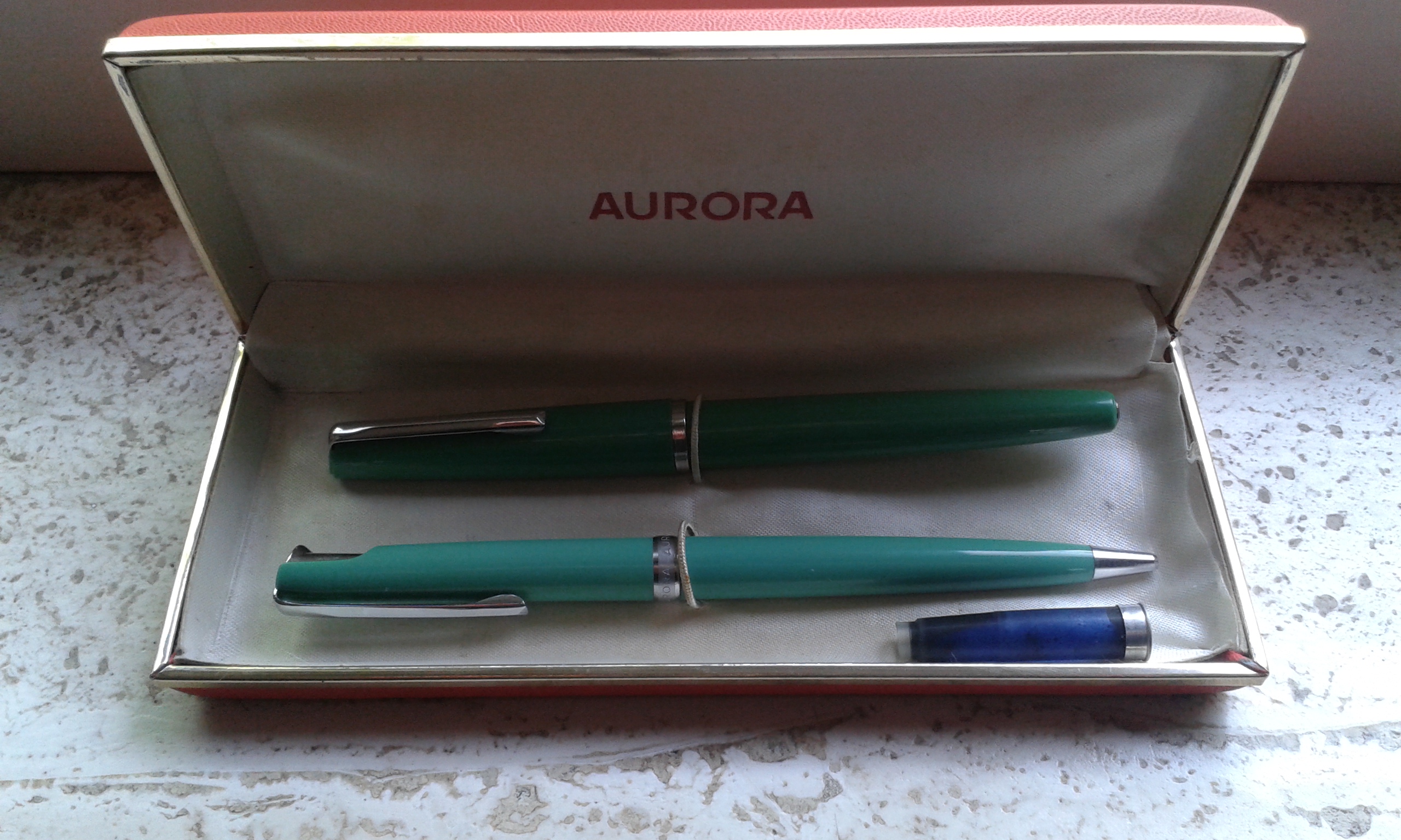 Scovata in un mercatino una parure Aurora composta da stilo e biro ( modello Auretta) con annesse cartucce, il tutto con scatola d'epoca.