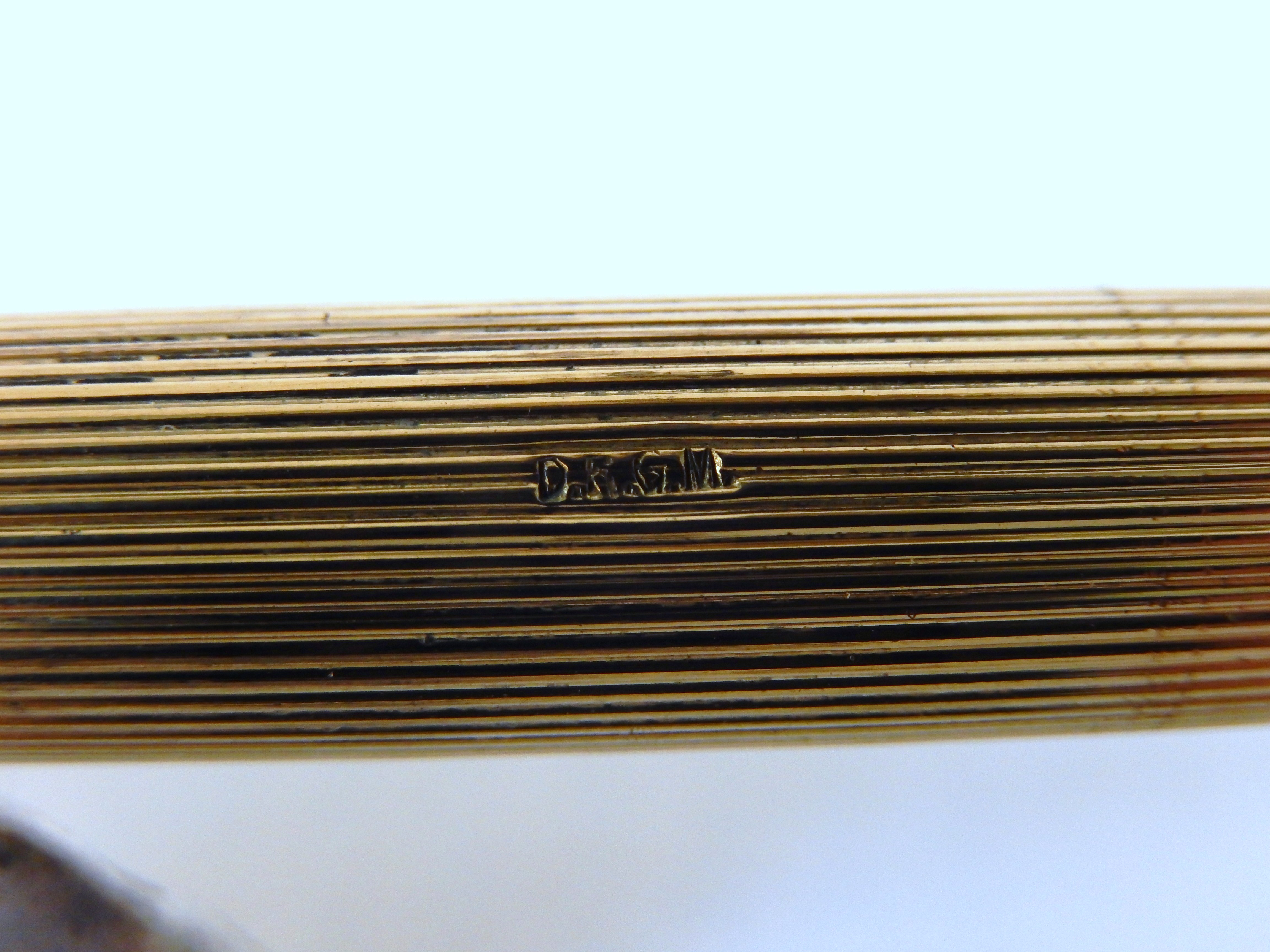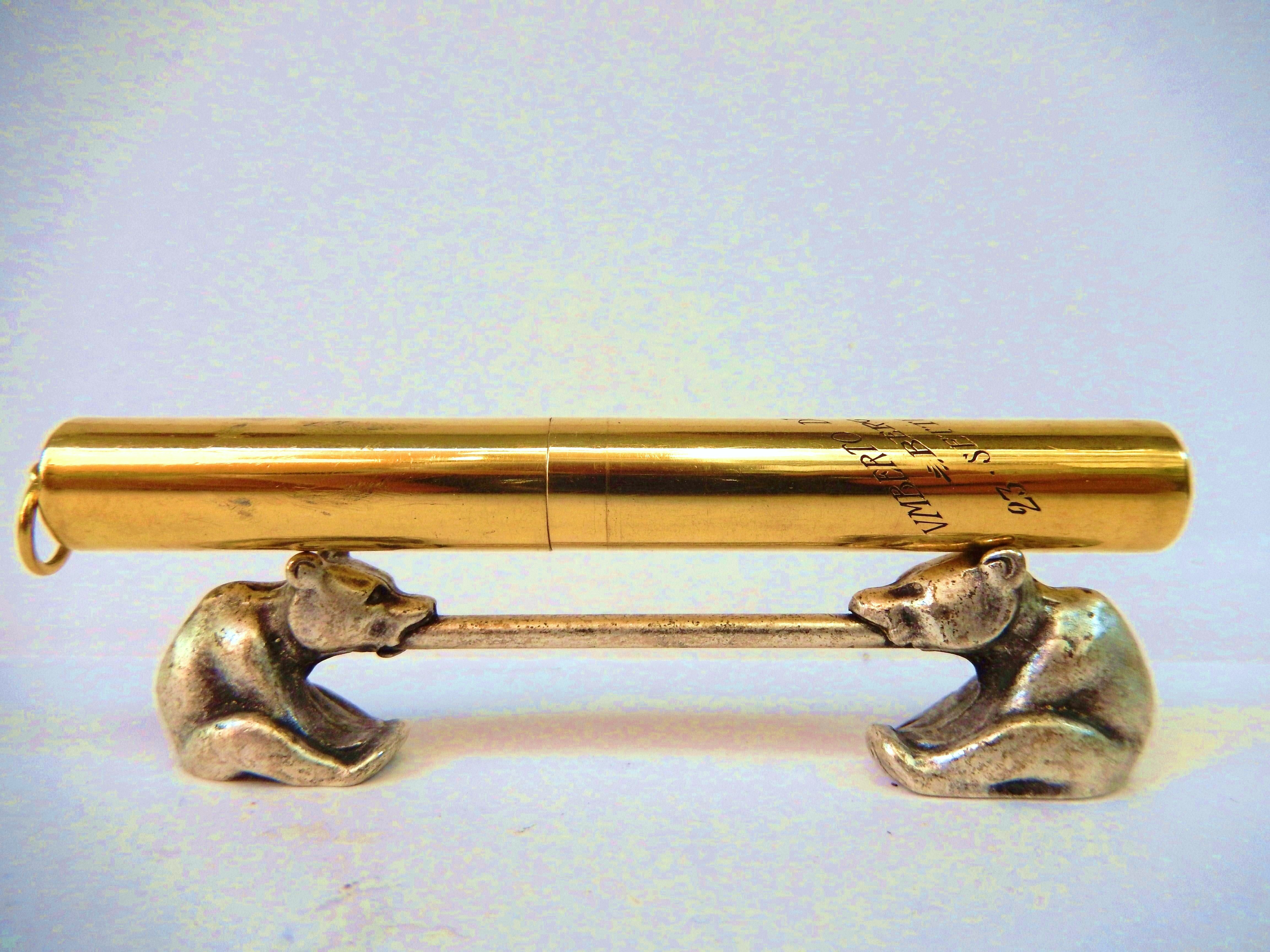 Le penne telescopiche erano alla fine del 1800 ed inizio 900 piuttosto in voga sulla scia di pencil e dip pen prodotte da affermati maestri quali Sampson Mordan e W.S.Hicks in Inghilterra e Stati Uniti. Sul corpo è ben leggibile la sigla DRGM (Deutsches Reichsgebrauchsmuster) marchio che dal 1891 e fino al 1950 circa ha rappresentato l'avvenuta registrazione di un disegno o di una funzione in tutte le regioni tedesche.
