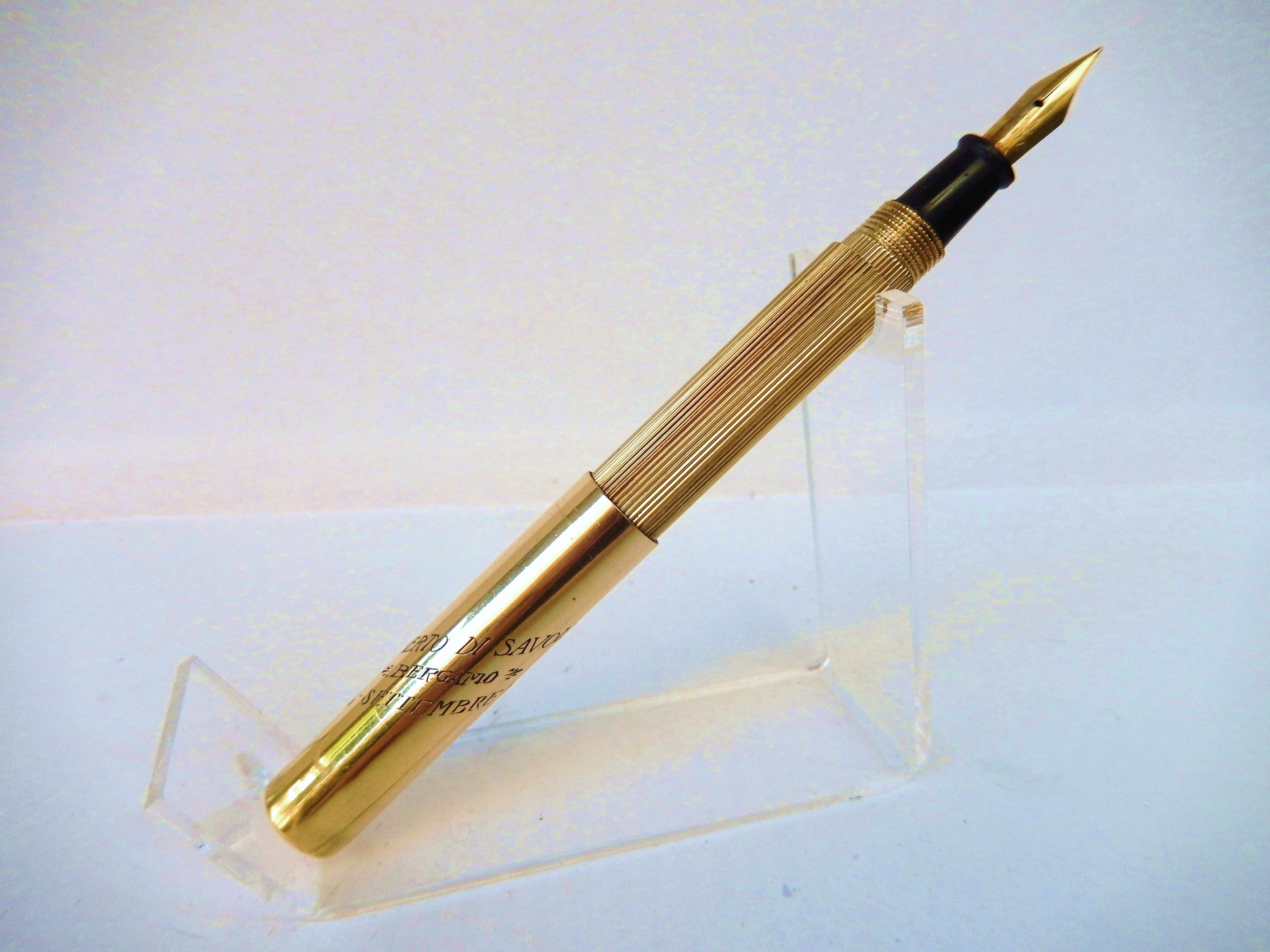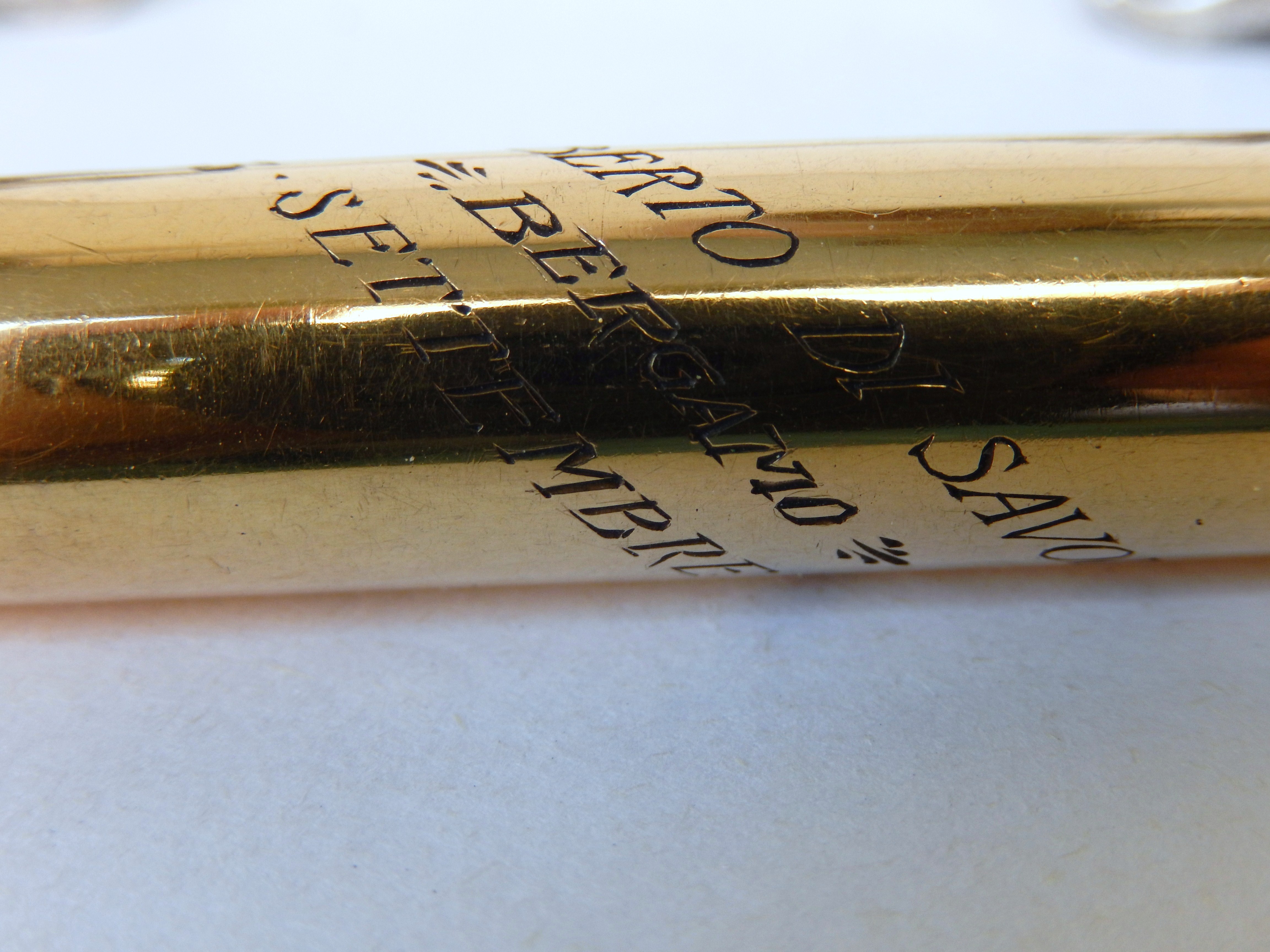 La penna misura chiusa 9,7 cm e sul corpo riporta avvolgente in stampatello la dedica "Umberto di Savoia Bergamo "23 Settembre 1913". Solo dopo