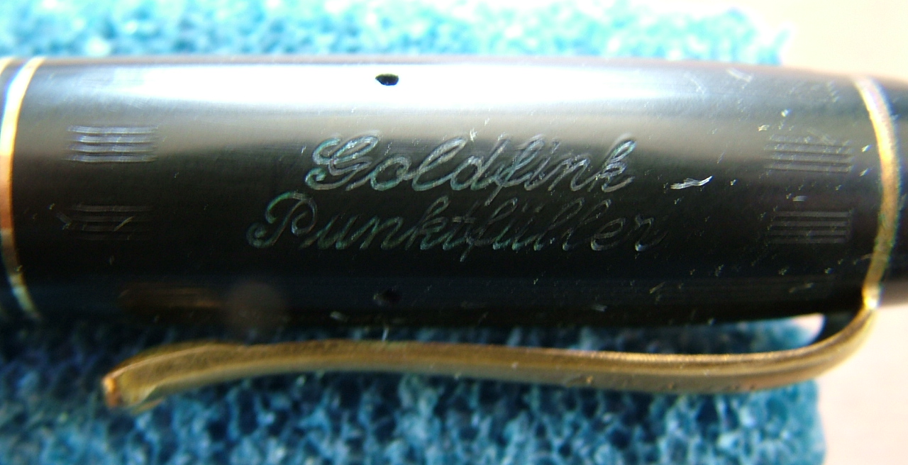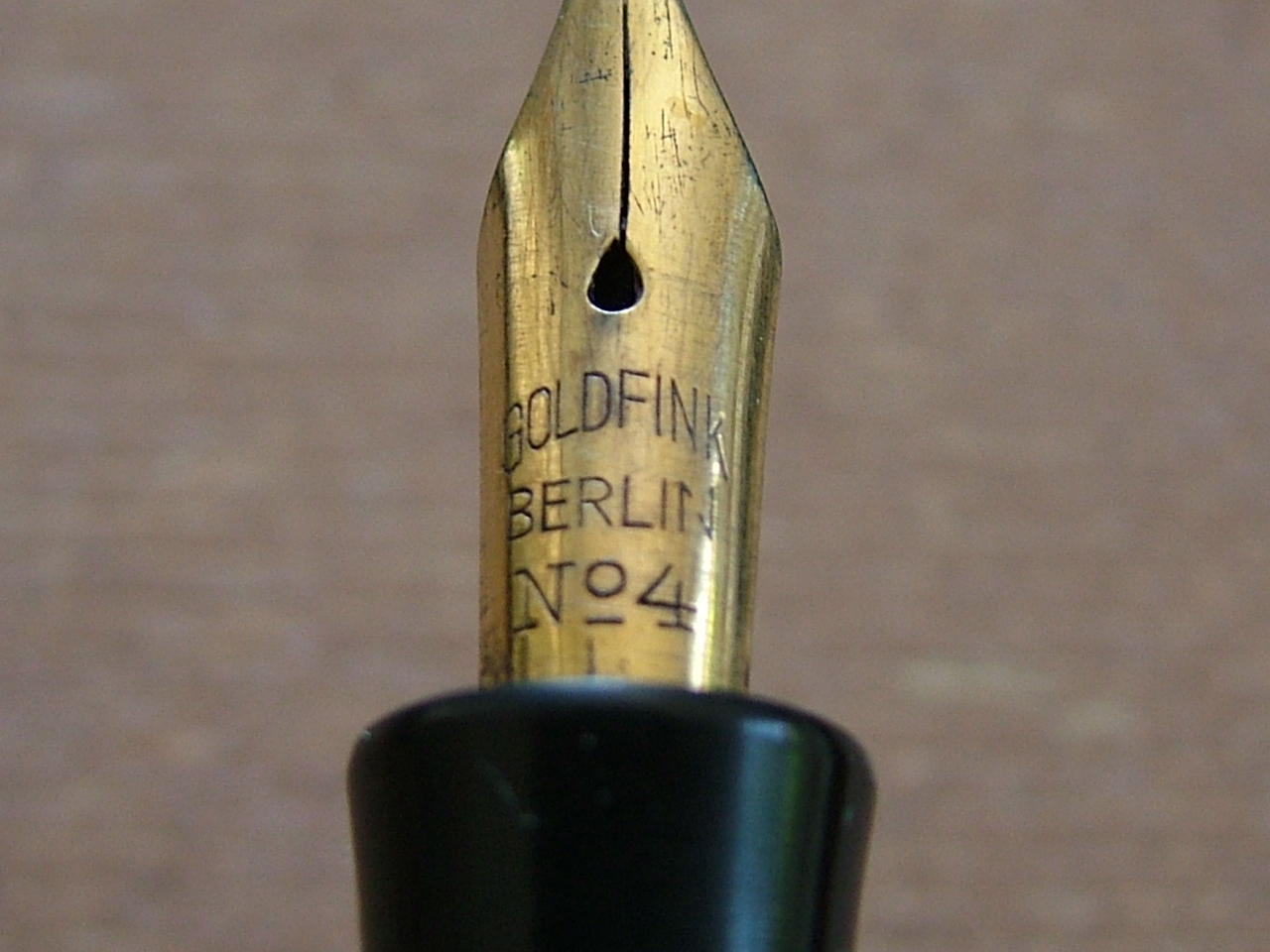 Il pezzo forte, a mio parere naturalmente, è la stilografica il cui pennino flessibile ha inciso su tre righe, Goldfink - Berlin - N°4. Il cappuccio ha due anellini lato bordo e la clip con la scritta Goldfink, scritta che appare anche sul corpo del cappuccio e sovrasta la parola Punktfüller.