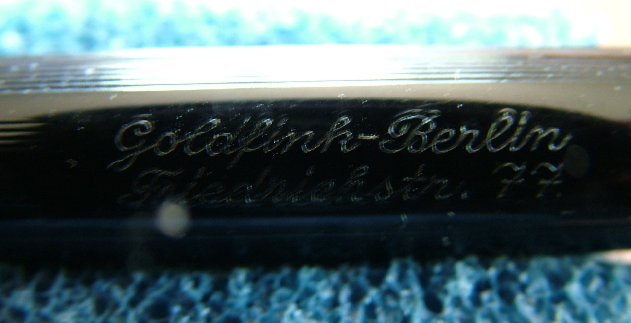 Sulla clip figura, penso riferita alla marca la scritta “Goldfink” in corsivo, e la stessa scritta appare anche sulla circonferenza del fondello assieme alla parola “Berlin”.
