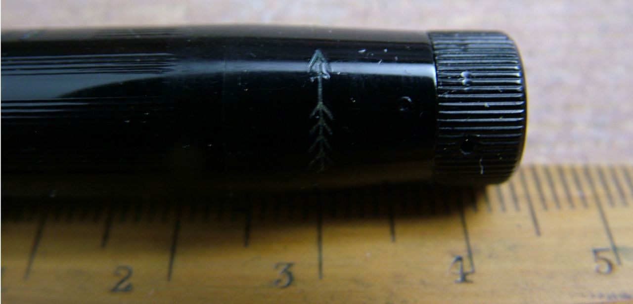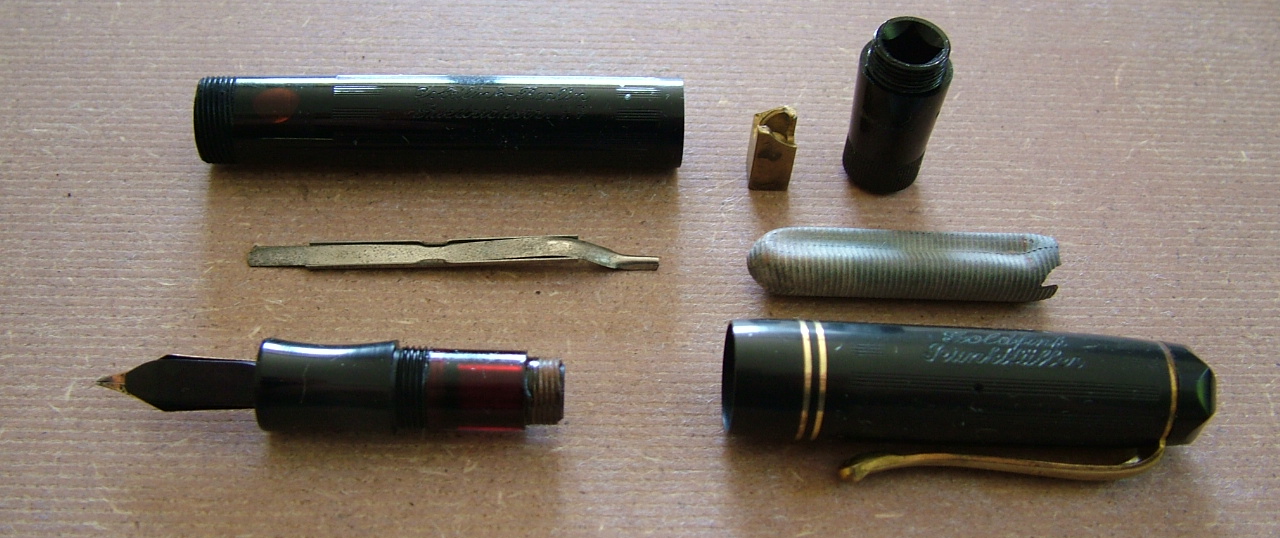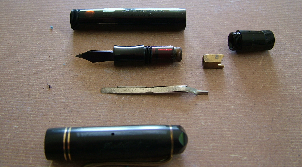 La prima parte, filettata, è avvitata al corpo penna e contiene un piccolo parallelepipedo di ottone, sagomato con due diagonali, sul lato che vede il secondo pezzo, per interagire con la chiavetta che vi è alloggiata.
