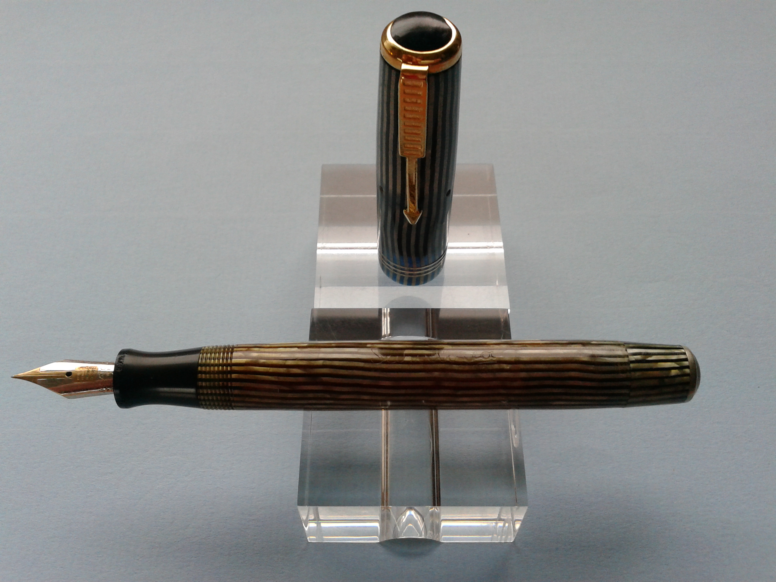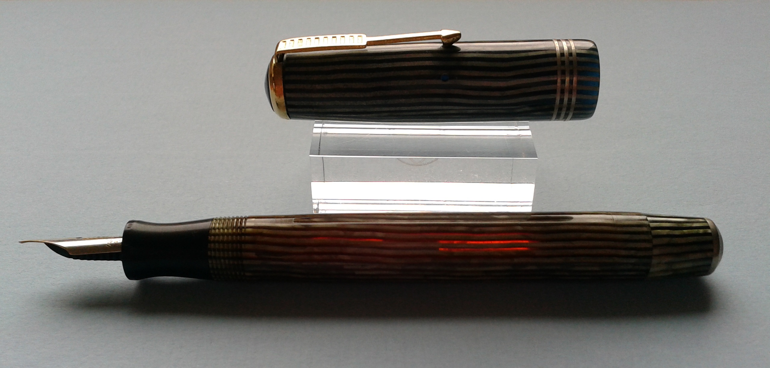 SARATOGA MEDIUM in celluloide bicolore semitrasparente a righe bianche tornita da barra piena, pennino bicolore Saratoga in oro 585‰ platinato, parti metalliche a vista placcate oro, caricamento a sfiatatoio, produzione Italia 1938.
