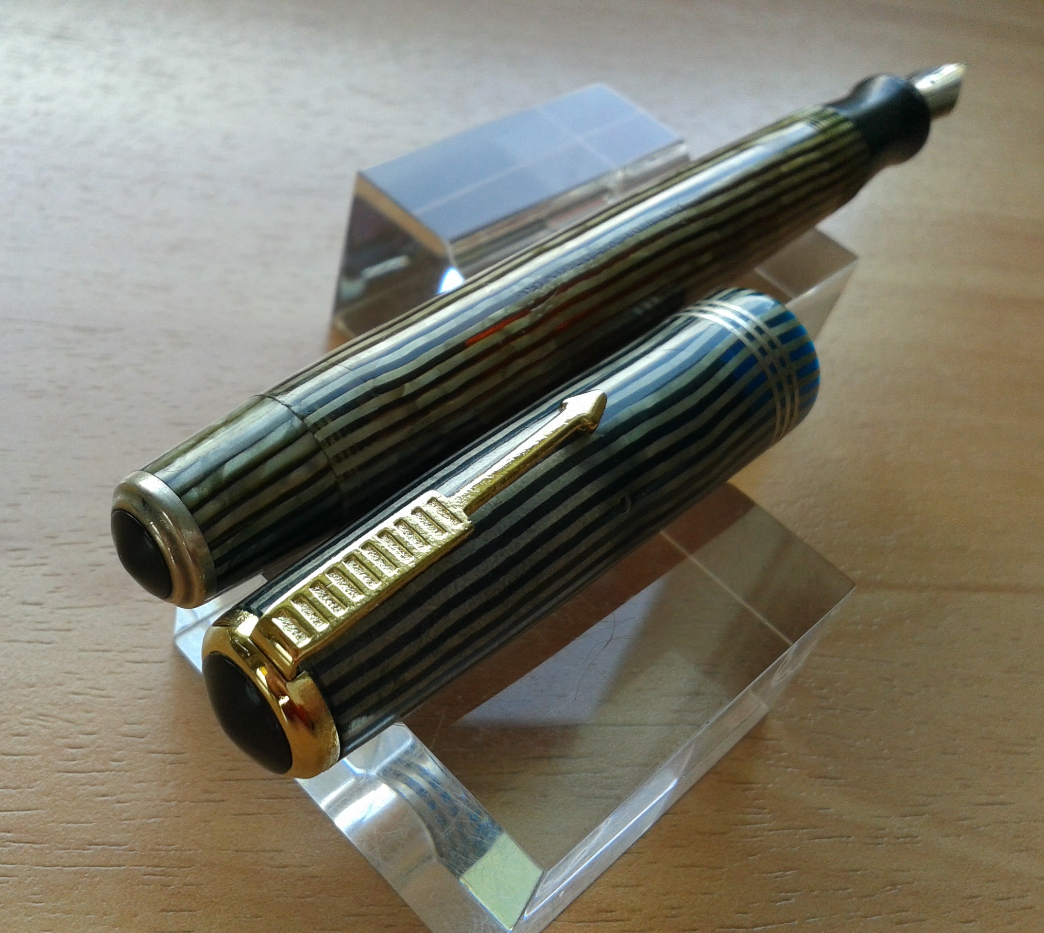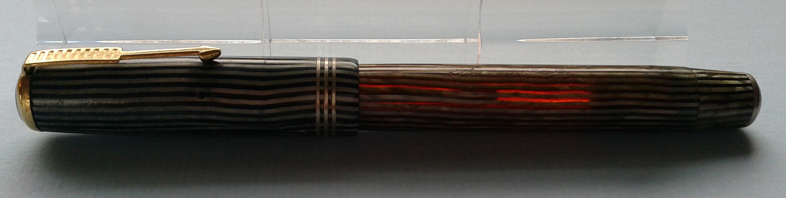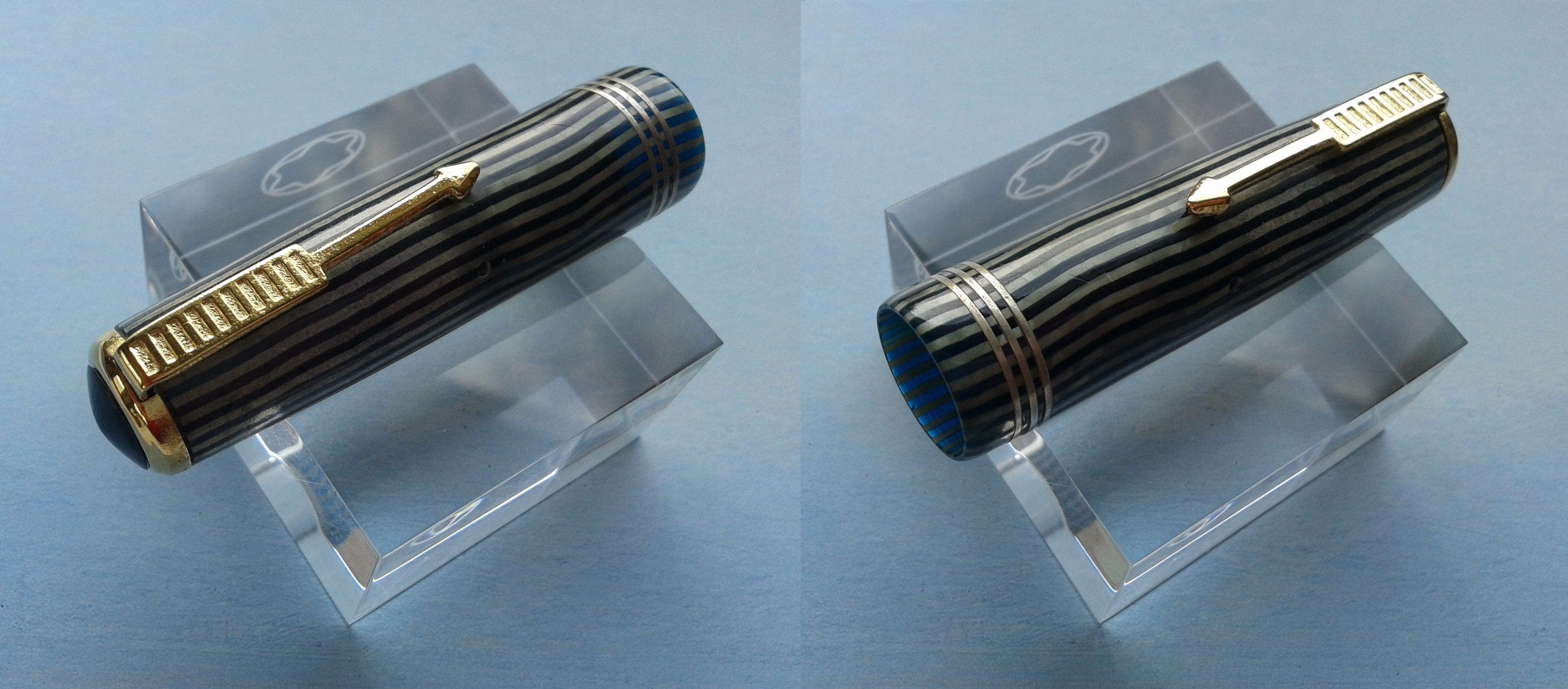 Questo inconfondibile dettaglio stilistico (cappuccio opaco e corpo trasparente, in due colori differenti) è ben visibile anche nell'esemplare di Maxima fotografato a pag.190 de "La Storia della Stilografica in Italia 1900-1950" di Letizia Jacopini e nell'unica altra Saratoga con celluloide a righe (Maxima o Medium che sia, ché il modello è uguale, cambiano solo leggermente le dimensioni, ad es. il diametro del fusto da 13 a 12 mm.) da me rinvenuta in rete.