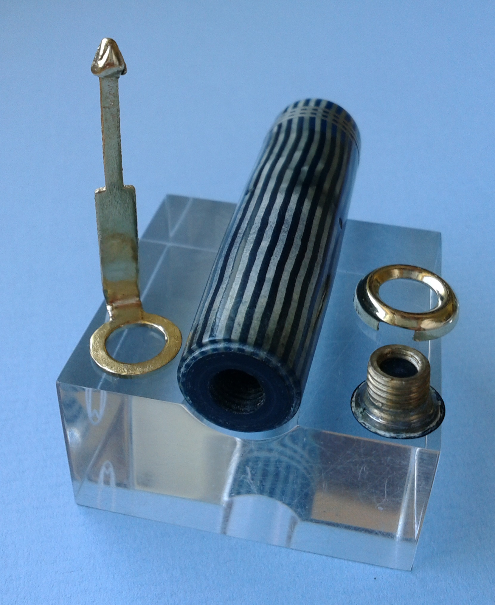 Poco sopra al labbro, ove il cappuccio segna il massimo diametro della penna, troviamo una classica decorazione in metallo costituita da tre anellini (originariamente dorati) dello spessore complessivo di 3mm., inseriti perfettamente a filo della celluloide.