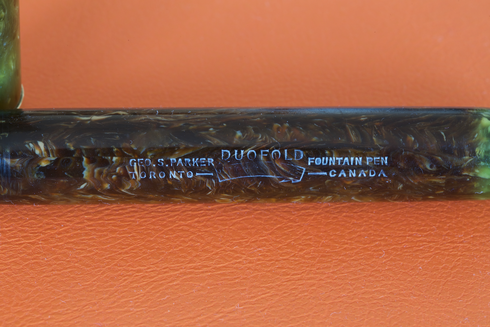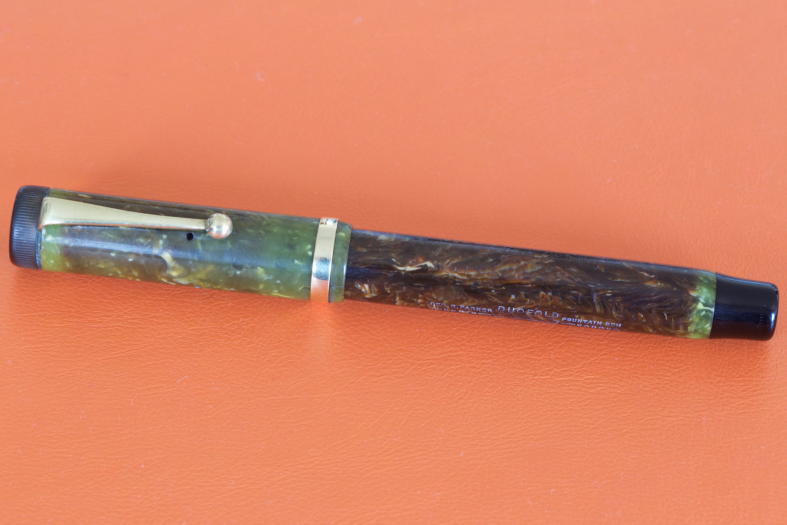 è una bella penna, ma non è una Black Tipped Jade, è una Duofold normale (beh, si fa per dire, è sempre l'ammiraglia della Parker dell'epoca, ed una penna che ha fatto la storia). Lo riconisci facilmente dato che l'iscrizione ed il pennino riportano la scritta Duofold. All'epoca era senz'altro più prestigiosa lei, anche se oggi la Black Tipped Jade è considerata più interessante dato che è più rara. Ma sono fisime da collezionisti, si tratta esattamente della stessa penna...