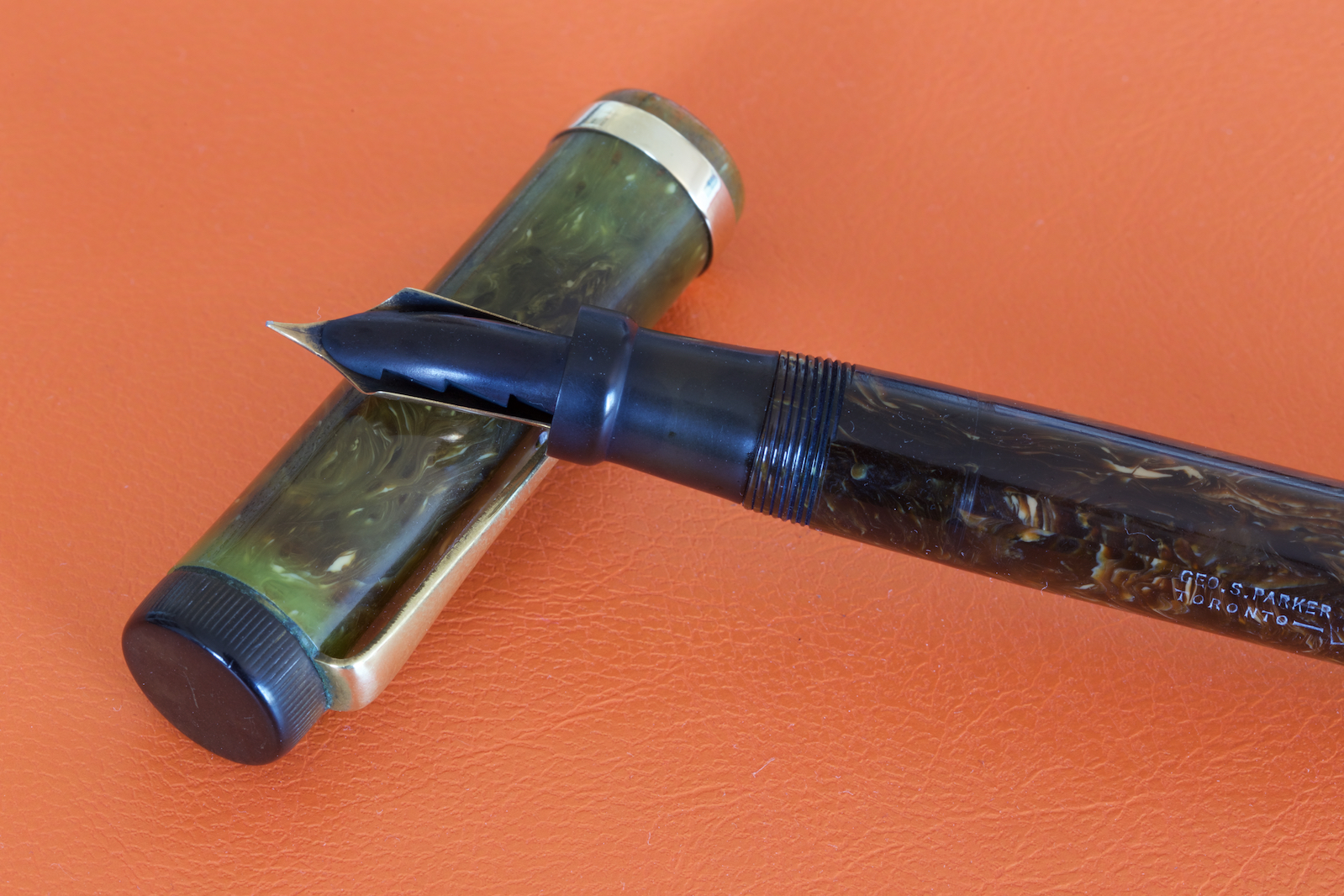 Altro ritrovamento, da quello che ho letto dovrebbe essere una Senior Parker Black Tipped Jade in Permanite databile al 1926. La permanite era la prima celluloide utilizzata dalla Parker, peccato abbia cambiato colore. La penna è davvero imponente, ha un pennino davvero grande e la carica è a pulsante di fondo. Sono in attesa del suo sacchetto per provarla per bene. Trovo molto strano che la clip non riporti la dicitura Parker, in rete ho visto dalle foto che tutte erano così marchiate. La veretta mancava e l' ho fatta al meglio delle mie possibilità...