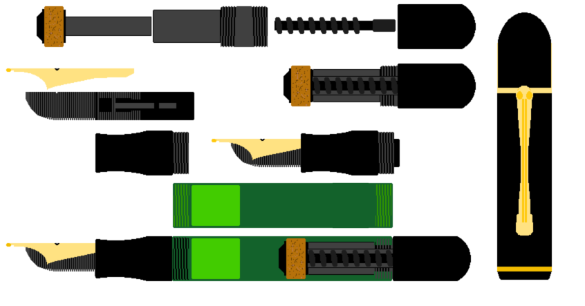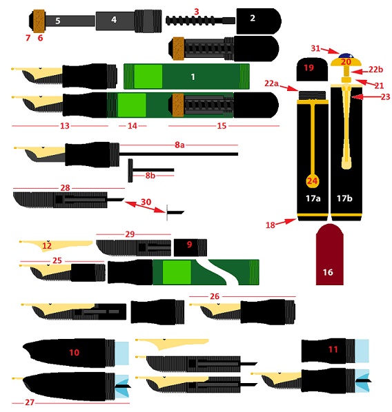Mi son fatto persuaso (scritto da Montalbano avrebbe più enfasi), che avere uno specchietto con parte dei termini relativi alle componenti di una penna, raggruppati in un unico disegno, potrebbe essere comodo, e dato che scorrazzando nel Wiki non mi sono ancora imbattuto in nulla di pronto, ho pensato di assemblarne uno io.