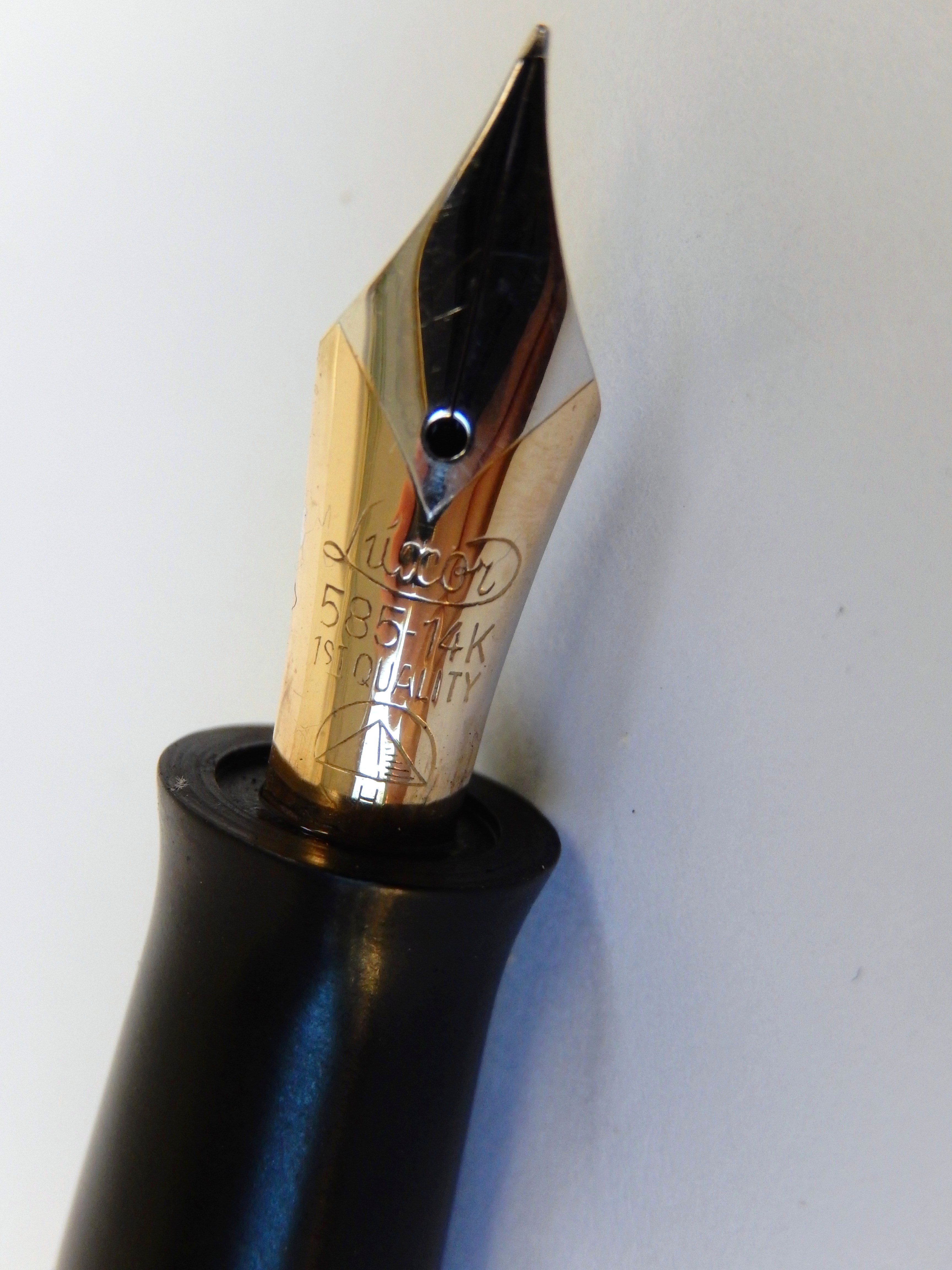 Molto bello e flessibile il pennino in oro bicolore 14 Kt, che riporta inciso su tre livelli " Luxor/585 14 K/ 1st quality" scritte che sovrastano ancora