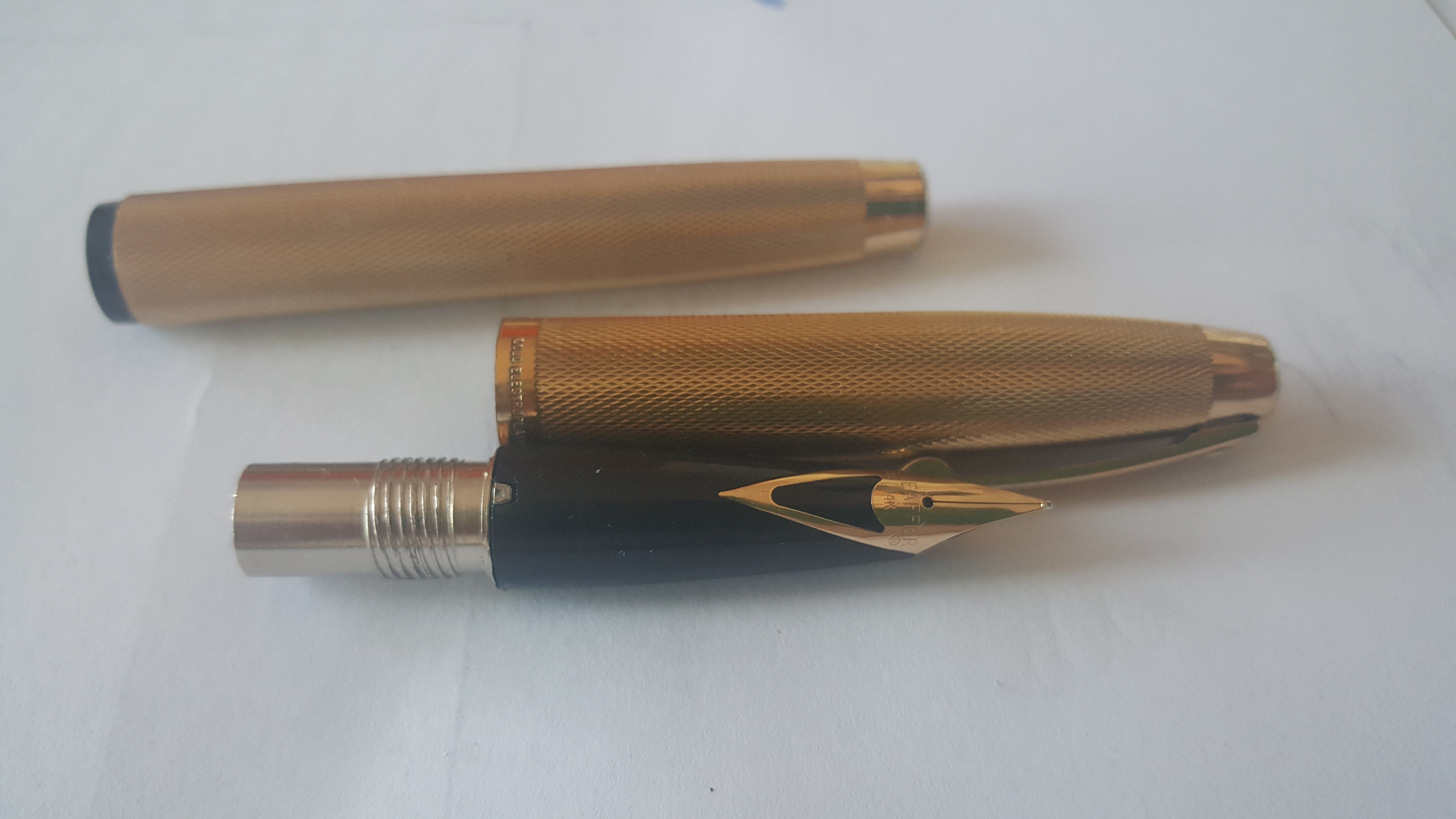 A prima vista, considerando che qualche tempo fa mi ero studiato i vari modelli placcati oro della Sheaffer Imperial, avrei detto fosse una Sheaffer Imperial 827, nel pattern barleycorn. Ma la forma del pennino proprio non mi tornava. Finché non ho trovato qui la 827 ma con il pennino "sorridente". Dacci un'occhiata e dimmi che ne pensi. E se ho preso una cantonata spero qualcuno di più esperto identifichi la penna, perché distinguere i vari modelli della Sheaffer è un'impresa biblica :lol: