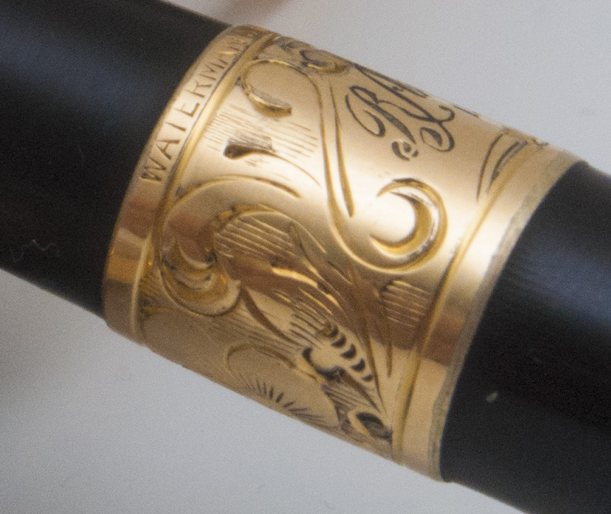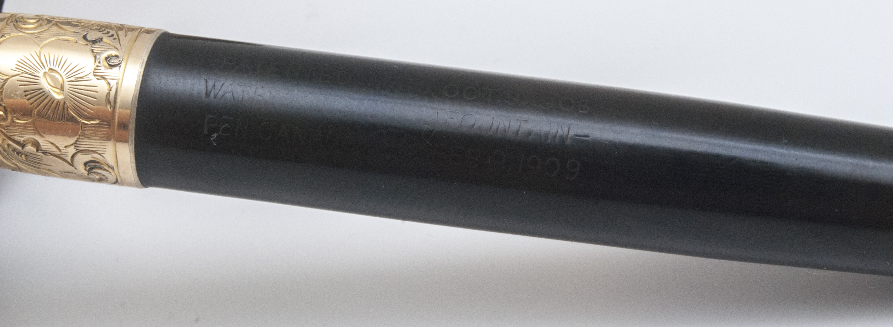 In ebanite nera ha un corpo lungo 11 cm dal labro prima del pennino al fondello perfettamente cilindrico e con un diametro costante di 11 mm fino a poco prima del fondello piatto quando il diametro si restringe leggermente. Il corpo è decorato con le classiche incisioni a macchina che caratterizzano la produzione Waterman del periodo (che purtroppo o per fortuna sul mio esemplare sono molto consumate). Al centro del corpo, da parti opposte troviamo le incisioni su 3 righe:
