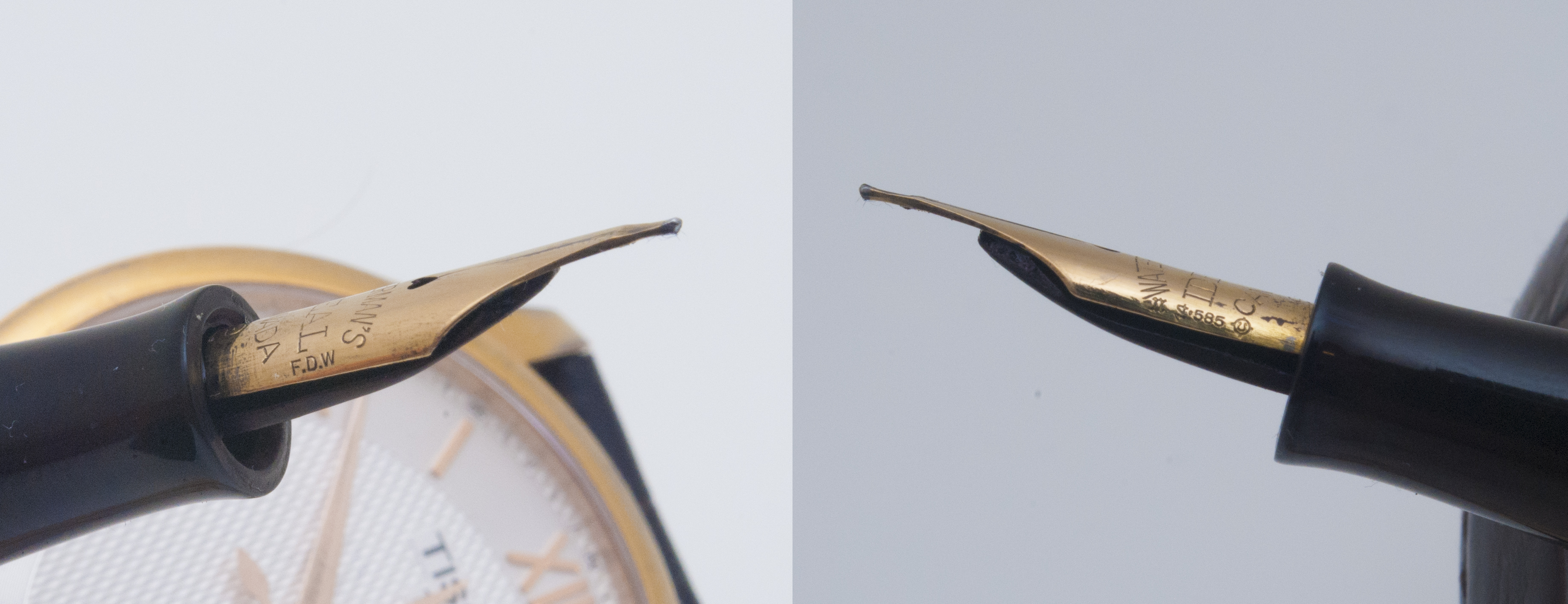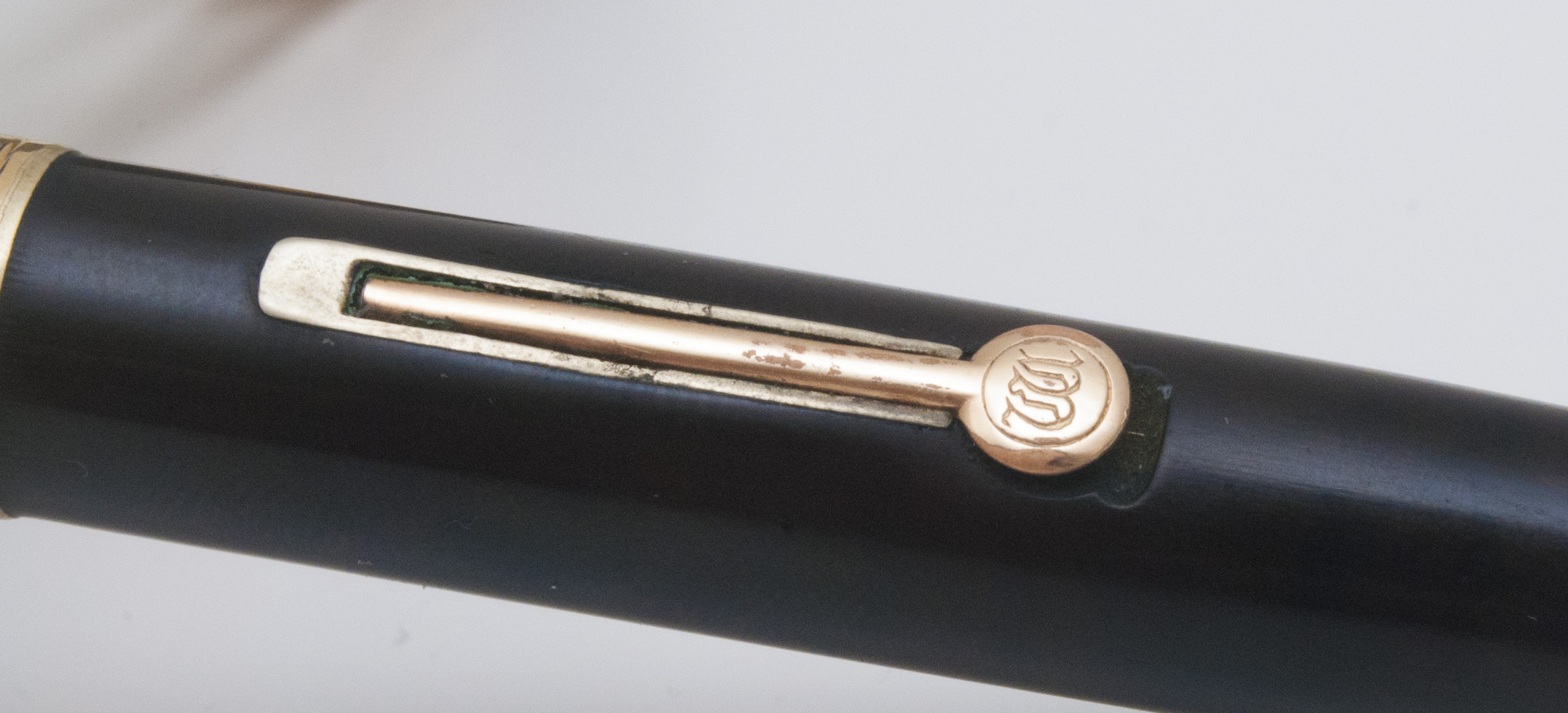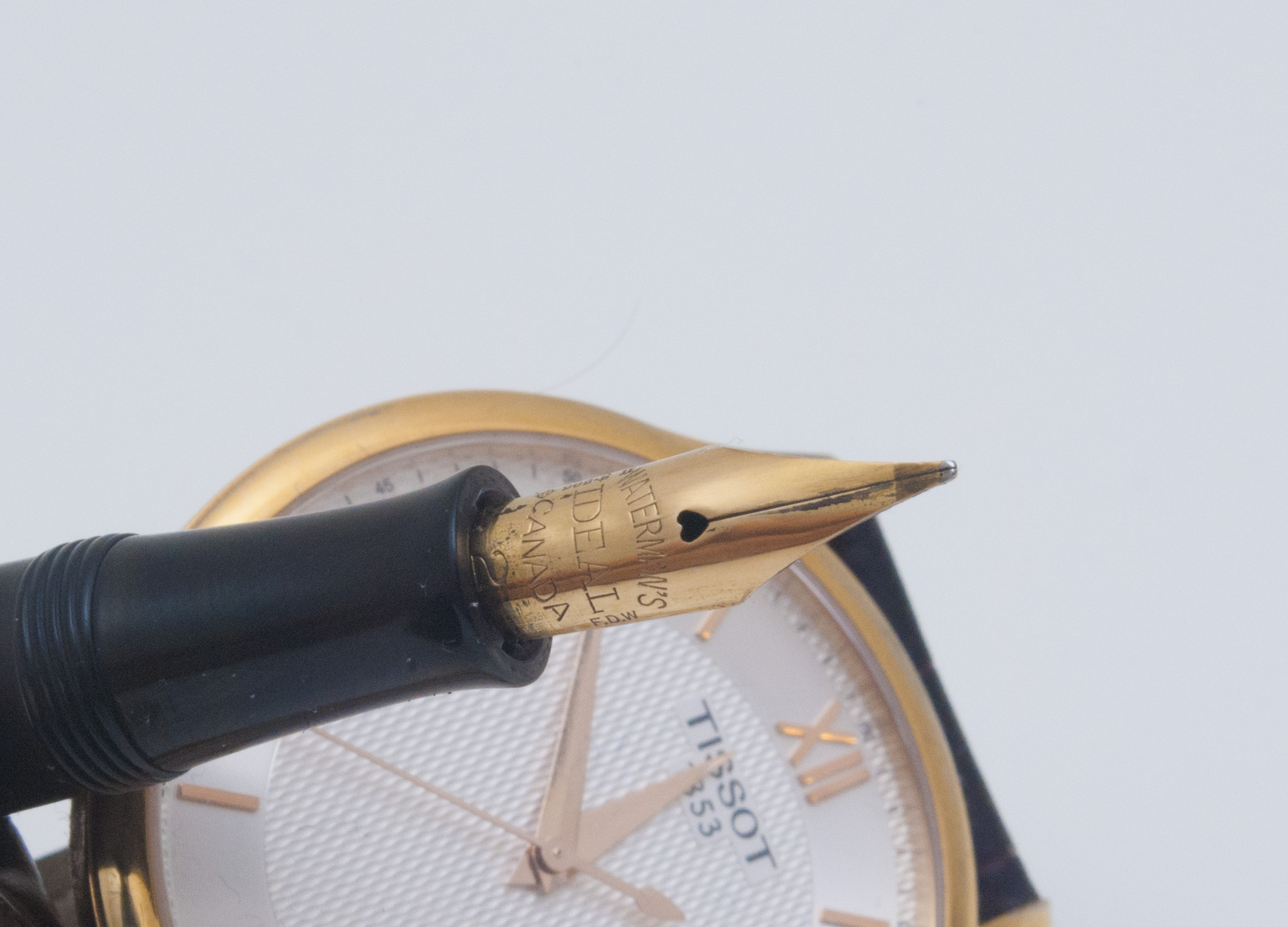 2 Sulla spalla destra F.D.W che sta per Frank D. Waterman, nipote del signor Lewis Edison Waterman passato alla storia per aver trasformato la Waterman in una dei grandi quattro e sulla sinistra fra due oscuri simboli – che spero i più esperti mi aiutino ad identificare, il signor Giorgio è in linea? – le incisioni 14 e 585 che non indicano altro che la purezza dell’oro. La punta, di misura M, sembra essere una kugelspitz; una particolare punta che permette di scrivere su ambo i lati del pennino per ottenere un tratto più fine o più abbondante a piacimento.