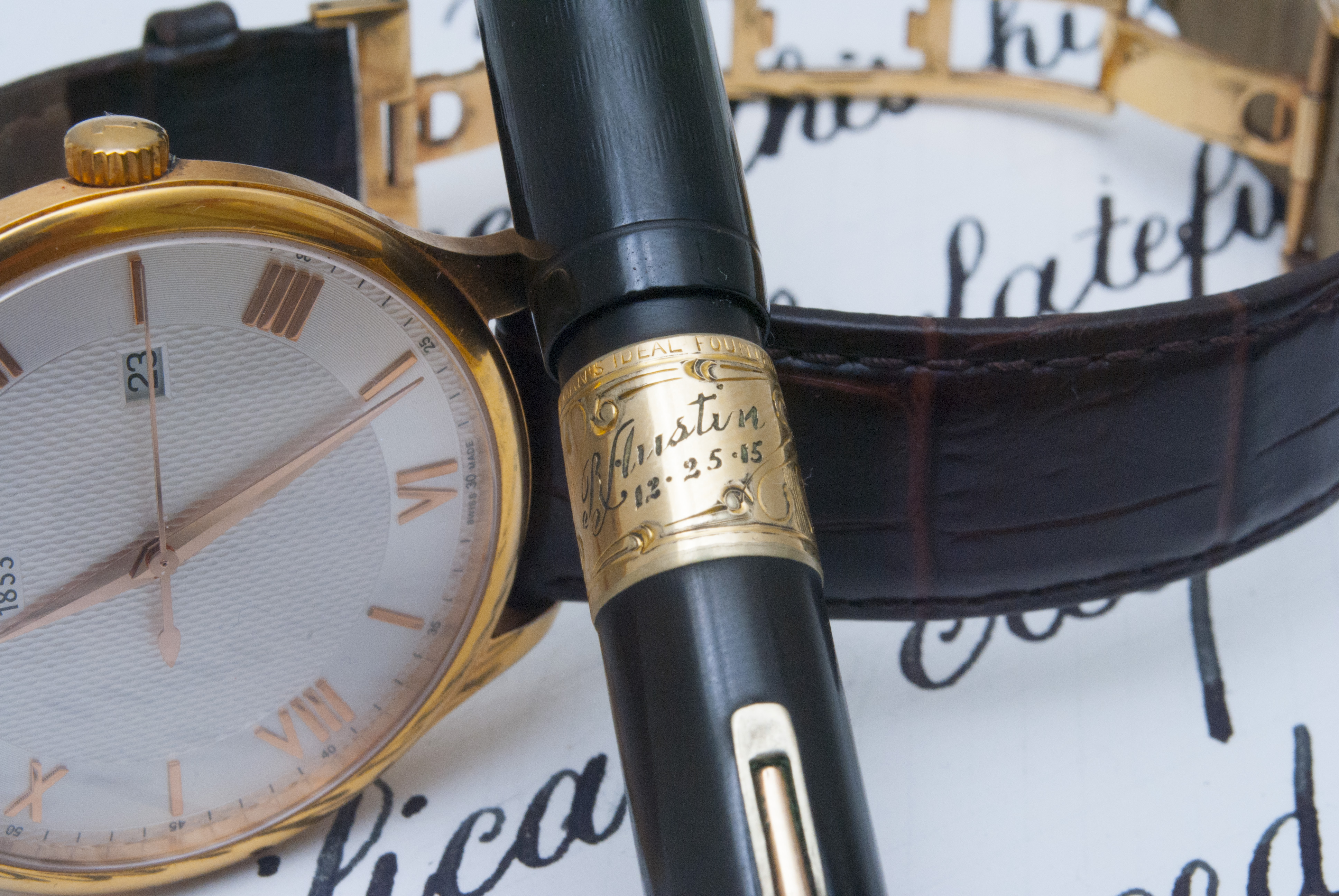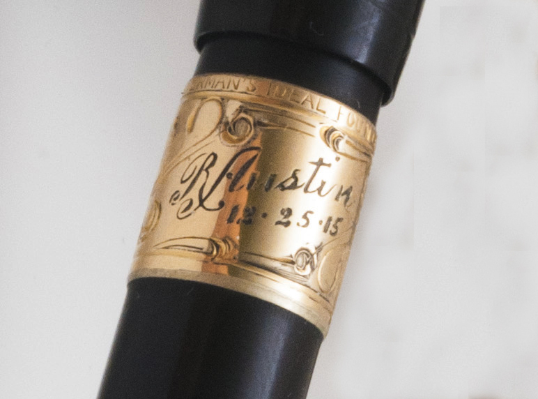 Sul fatto che la penna sia appartenuta ad un certo "R. Austin" non ci piove, che sia un regalo di natale nemmeno. La penna è stata acquistata e regalata per il natale del 1915 come si deduce dall'incisione, proprio questa incisione fa venire qualche dubbio perché in formato americano e non inglese.