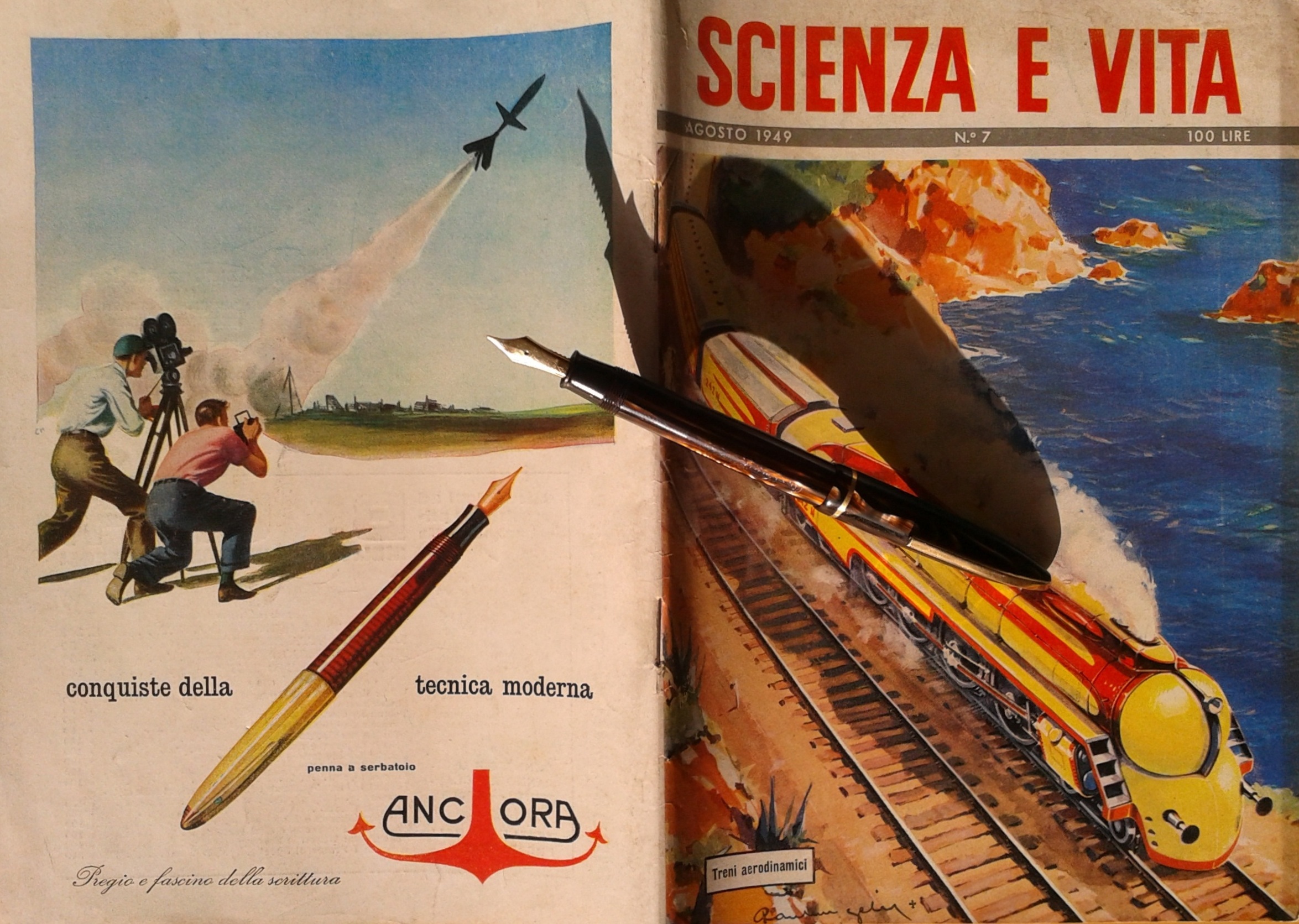 Come accennavamo nell’introduzione, nel primissimo dopoguerra Ancora disegnò una nuova penna sigariforme: la stilografica venne declinata in due classi (“Lusso” ed economica) in ragione del sistema di caricamento (a pistone, in celluloide semitrasparente, e a levetta, in celluloide opaca).