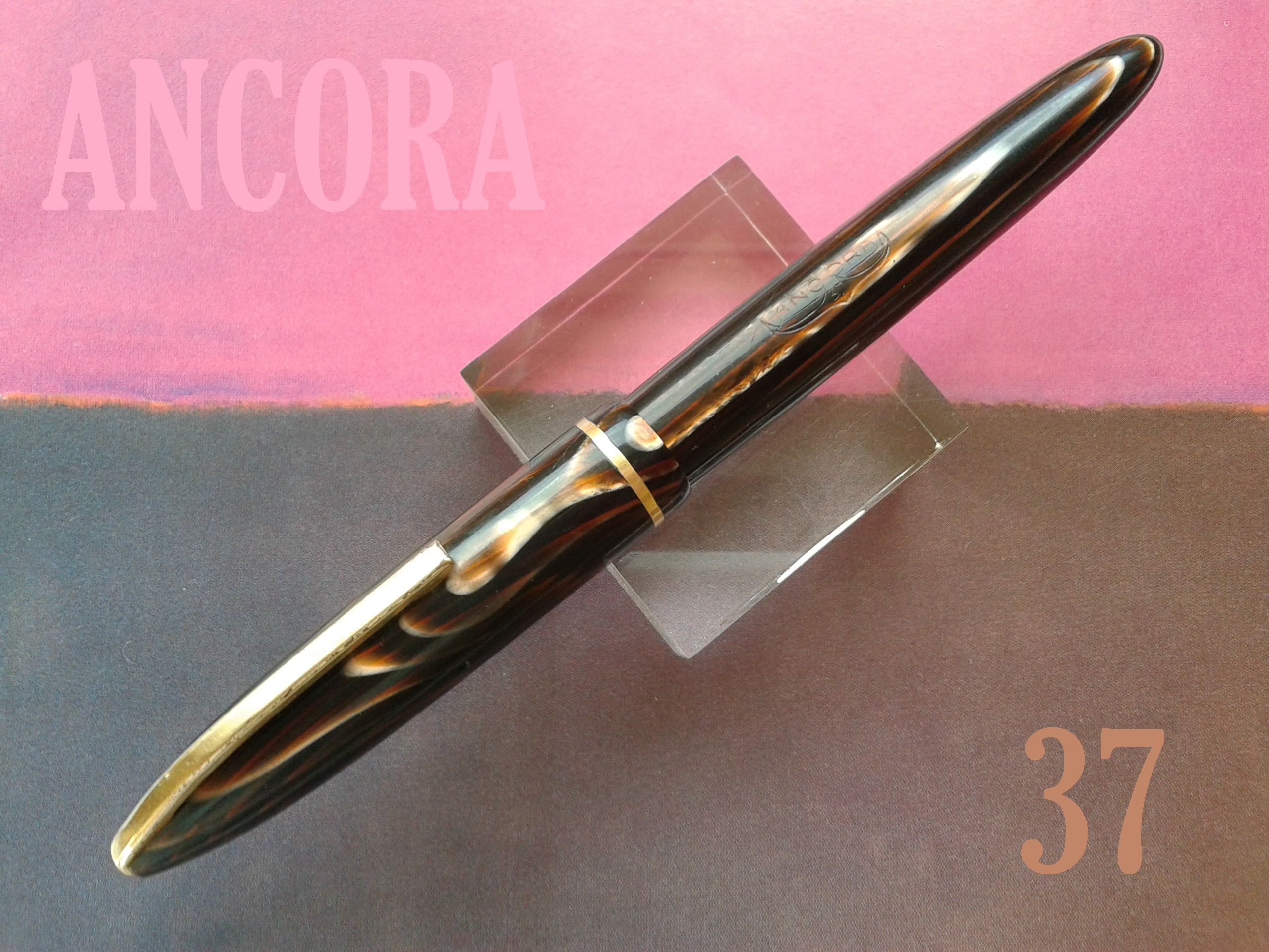ANCORA 37 in celluloide arco marrone tornita da barra piena, parti metalliche a vista placcate oro, pennino originale Ancora in oro 14 carati, caricamento a leva, produzione Italia fine anni 1940.