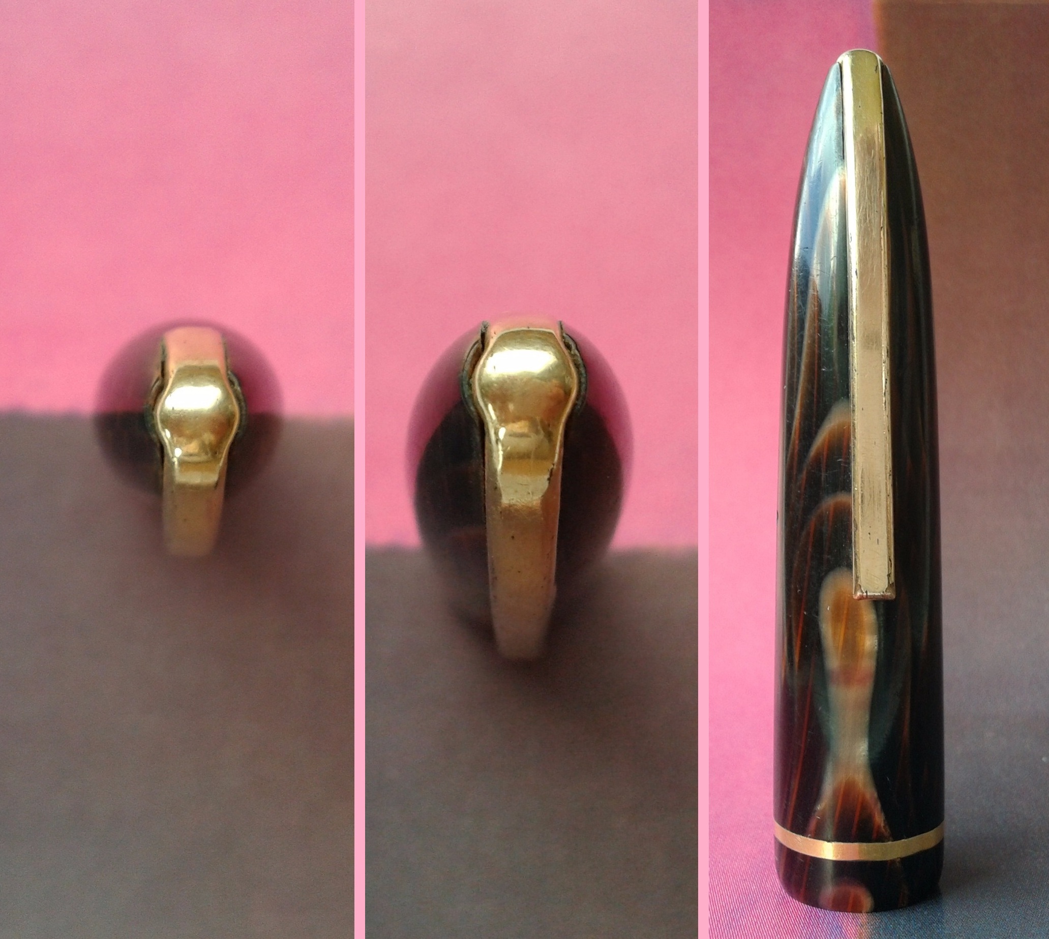 Il fermaglio avvolgente, decisamente scenografico, è chiaramente ispirato a quello della Sheaffer Balance Defender del 1940 (il cui brevetto di clip military “passante” si può consultare sul Wiki): al contrario del modello americano, tuttavia, esso rimane rigorosamente rettangolare per tutto il suo sviluppo lineare, per allargarsi leggermente soltanto sulla sommità, venendo a formare una splendente cupolina.