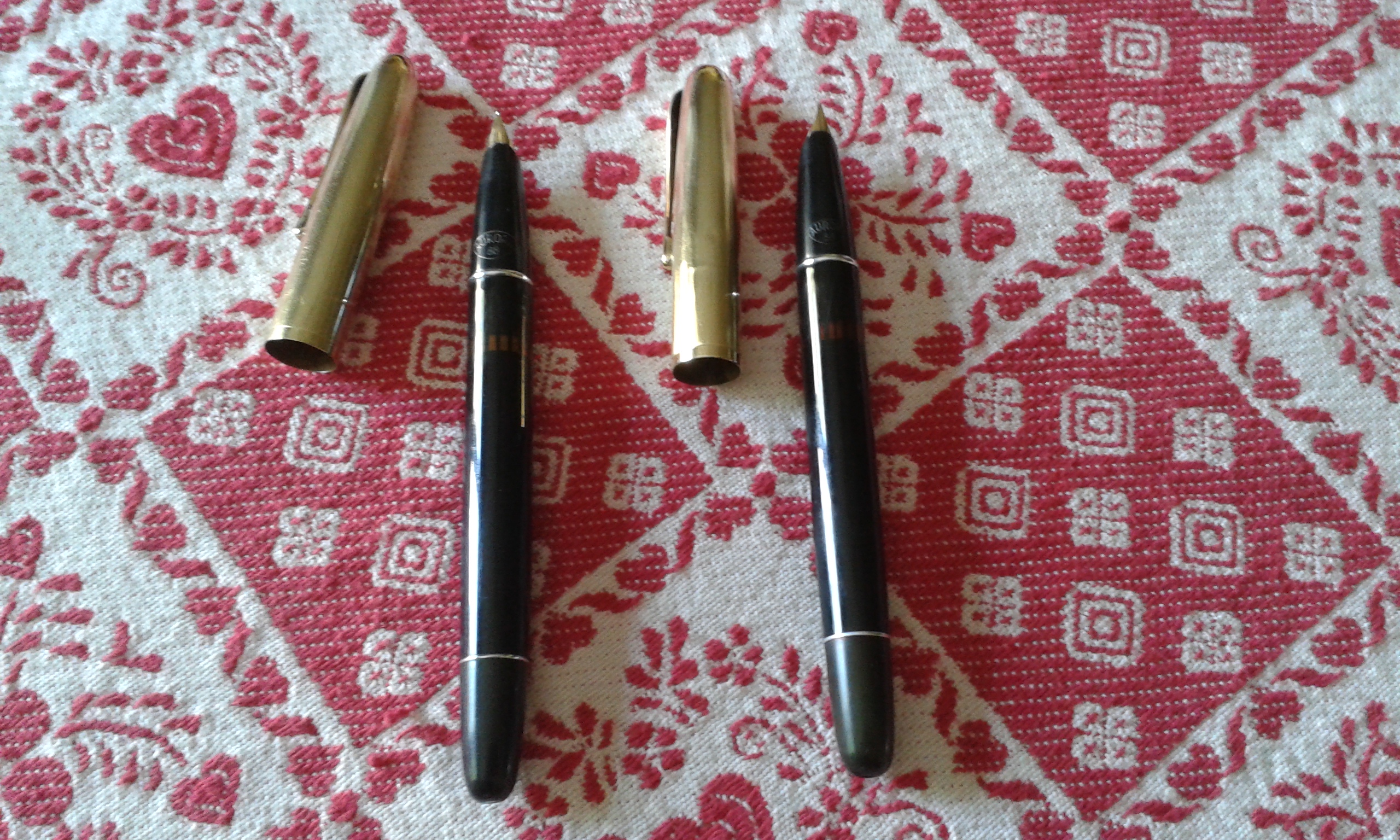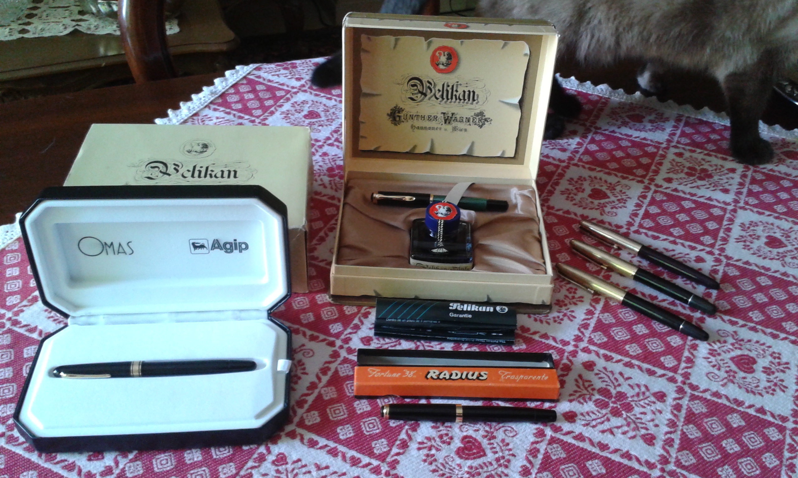 Eccomi a presentarvi le penne del mese di agosto, stilografica Omass 555 s, nuova con la sua scatola comprensiva di istruzioni per l'uso e garanzia; Pelikan M400 "made W. Germany", nuova con scatola, contro scatola e garanzia (sicuramente una parure, mancante della biro); stilografica Radius Fortuna 38, nuova mai inchiostrata con la sua scatola e foglietto illustrativo, somiglianza sconcertante con le Pelikan della serie "M"; due immancabili Aurora 88 prima serie; Parker 51 color Burgundy in buone condizioni.