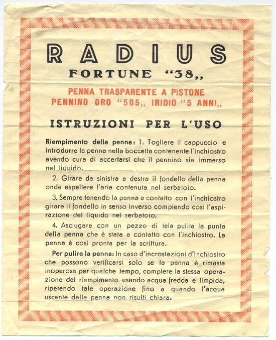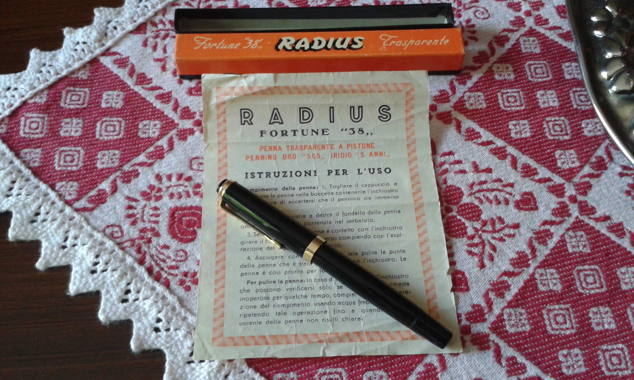 Ecco delle foto per WIKI della Radius Fortuna 38 (clone Pelikan?) e delle sue istruzione per l'uso. Le foto non sono il massimo, ma non ho una fotocamera adatta allo scopo, spero di contribuire lo stesso al progetto.