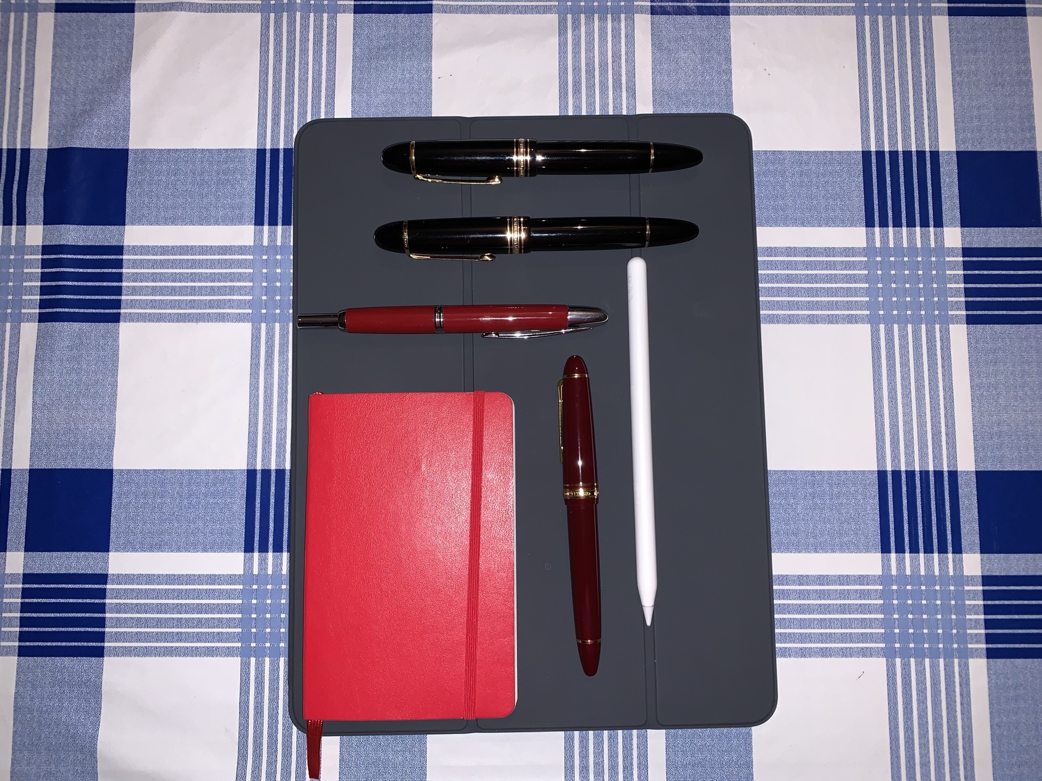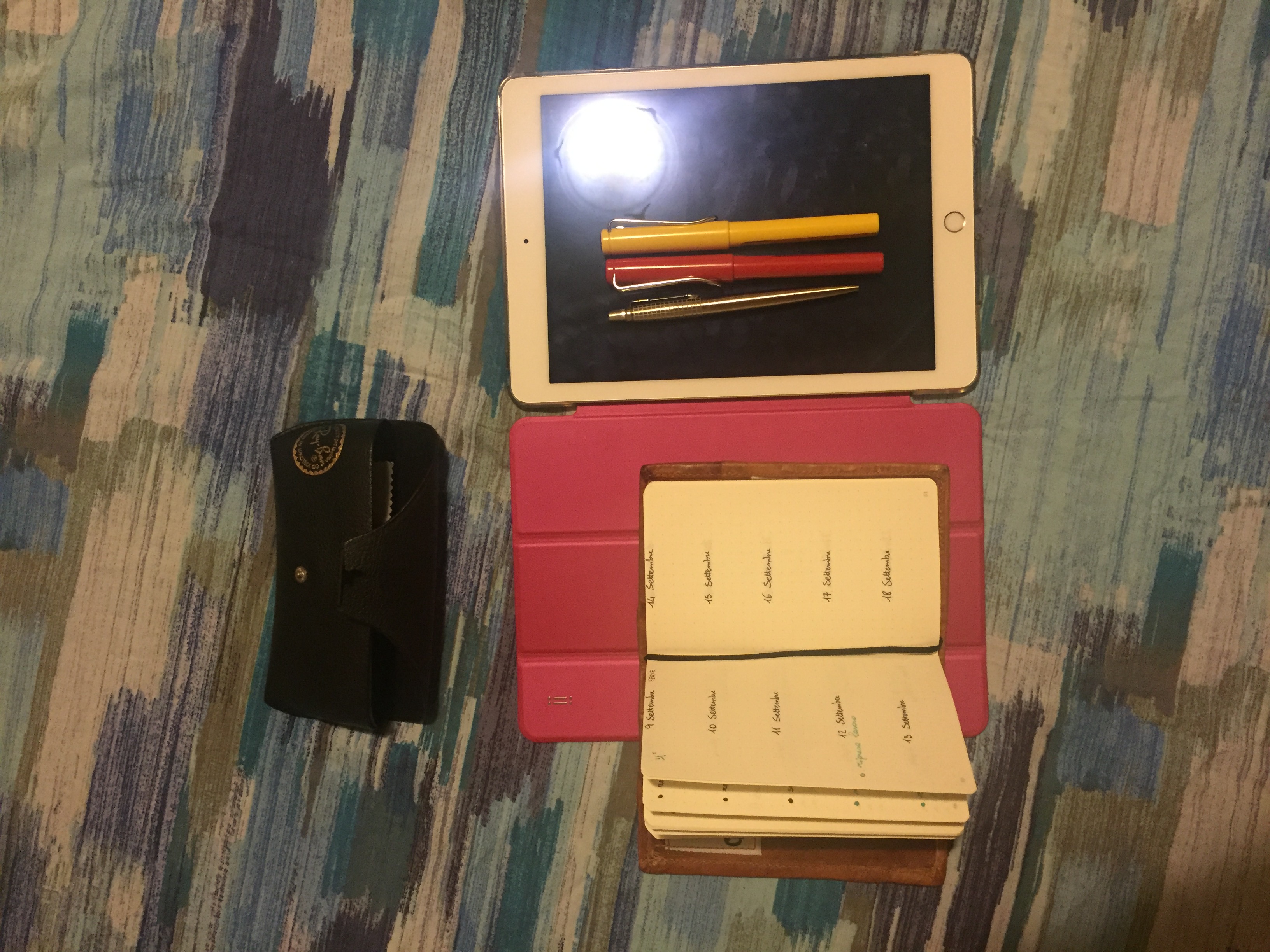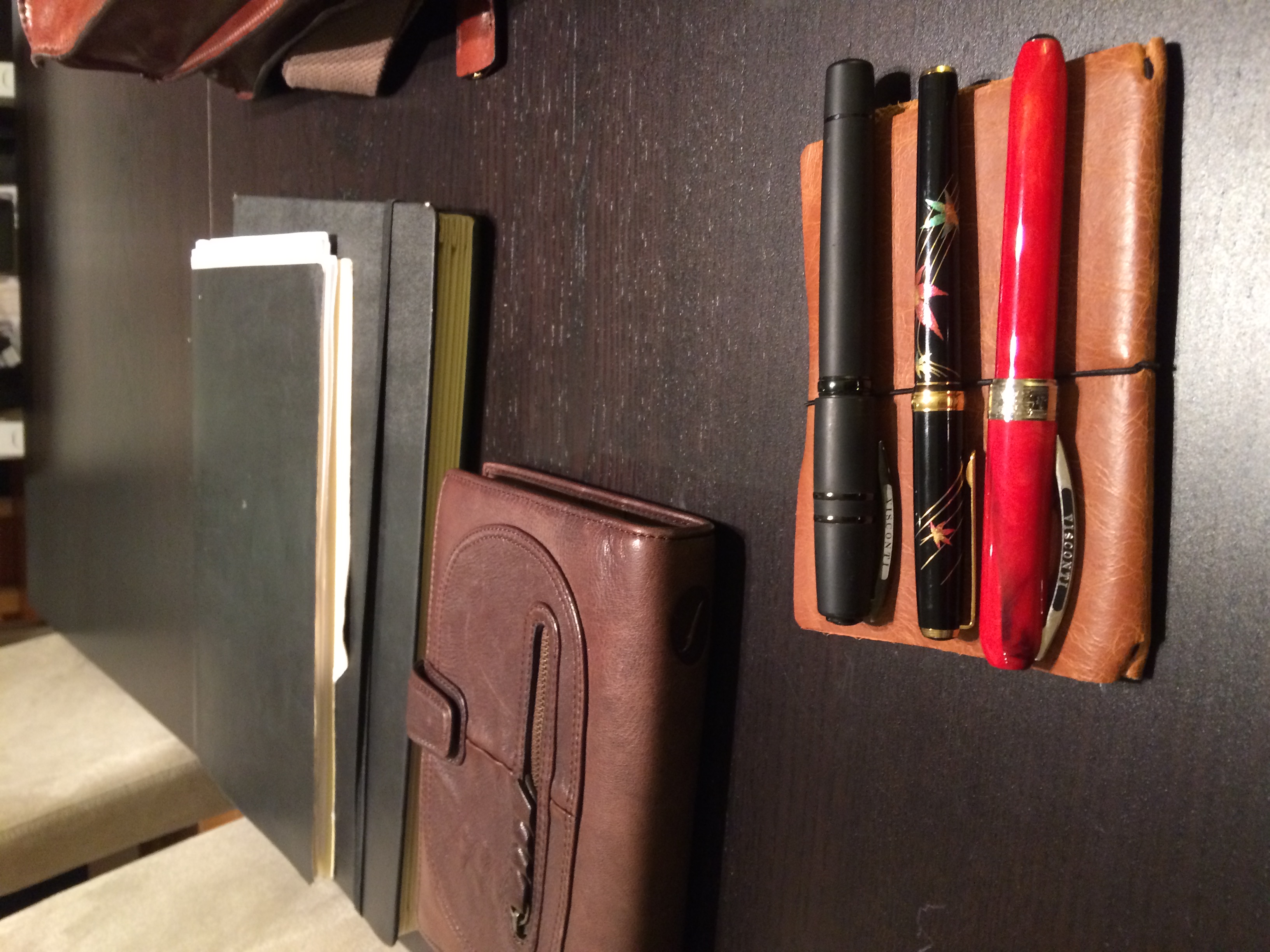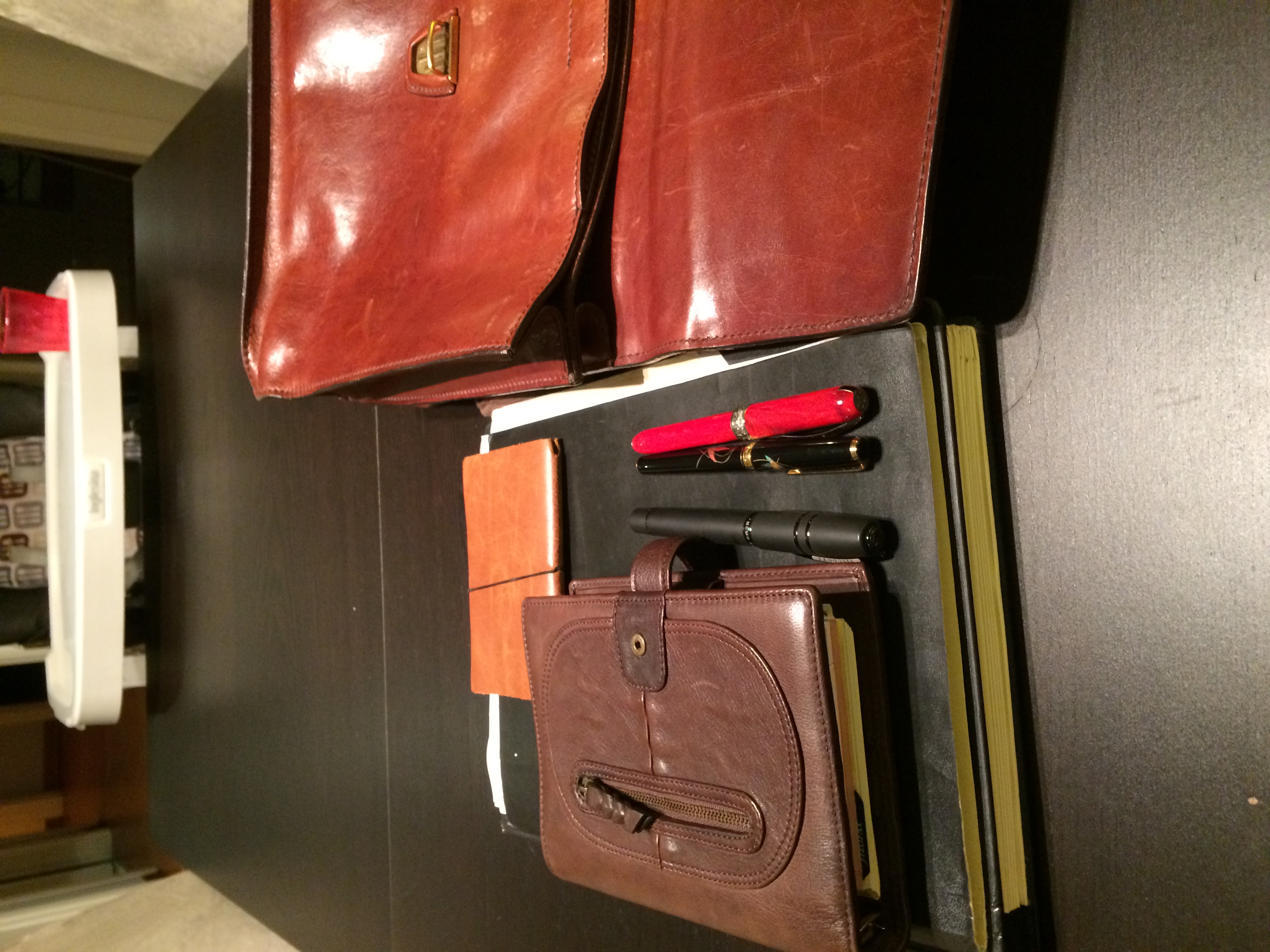 Per quanto riguarda i supporti e la carta mi porto dietro una organizer della filofax (modello siena) , un passport della midori ( la carta è midori mentre l'astuccio è tarocco comprato in baia.) due pezzi moleskine, una carpetta nera e un sottobraccio a soffietto. Per quanto mi riguarda la vera fortuna non è quella di possedere questi oggetti, ma la possibilità di usarli quotidianamente.