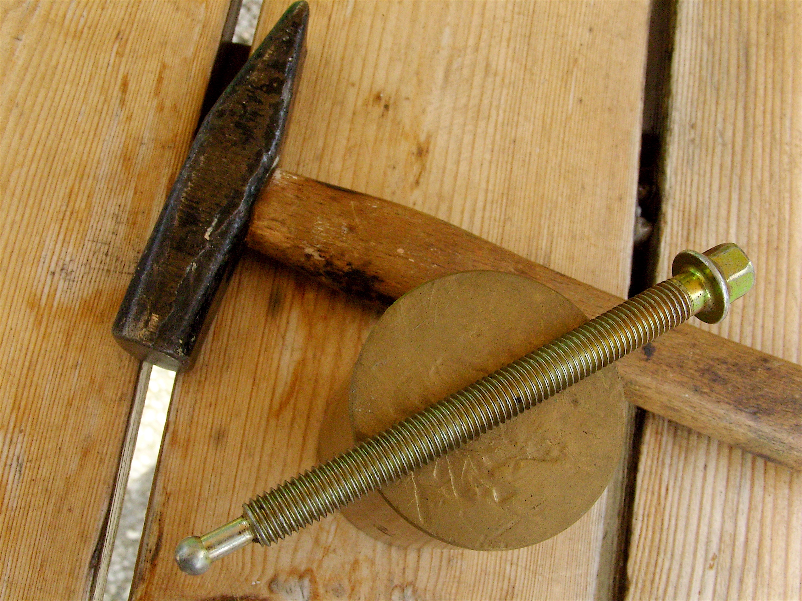 Comunque sia qualcosa di analogo può essere riprodotto e vi assicuro che funziona benissimo, abbinato ad un martellino ed un piano di contrasto totalmente rigido. Quello che si vede e che utilizzo è un cilindro d'ottone. L'attrezzo funziona particolarmente bene perché consente di copiare molto bene la curvatura del pennino, limitando al minimo la necessità di batterlo: la malleabilità dell'oro infatti tende a farlo allagare e se si esagera sono problemi.