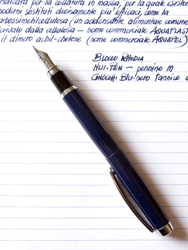 Subito dopo l’apertura della bottiglia ho avvertito un distinto odore di fenolo, similissimo a quello che sentivo da bambino quando caricavo la mia stilografica con l’inchiostro comprato alla cartoleria sotto casa, e che sento ancora oggi in alcune tempere all’uovo. Il travaso, in una boccetta vuota Pelikan 4001, è stato effettuato con una grossa siringa, che, per riempire il nuovo recipiente, ha dovuto essere caricata con 35 ml. di liquido blu. Poi ho siringato una vecchia cartuccia recuperata, sempre Pelikan. Il minuto circa di attesa, per trovare una cartuccia adatta, ha leggermente bloccato il pistone della siringa, ma è bastata una leggera forzatura per sbloccare il tutto. Il successivo lavaggio in acqua non ha evidenziato residui polverosi in sospensione, il che fa ben sperare per la salute della penna che ha effettuato il test, che userò ancora un poco. In caso di inchiostri potenzialmente problematici, come questo, uso sempre una penna sacrificabile; a tal fine ho varie cinesi, alcune Pelikan Primapenna, ed una Niji, tutte perfette. In questo caso ho scelto la Niji, dotata di pennino medio e di un ottimo alimentatore che le garantisce un flusso medio-abbondante, che a me piace parecchio.