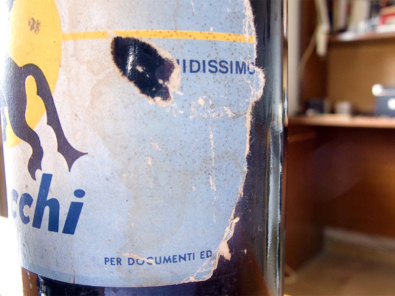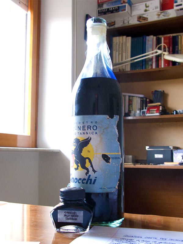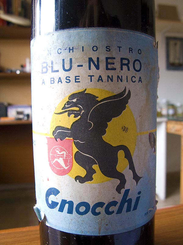 Sembra una bottiglia di vino, da circa 1 litro di capacità, chiusa con tappo in sughero, non particolarmente compresso all’interno del collo, ma a tenuta, di facile estrazione: per l’apertura ho usato una grossa vite (che ho manovrato a mano), perché non avevo a disposizione un cavatappi. L’etichetta recita: “Gnocchi - Inchiostro blu-nero a base tannica” e, sul lato destro, in corrispondenza di uno strappo, “…idissimo” che potrebbe stare per “nitidissimo”. Trattandosi di un regalo, il mio amico non mi ha voluto dire il prezzo, ma un’idea più o meno aderente alla realtà possiamo farcela dando un’occhiata ai vari siti di aste.