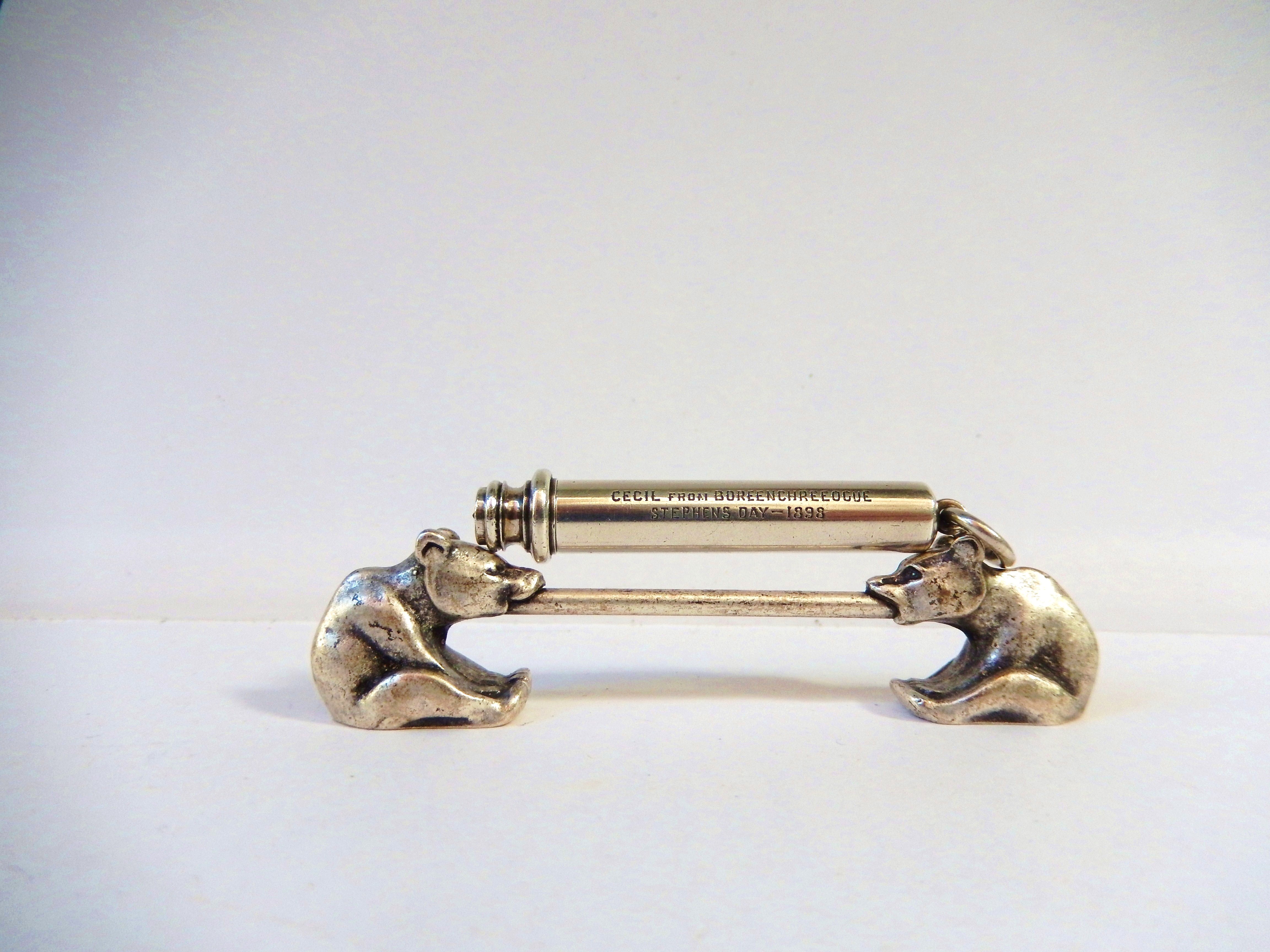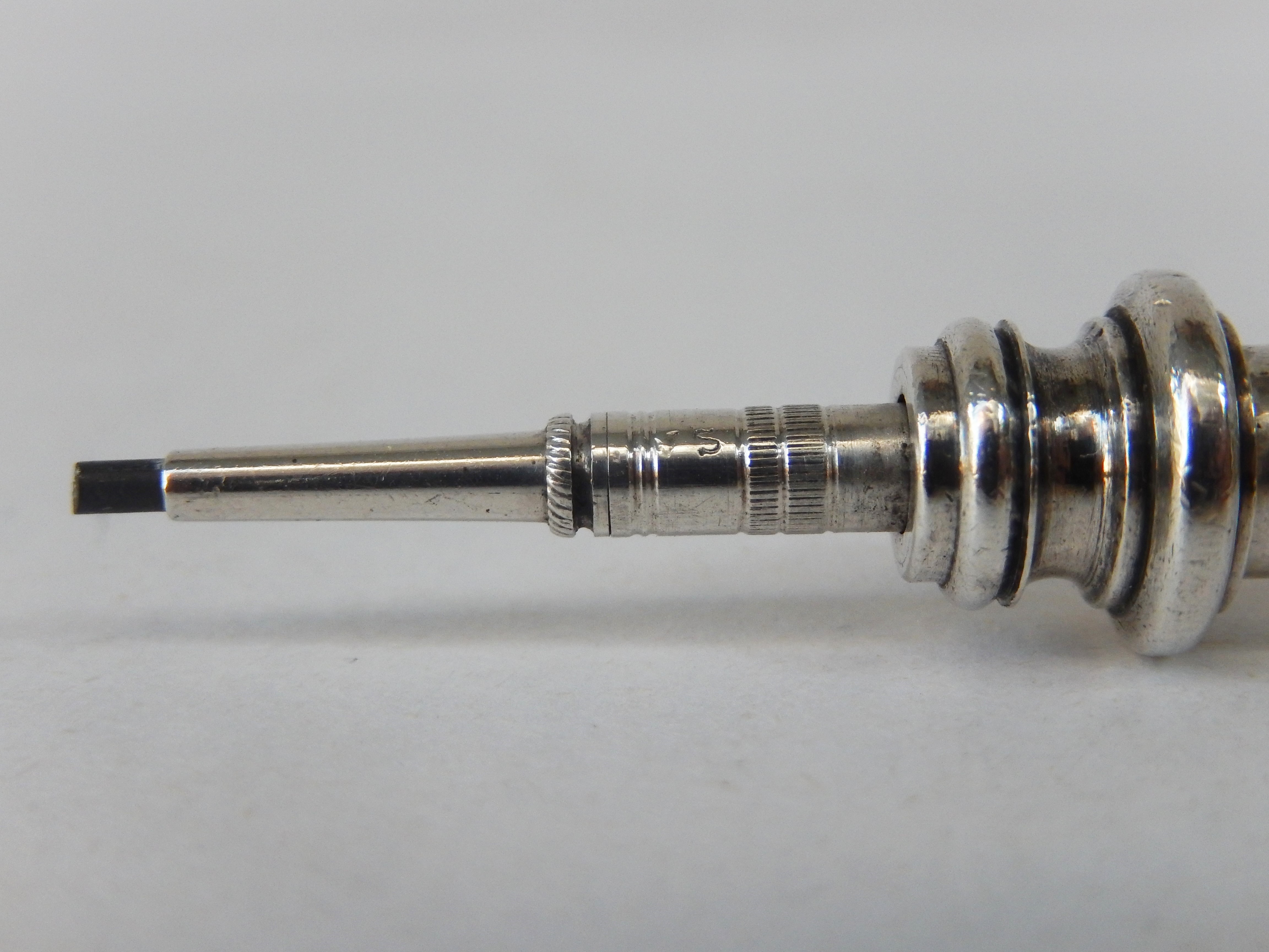 Questo esemplare si snoda su tre sezioni telescopiche e misura chiuso, escluso l'anellino, appena 5 cm, per distendersi prima fino a 8,3 ed infine, quando è completamente aperto, fino a 13 cm. Il marchio " S. Mordan & Co " è quello in essere dal 1860. Precedentemente andando a ritroso nel tempo si erano susseguiti altri marchi : " S.Mordan & Co Makers ( dal 1845 al 1860 ) - " S. Mordan & Co Makers & Patentees ( dal 1838 al 1845 ) fino all'originario " S.Mordan & Cos Patent ( dal 1823 al
