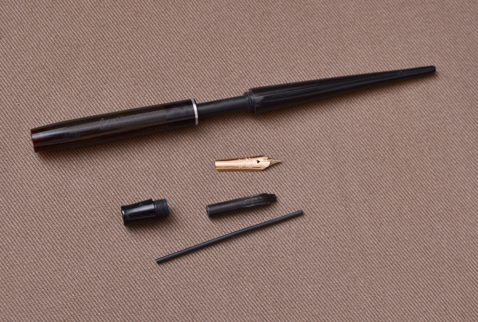 L'unica perplessità è data dall'alimentatore che mi sembra più di una Pelikan che di un Omas, anche se ha due fori, uno per permettere l'innesto del tubicino e l'altro al di sotto del pennino per permettere l'espulsione dell'aria.