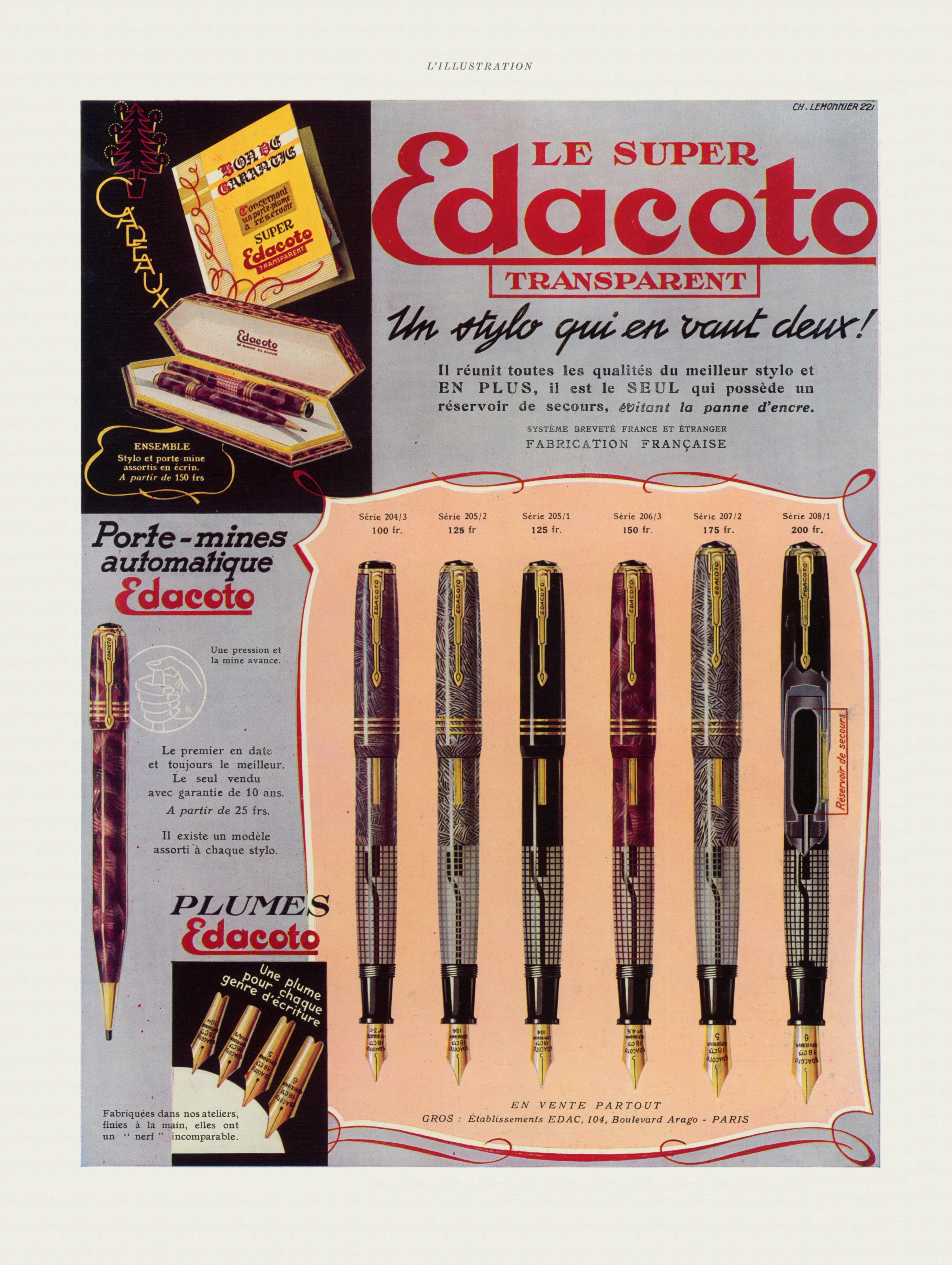 Con lo scoppio della II Guerra Mondiale è certo che nella Francia occupata la produzione sia stata dirottata dal 1941 su modelli meno ricchi e complessi (non trasparenti e con caricamento tradizionale) e che, anche in considerazione del costo elevato, di Super Edacoto 200 (la punta di diamante della Maison francese dopo la fortunata collaborazione con Aurora dell’inizio degli anni ’30) non ne siano state vendute più che tante, e che la penna sia, quindi, relativamente poco comune…