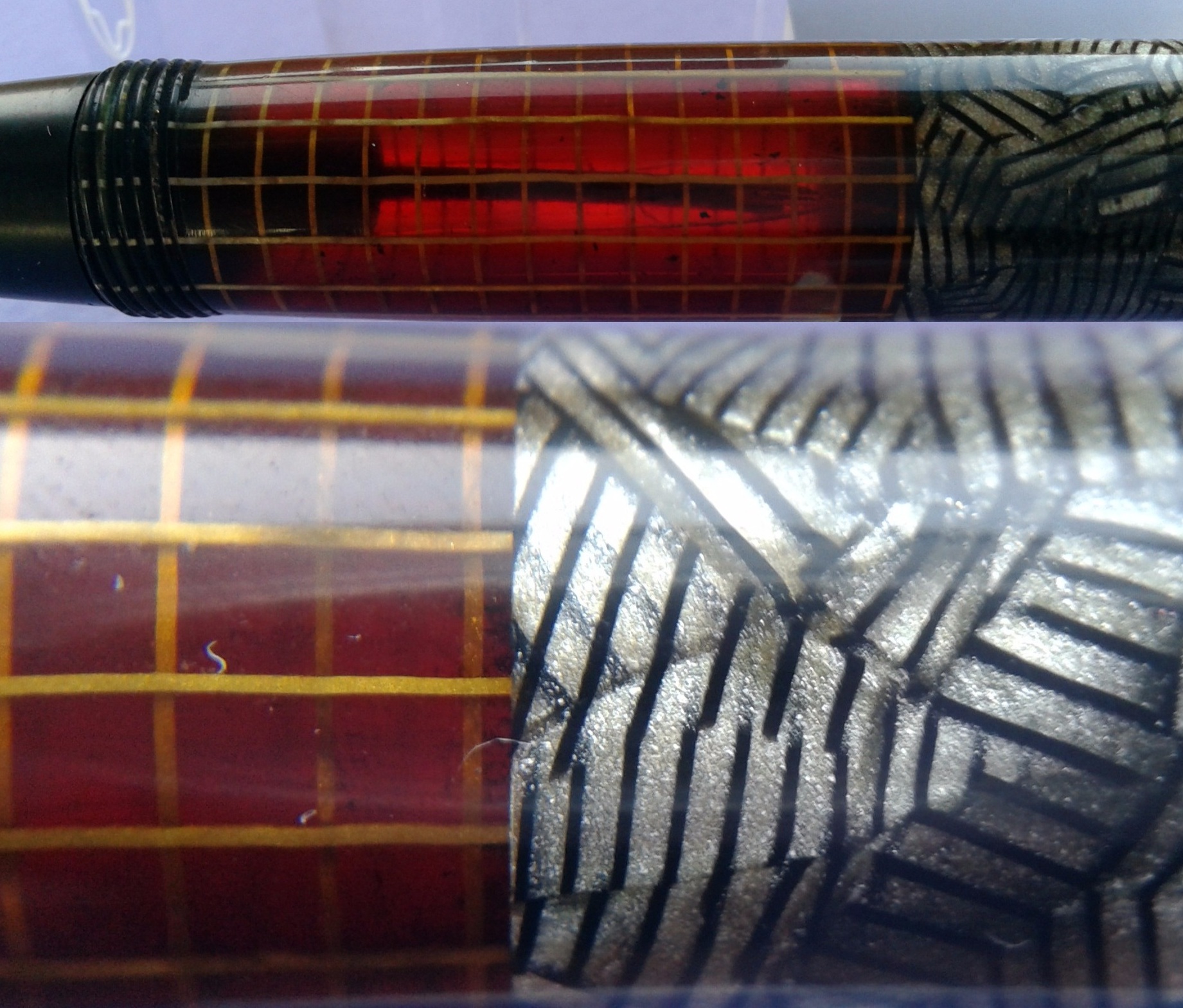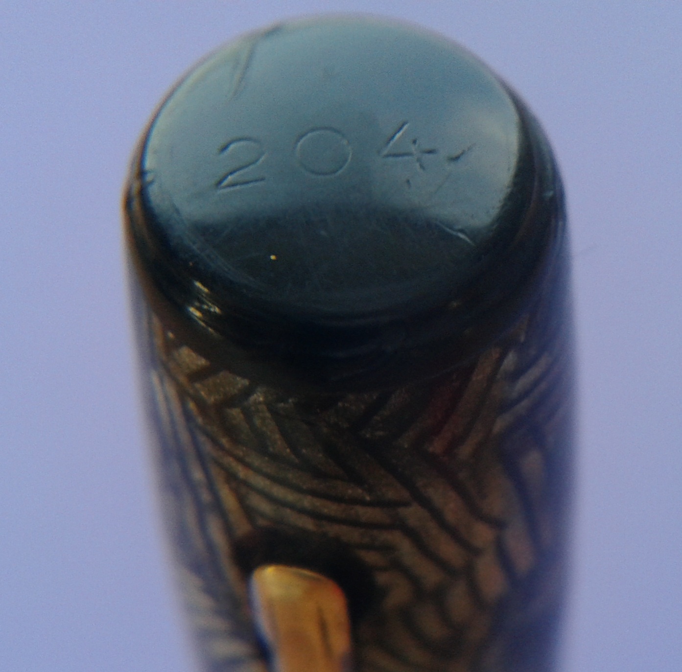 La penna in presentazione, una 204, sembra essere l’unica della linea “Super Trasparente” ad avere il gioiello della testina piatto, a cui risponde all’estremità opposta un fondello similmente decorato: entrambi sono in celluloide nera.