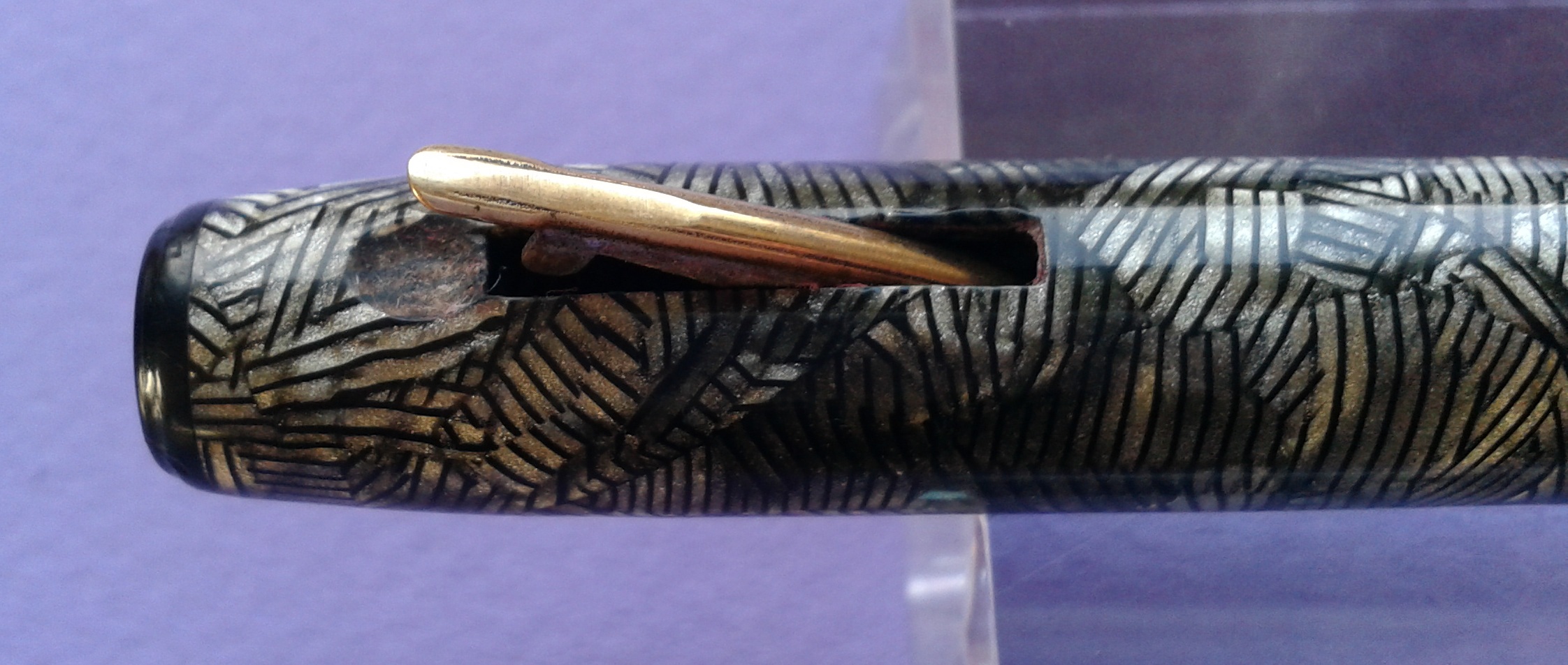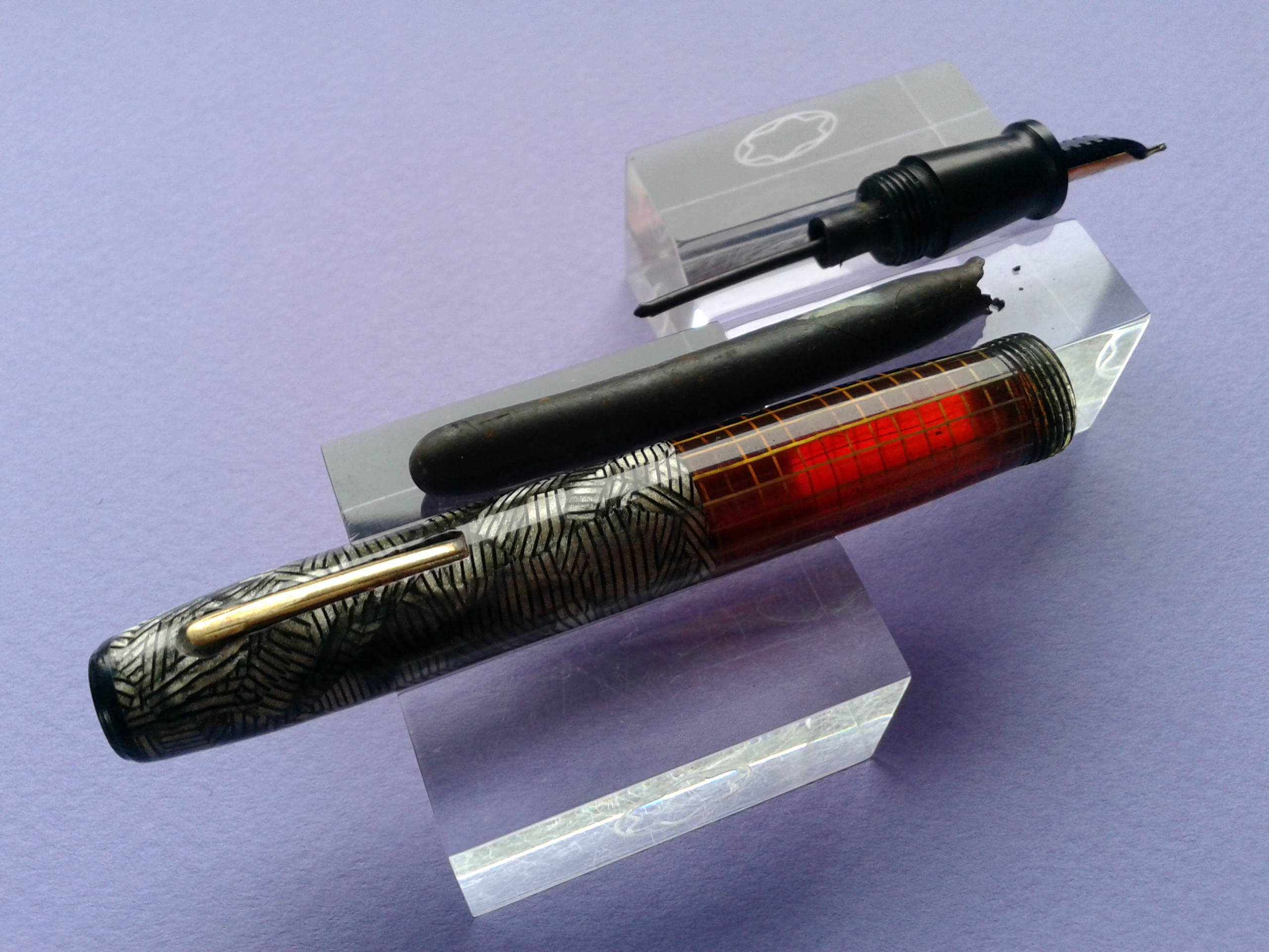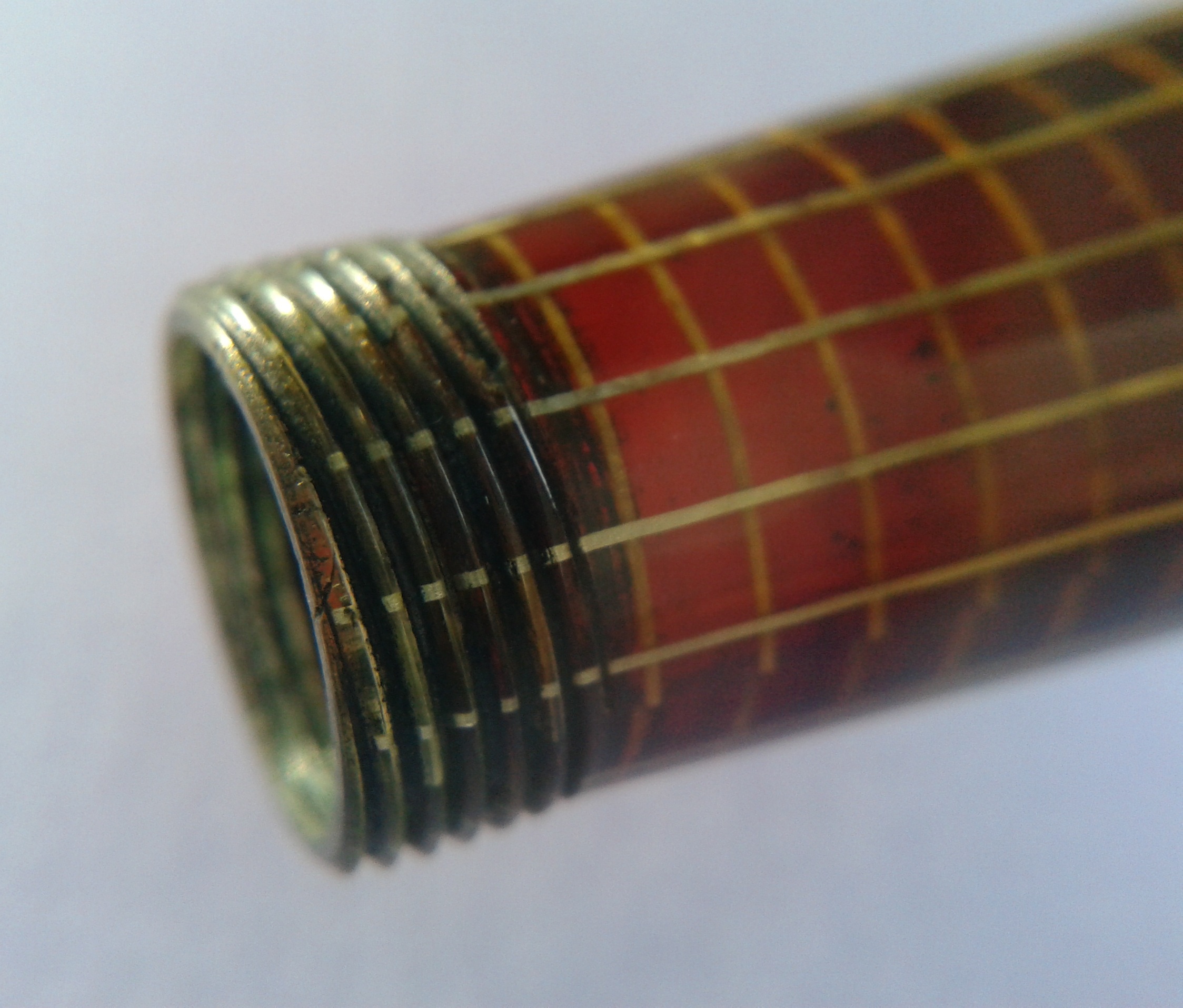 Sull’esemplare in presentazione, tuttavia, tale sistema, già delicato di suo stando alle poche fonti disponibili (come questa, sul forum cugino francese: http://www.stylo-plume.org/viewtopic.php?f=29&t=4032), e dopo il catastrofico salto nel fiume del precedente proprietario ( :mrgreen: ), era stato riconvertito al sistema di caricamento a levetta tradizionale, e così io l’ho trovato: a questo scopo pare che la cannuccia pervia sia stata grossolanamente scorciata.