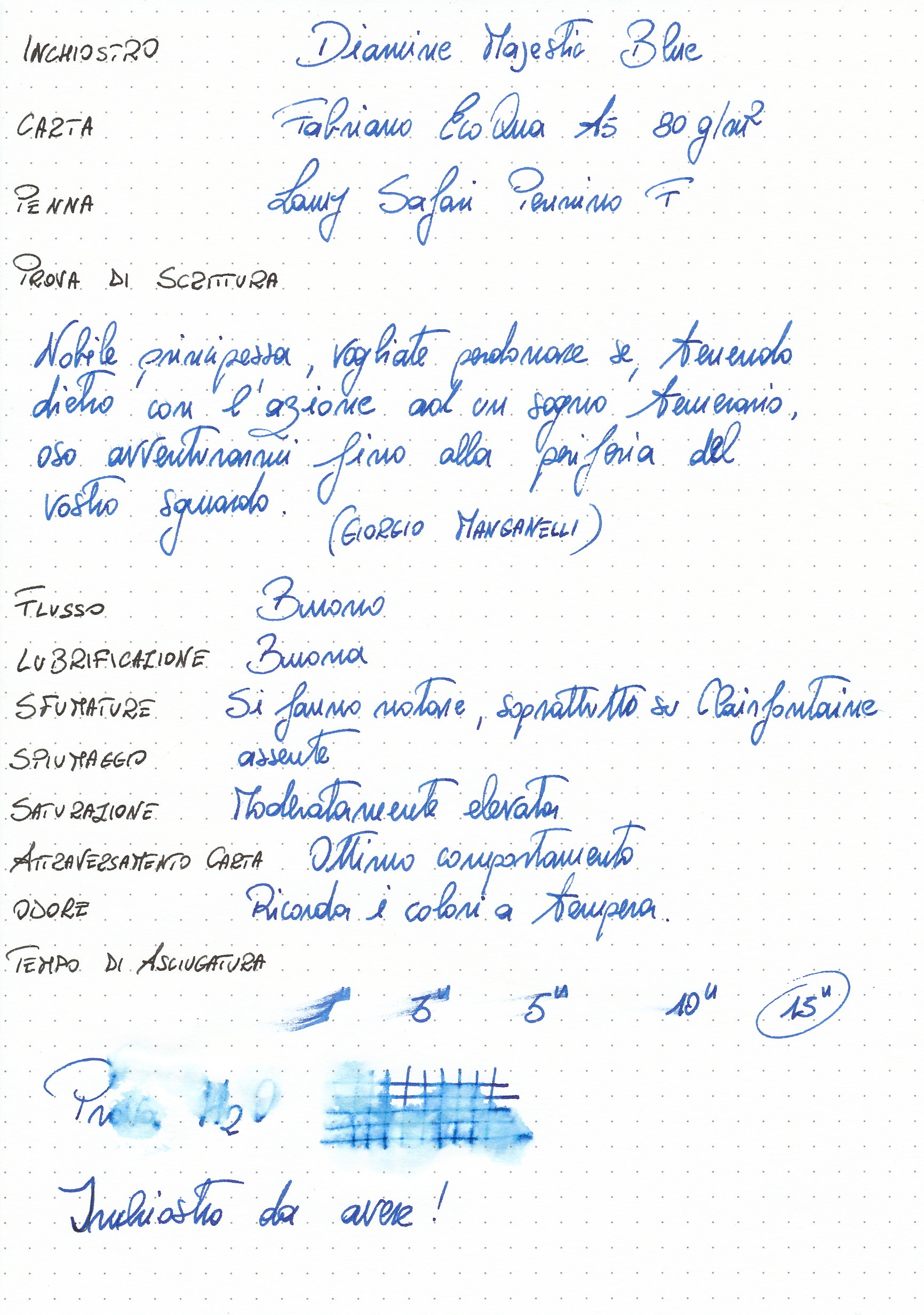 Ha la sgradevole tendenza a seccarsi facilmente nell'alimentatore, ed assai poco sulla carta. Sto cercando di finirlo perché è davvero pessimo in entrambi gli aspetti nonostante un colore per me molto bello. Peccato, ma a me l'inchiostro serve per scrivere, non per macchiarmi le mani o costringermi al risciacquo continuo della penna.