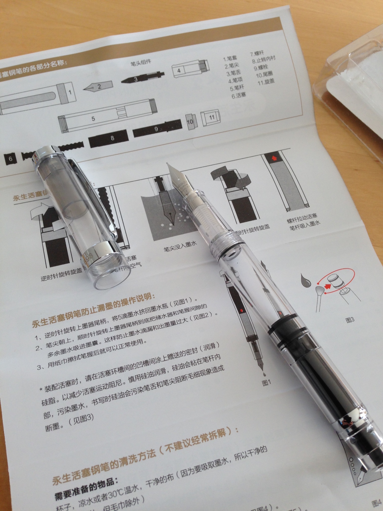 La sto usando da un paio di giorni e ogni giorno mi sorprendono la morbidezza e la scorrevolezza del pennino. Per 20€ ritengo che ne valga veramente la pena: una penna che secondo me è imbattibile per quanto riguarda il rapporto qualità-prezzo (ca. un terzo meno della TWSBI Eco), oltre a rappresentare un'ottima prima scelta per entrare nel mondo delle penne con caricamento a pistone.
