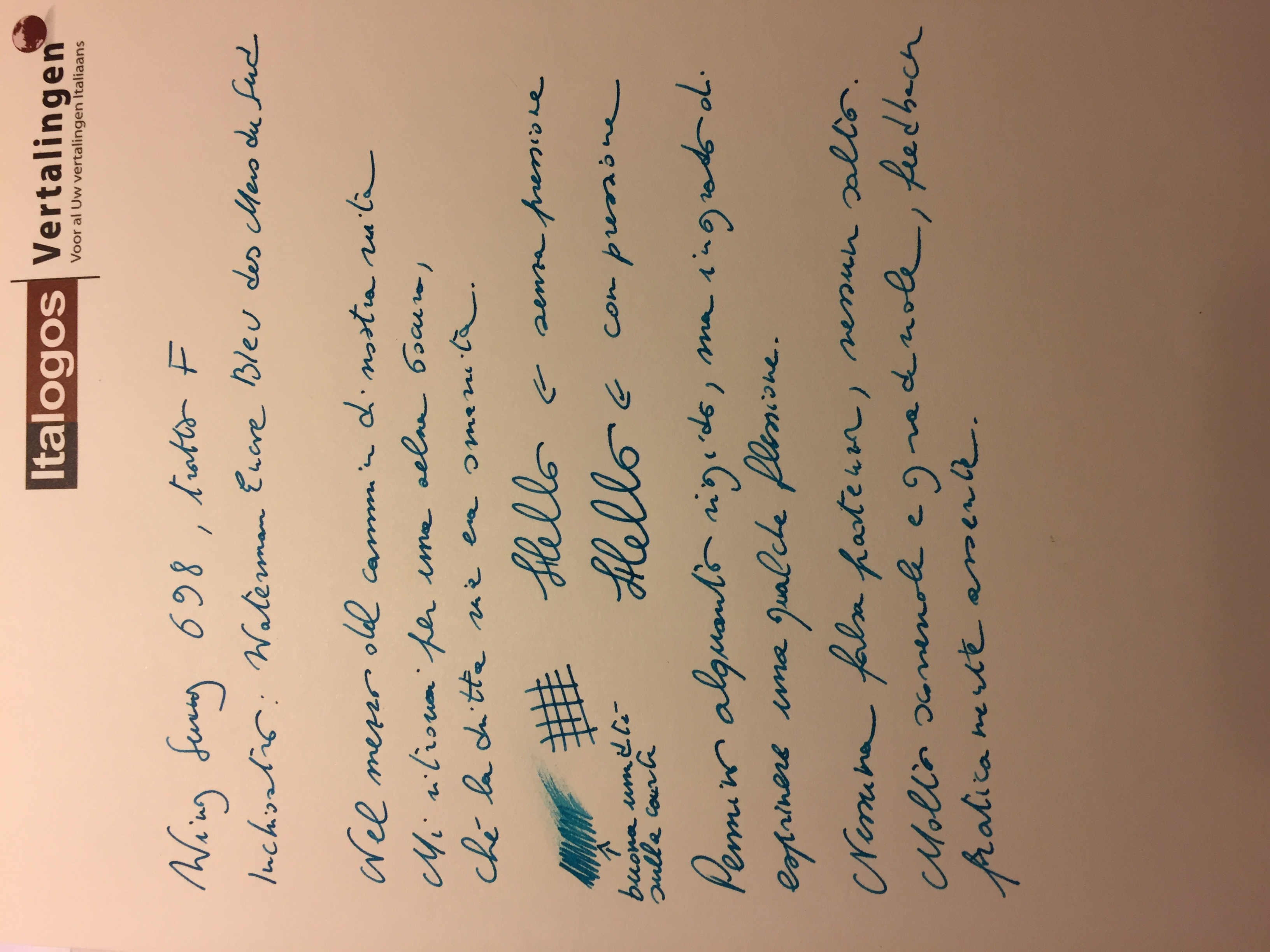 Le impressioni sono veramente ottime per una penna da €20: il pennino è rigido (non c'è da aspettarsi molto altro dall'acciaio), ma riesce ad esprimere una qualche flessione. Quello che mi ha colpito maggiormente è stata tuttavia la scorrevolezza e la fluidità del pennino. Le dimensioni sono comparabili a quelle di una TWSBI Eco: apprezzo però maggiormente il design più affusolato di questa Wing Sung 698. Il bilanciamento è ottimale (io sono solito usare le penne senza il cappuccio calzato), e rispetto alla Eco il peso è minore (24g della WS contro 30g della Eco da non caricate), anche se questo non va a discapito della robustezza. Il flusso è veramente buono, oserei anzi dire che per montare un pennino F, la WS 698 è una penna dal flusso sicuramente generoso.