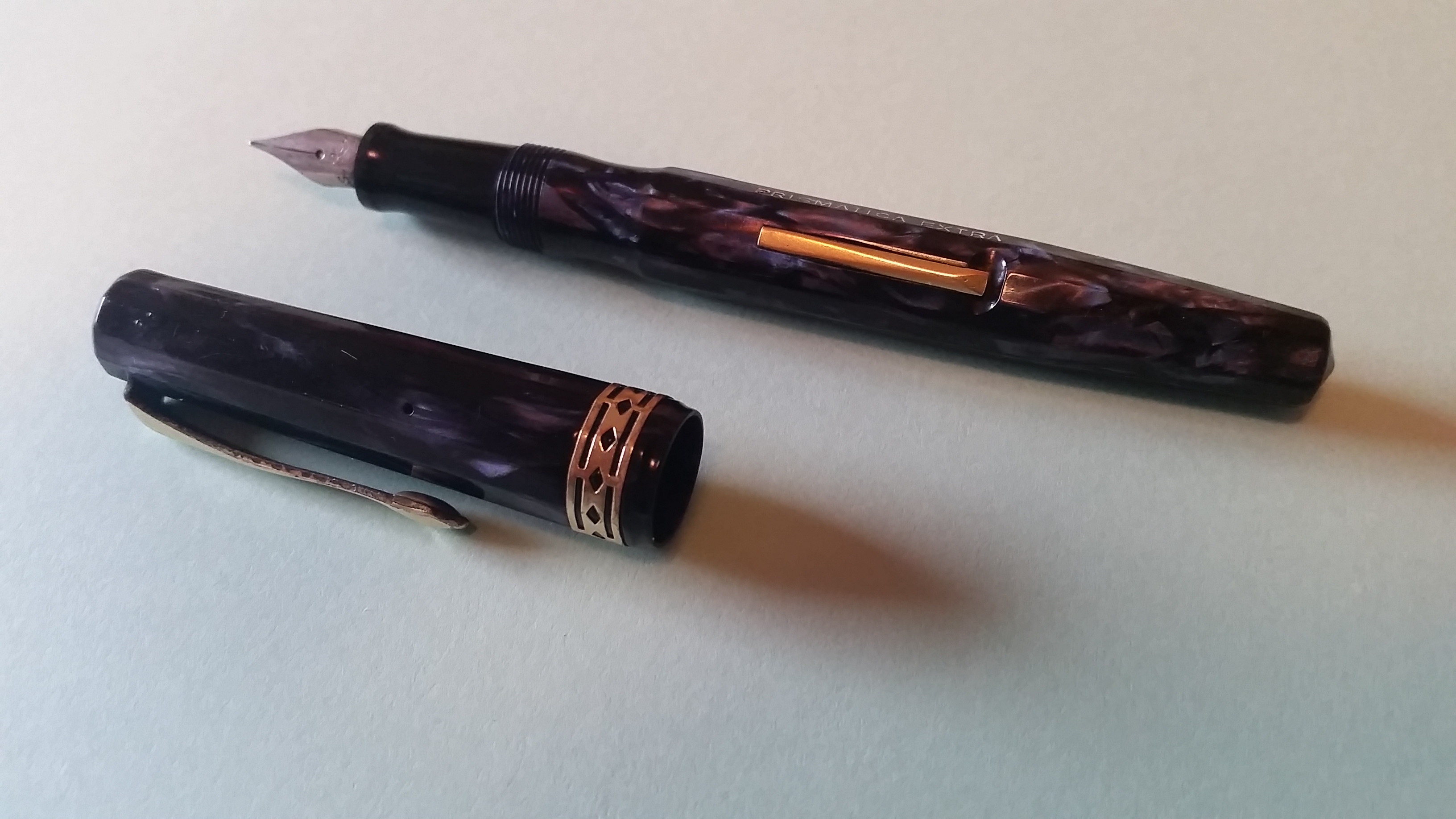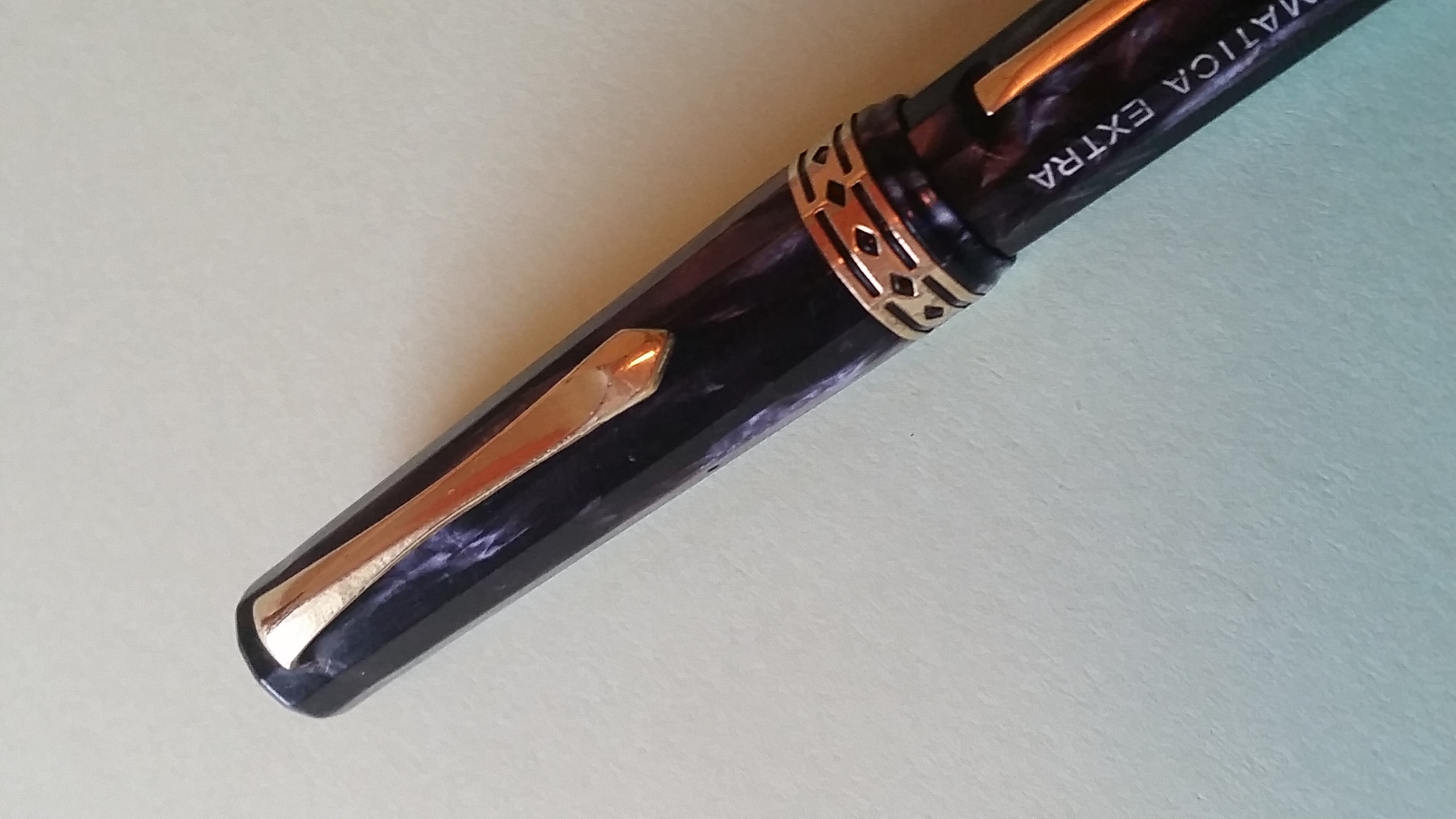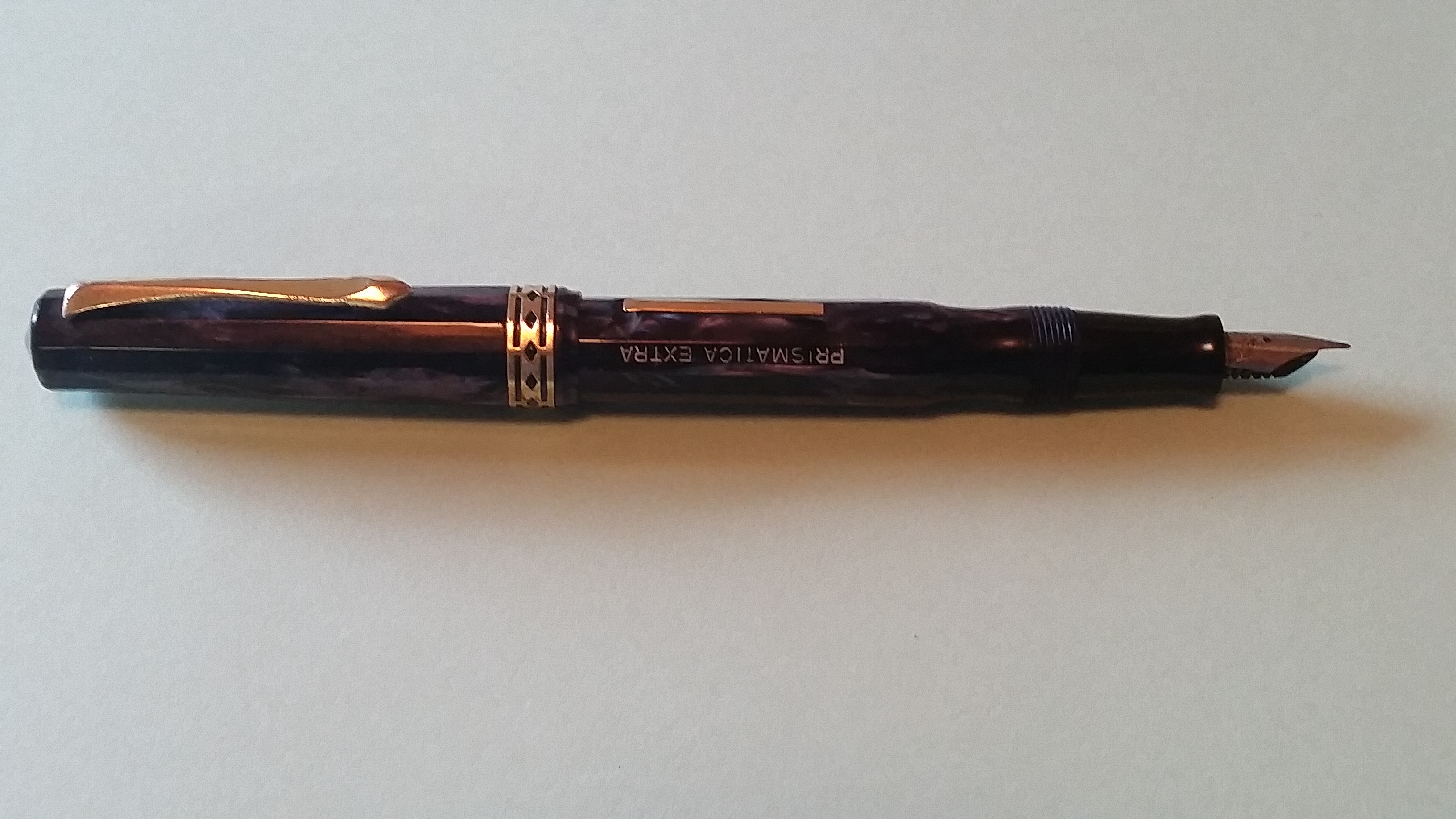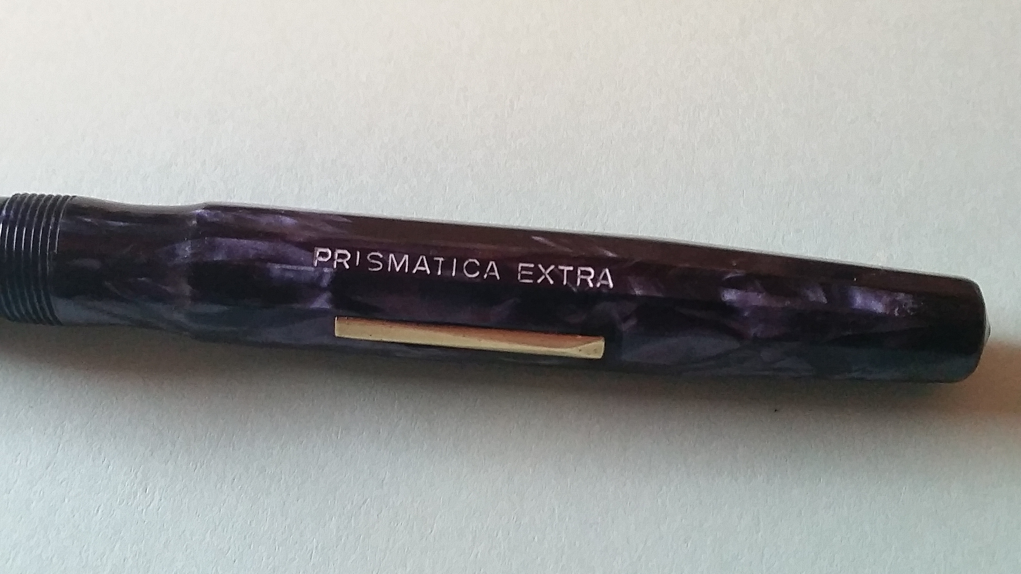 Oggi appena uscito da scuola mi sono fermato ad un mercatino dell'usato e rovistando fra vecchie borse e vasetti di porcellana salta fuori questa penna. Molto rovinata ma con ancora quel riflesso antico la compro per una decina di euro e me la porto a casa. Dopo averla pulita, lucidata e ravvivate le incisioni con l'uni posca, finalmente posso vedere la penna nel suo splendore! L'ho presa in primis perché assomiglia molto alla Doric della Wahl Eversharp, secondo perché mi ricorda due penne della stessa marca (Prismatica Extra, una verde e una rossa sempre marmonizzate) avvistate qualche anno fa, un po' più grandi, scritta sul differente e con la clip stile Omas (con l'anellino girevole). Di un strano blu marmorizzato, questa Prismatica Extra mi ha fatto impazzire! Colore meraviglioso, stile eccentrico ed ergonomia perfetta! Persino la levetta di caricamento è sagomata!!! Da quanto ho letto la Prismatica è una sotto marca della Radius, le cui penne, alcune, sono identiche per forma alla mia. Purtroppo ha un grosso problema, anzi due. Il primo è il pennino non originale, e so che trovarne uno della Prismatica è quasi impossibile. Secondo, il più brutto, è una orribile e pericolosa crepa sulla filettatura del corpo dove si avvita il cappuccio. Volevo provare con la celluloide liquida ma non so come si faccia, e poi ho paura di rovinarla! Qualsiasi consiglio è il benvenuto! Premesso il fatto che adoro questa penna, secondo voi se dovessi inviarla a qualche artigiano ne varrebbe la pena? Vi allego qualche foto!