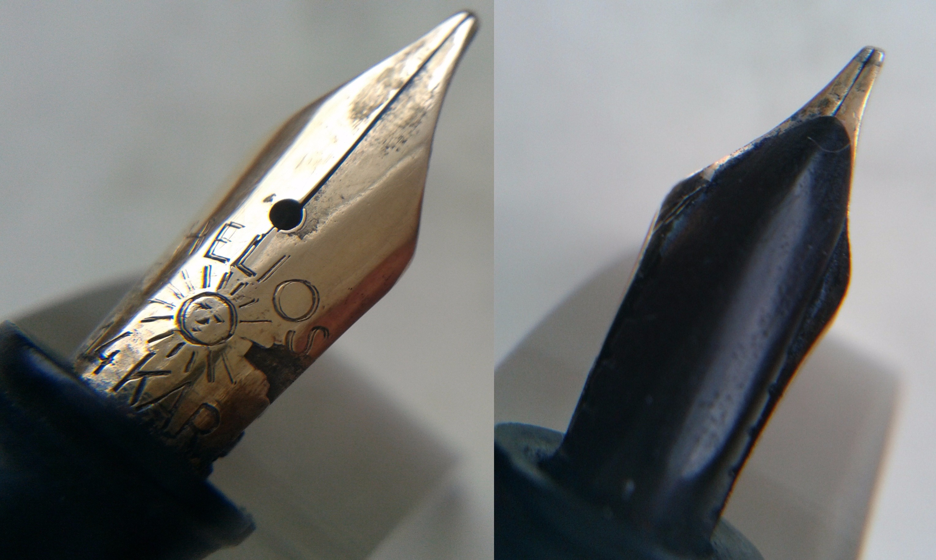 Il pennino, montato su un alimentatore in ebanite del tipo ad “albero di natale” (come nelle Parker Duofold),
