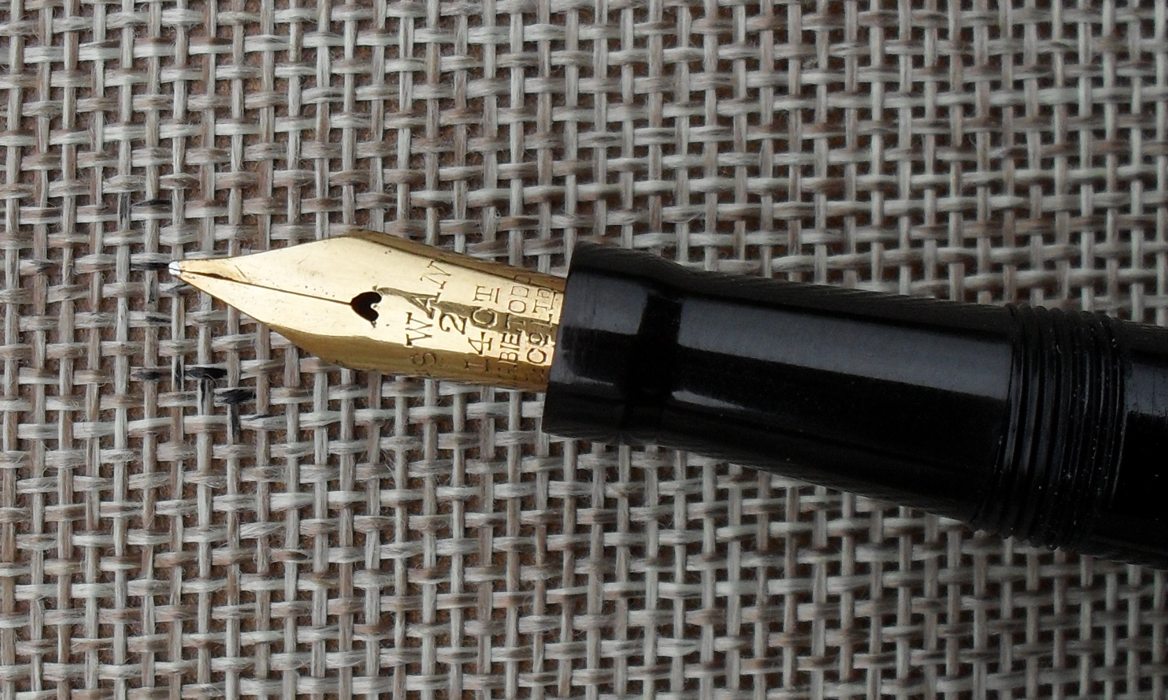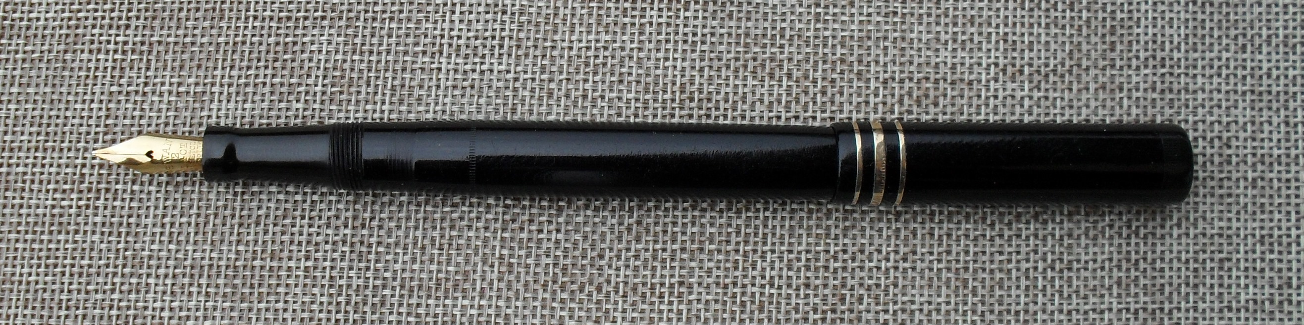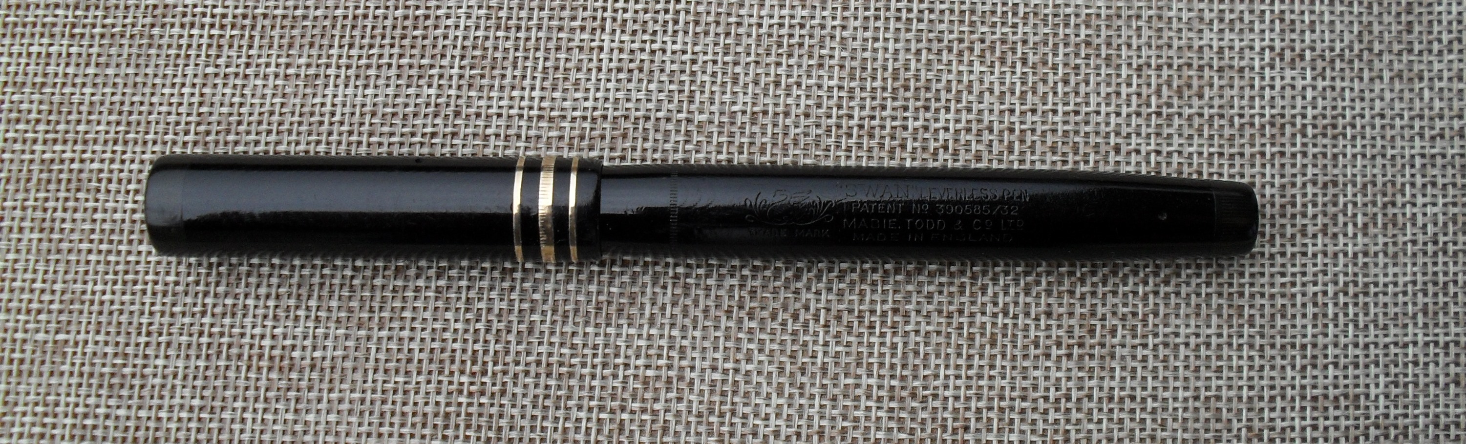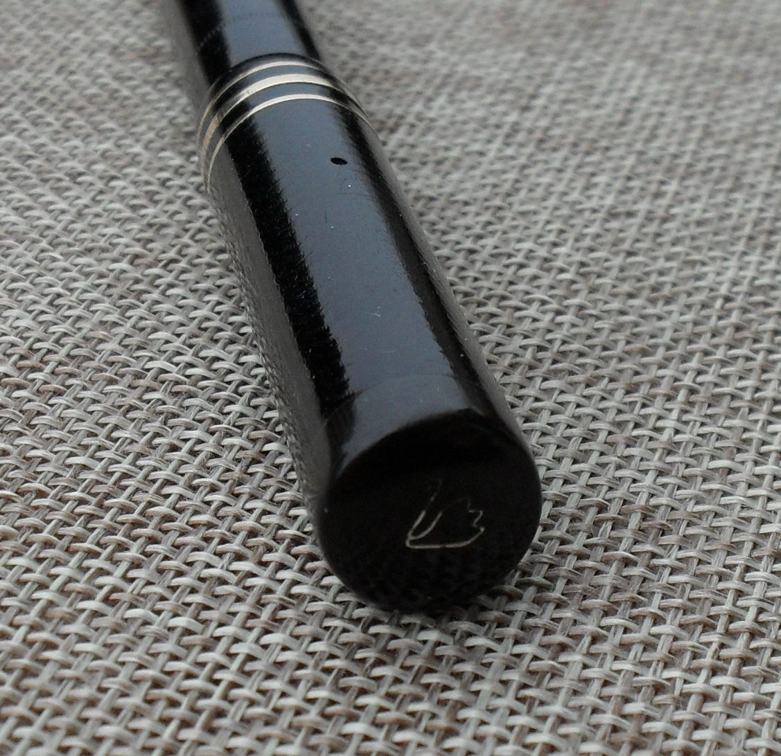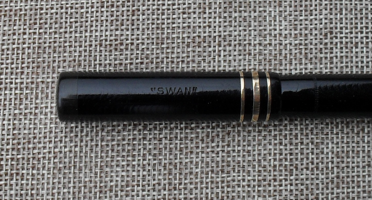 Questa soluzione riscosse subito molto successo, dando la possibilità ai pubblicitari di attribuire alla “Leverless Pen” il titolo di “Penna dell’Impero Britannico”. Quella che vedete è una Leverless 24/60 (il codice è riportato sul fondello, come da prassi Mabie Todd) e degna rappresentante della versione di maggiori dimensioni, caratterizzata dalle tre verette sul cappuccio (quella centrale più larga). Il colore nero, le forme e l’assenza della clip suggeriscono che si tratti di un esemplare della produzione iniziale: le Leverless successive si fecero notare per la varietà dei colori. La penna è stata evidentemente utilizzata per molti anni: la cesellatura del corpo e del cappuccio è appena visibile, nonostante il corpo e la sezione siano in celluloide. L’ebanite è stata utilizzata per il fondello e per il tassello di chiusura del cappuccio, così come per l’alimentatore: una soluzione costruttiva molto in voga fra i produttori inglesi del periodo. Nonostante l’uso lungo ed intenso, le condizioni sono davvero buone. La parte più interessante della penna, o se si vuole la sua caratteristica peculiare, è il pennino. Non solo è di misura ridotta rispetto alla prassi (la versione “oversize” della Leverless Pen usualmente montava pennini più grandi), ma è flessibile, con punta tronca. La sezione riporta la scritta “Swan L2”, del tutto coerente con il pennino. Negli anni ’30, per gli acquirenti di penne costose, e la Leverless Pen 24/60 non era certamente economica, era normale ottenere il montaggio di un pennino personalizzato. Il cappuccio, caratterizzato da due fori di aereazione, riporta la scritta “SWAN” ed un cigno stilizzato sul tassello. Molto estesa la scritta impressa sul corpo, su quattro linee: