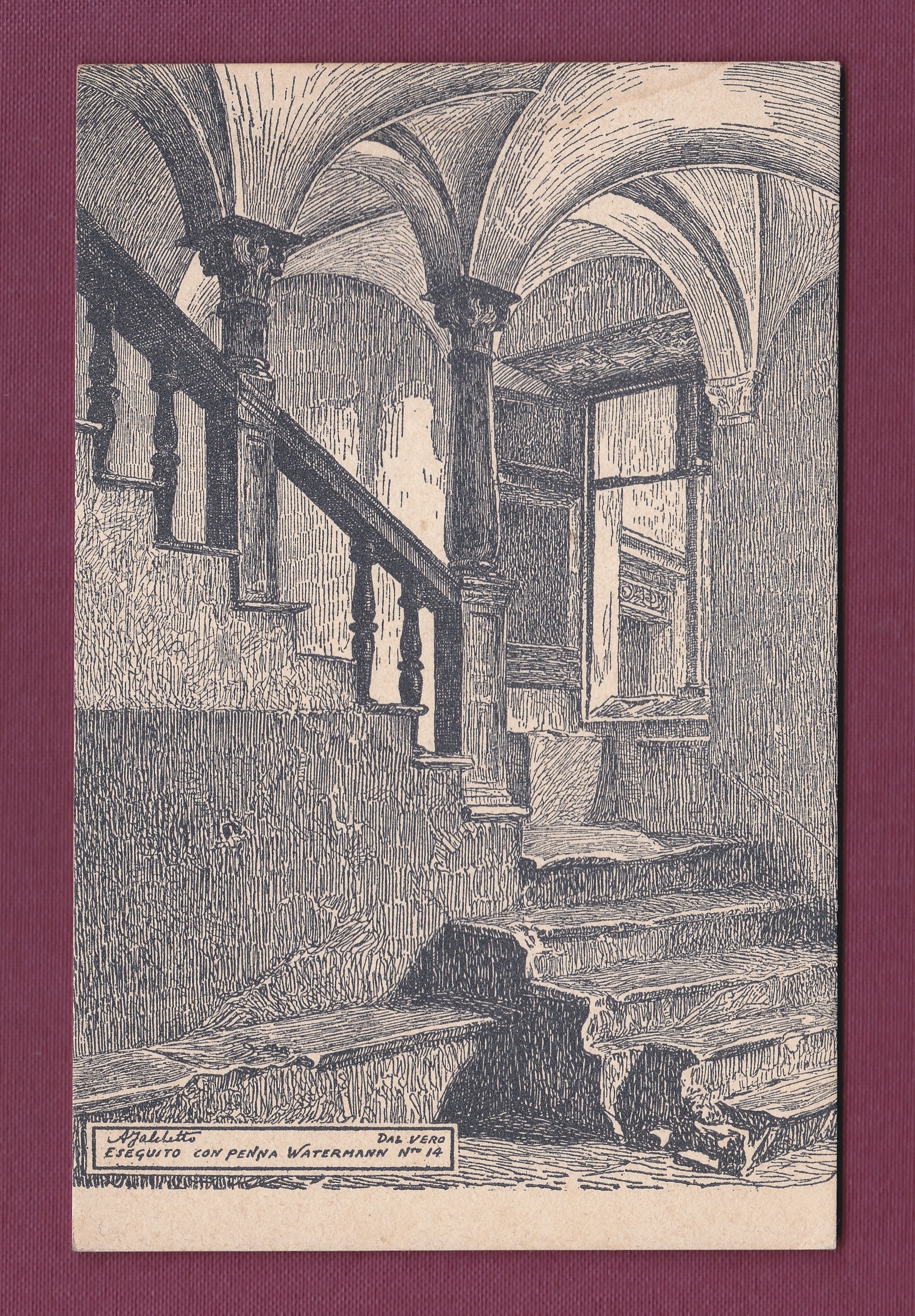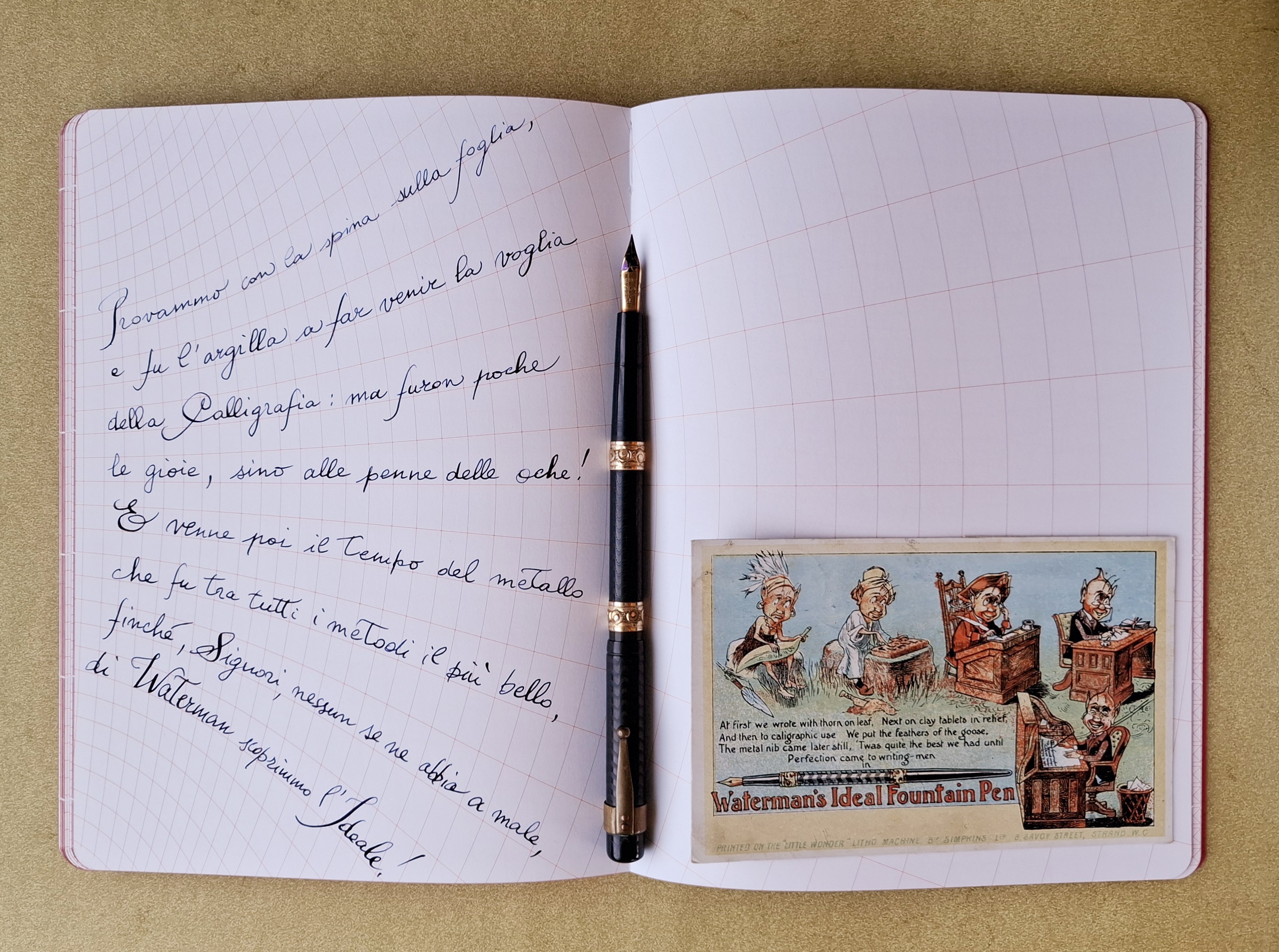 Ma l’informazione che la didascalia delle cartoline vorrebbe soprattutto comunicare è che il disegno sul fronte è stato eseguito con una Waterman’s Ideal 14: una eyedropper in ebanite, con cappuccio ad incastro e pennino #4.
