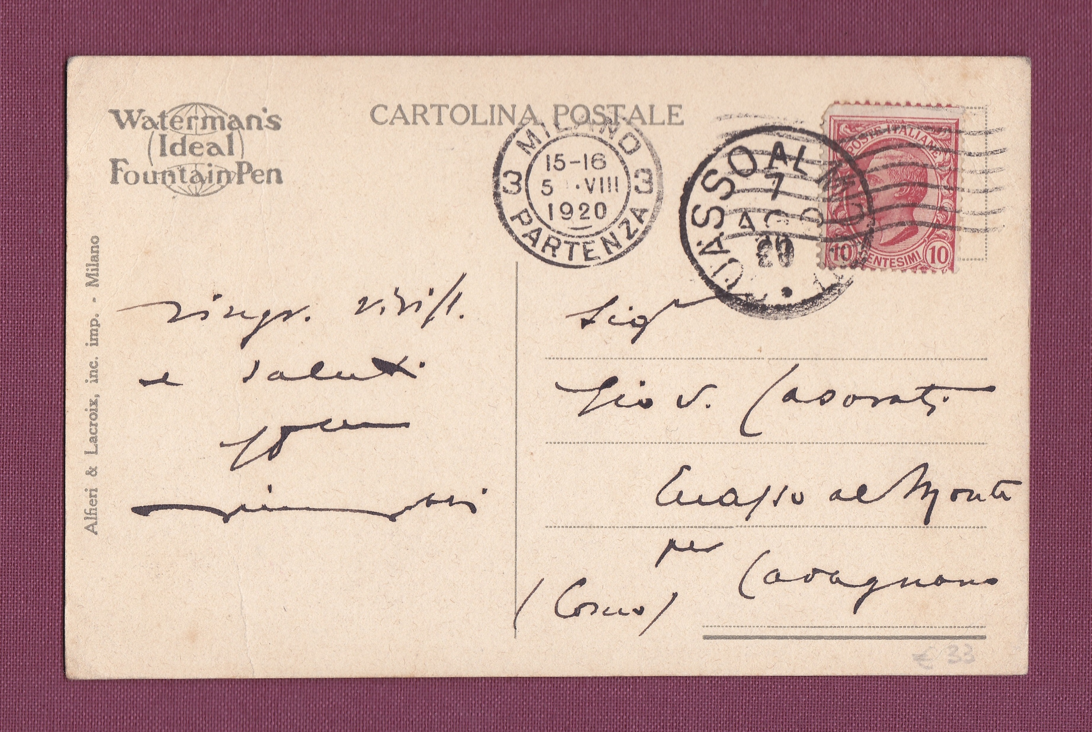 La prima è una cartolina “viaggiata”, partita da Milano il 5 Agosto 1920 e giunta a Cuasso al Monte (oggi in provincia di Varese, sulla sponda italiana del Lago di Lugano) due giorni dopo...