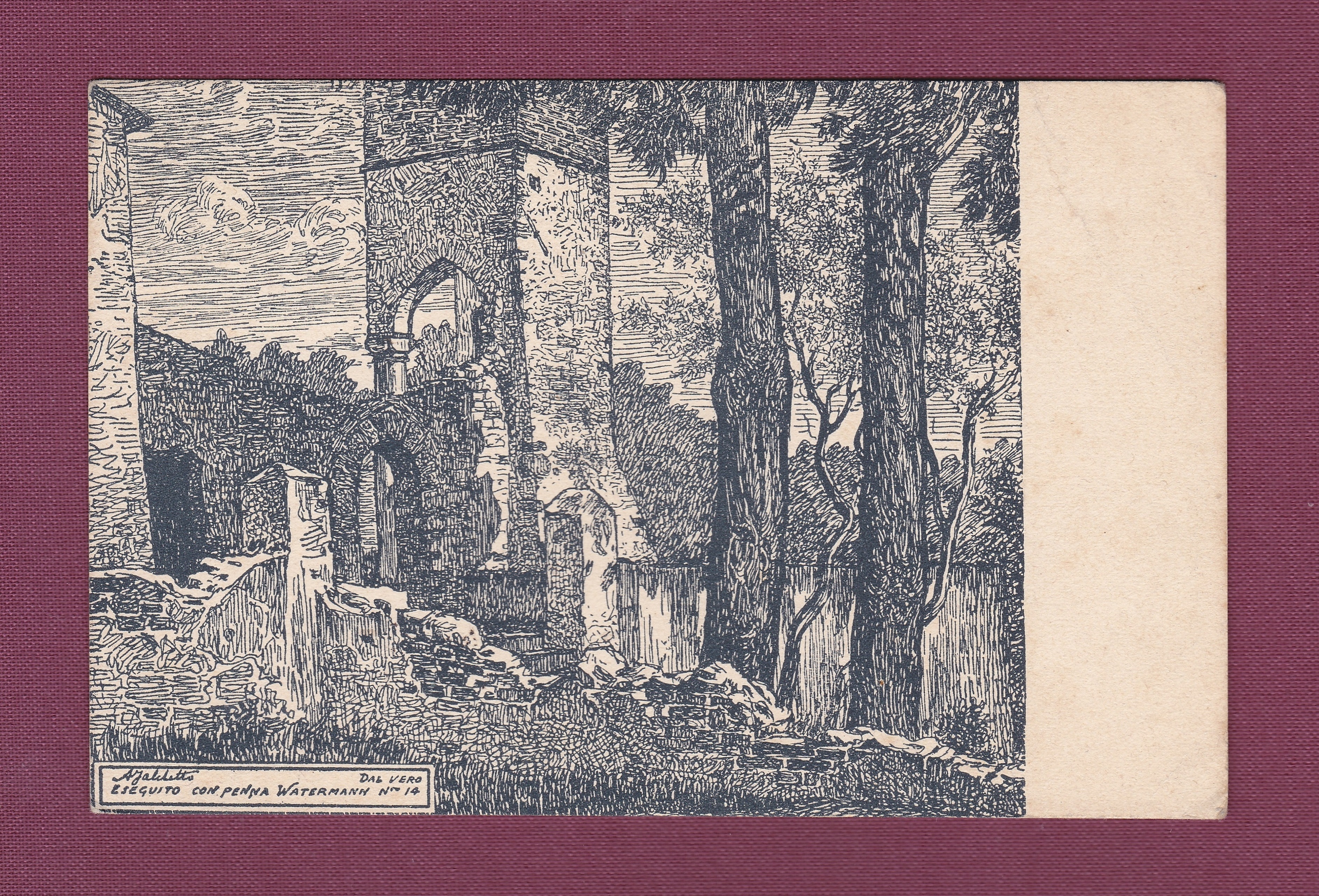 un disegno che mostra i ruderi di un castello, molto simile (a tantissimi ruderi :D ma anche) al “Castelasc” di Cuasso al Monte ove risiedeva il destinatario della cartolina…