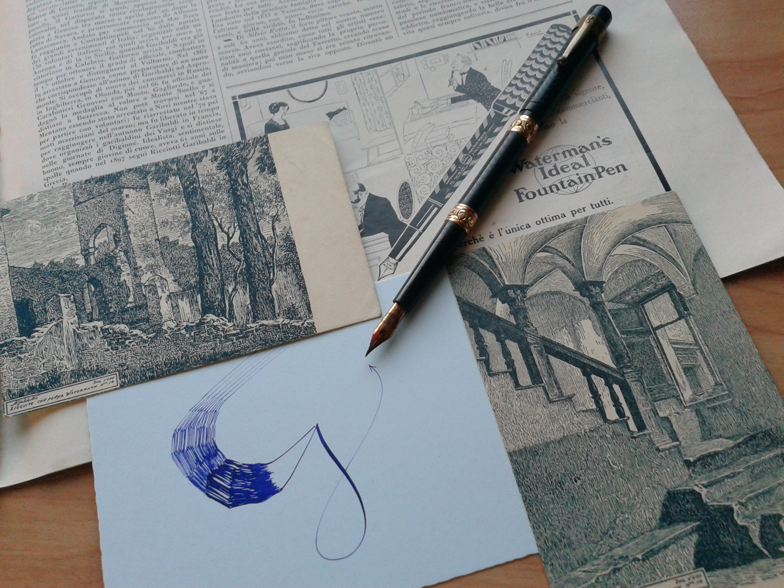 Vista la scelta del tipo di cartolina postale (che parla di una stilografica) e soprattutto, una seconda cartolina Waterman con un altro soggetto indirizzata alla stessa persona (che forse acquisterò la prossima volta al mercatino), potremmo legittimamente presumere che anche il testo della cartolina “viaggiata” sia stato vergato proprio con una penna come quella servita per effettuare la copia dal vero…
