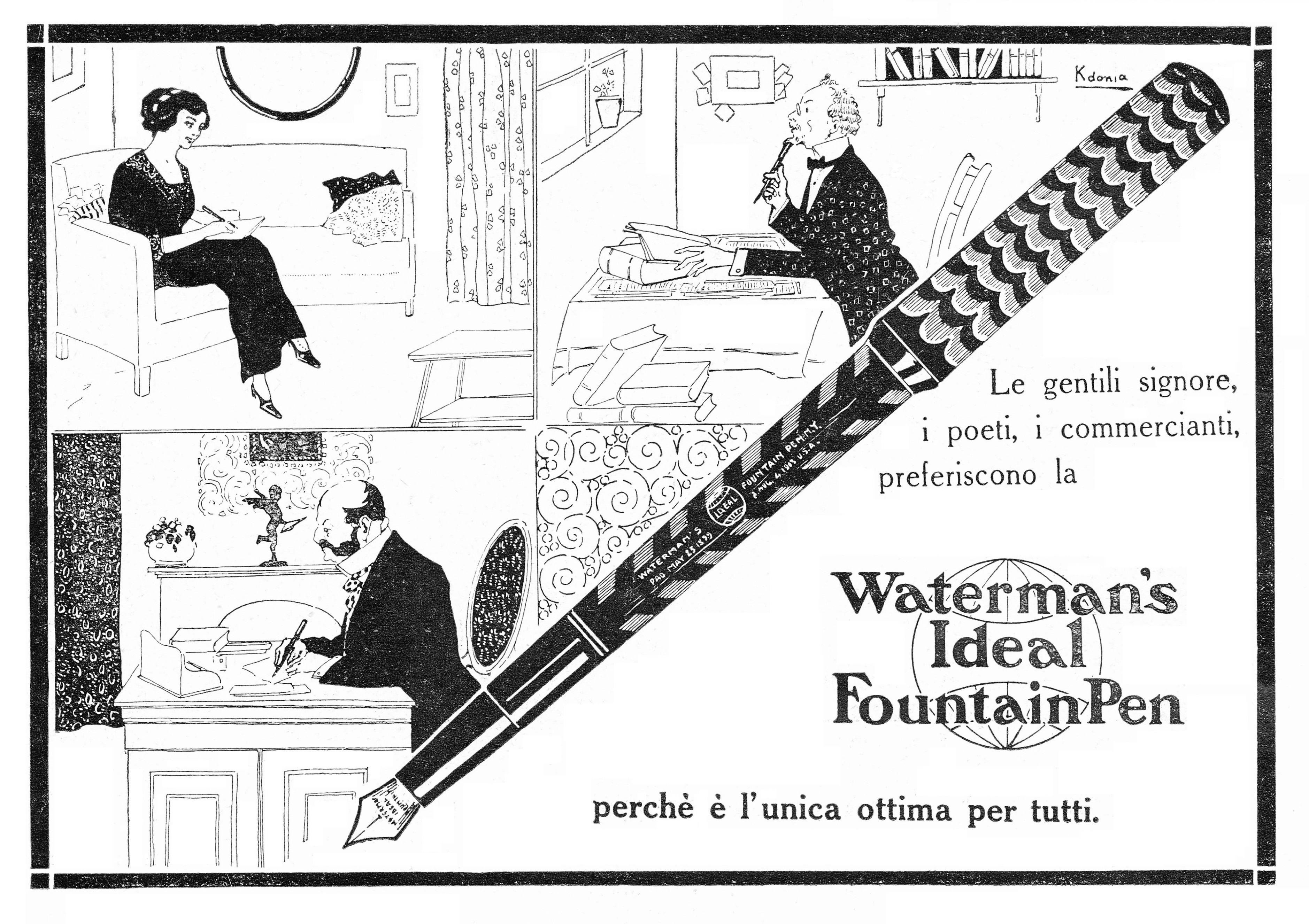 La seconda è la firma dell’autore, il grande Cappadonia (allora solo venticinquenne), che evidentemente nella prima fase della carriera si firmava “Kdonia”: il suo disegno, come sempre d’effetto, lascia intendere al fruitore che le Signore eleganti, i Poeti in giacca da camera e gli uomini d’affari con i bronzetti sul camino erano i destinatari privilegiati dello strumento di scrittura, con il quale li vediamo effettivamente scrivere… :clap: