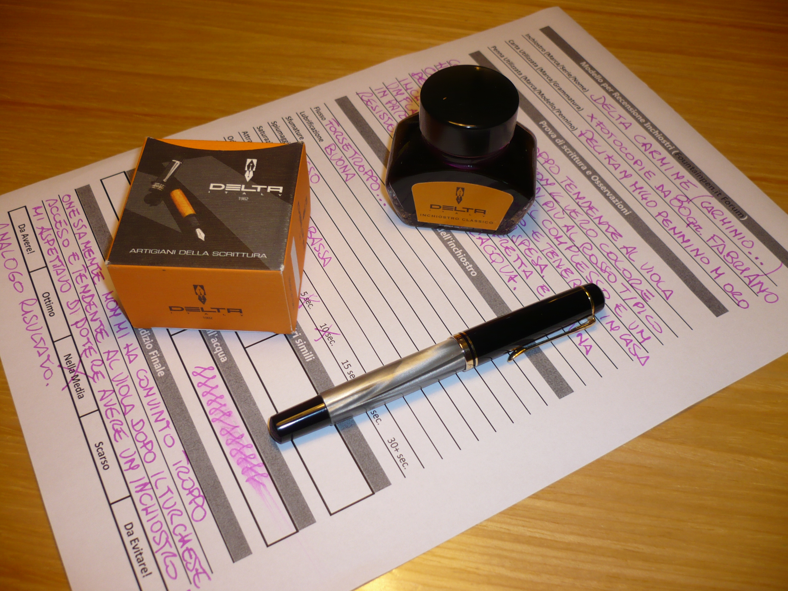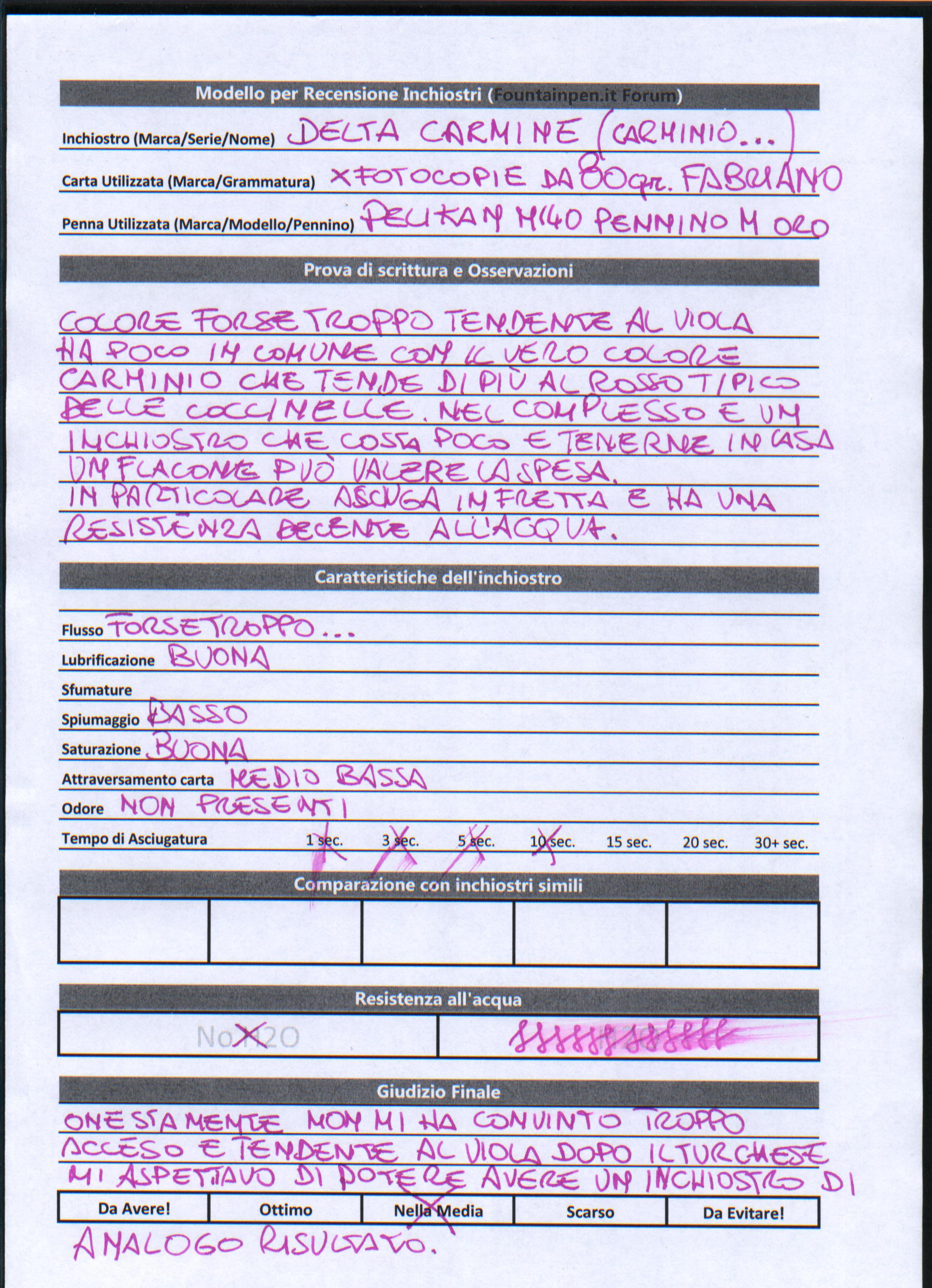 Ciao Maruska, no è proprio l'inchistro, considera che rispetto al turchese sempre delta, è almeno un terzo più fluido, ha sorpreso anche, se non ci fosse la scritta su i calamai sembrebbero di due case diverse. Il colore con lo scanner non viene benissimo, per darti una idea e meno intenso di un viola imperiale di Diamine una volta asciugato. Poi c'è un errore perchè per la scheda ho usato un M250 pennino in oro M non la M140 con cui avevo fatto le prove iniziali su blocco notes.