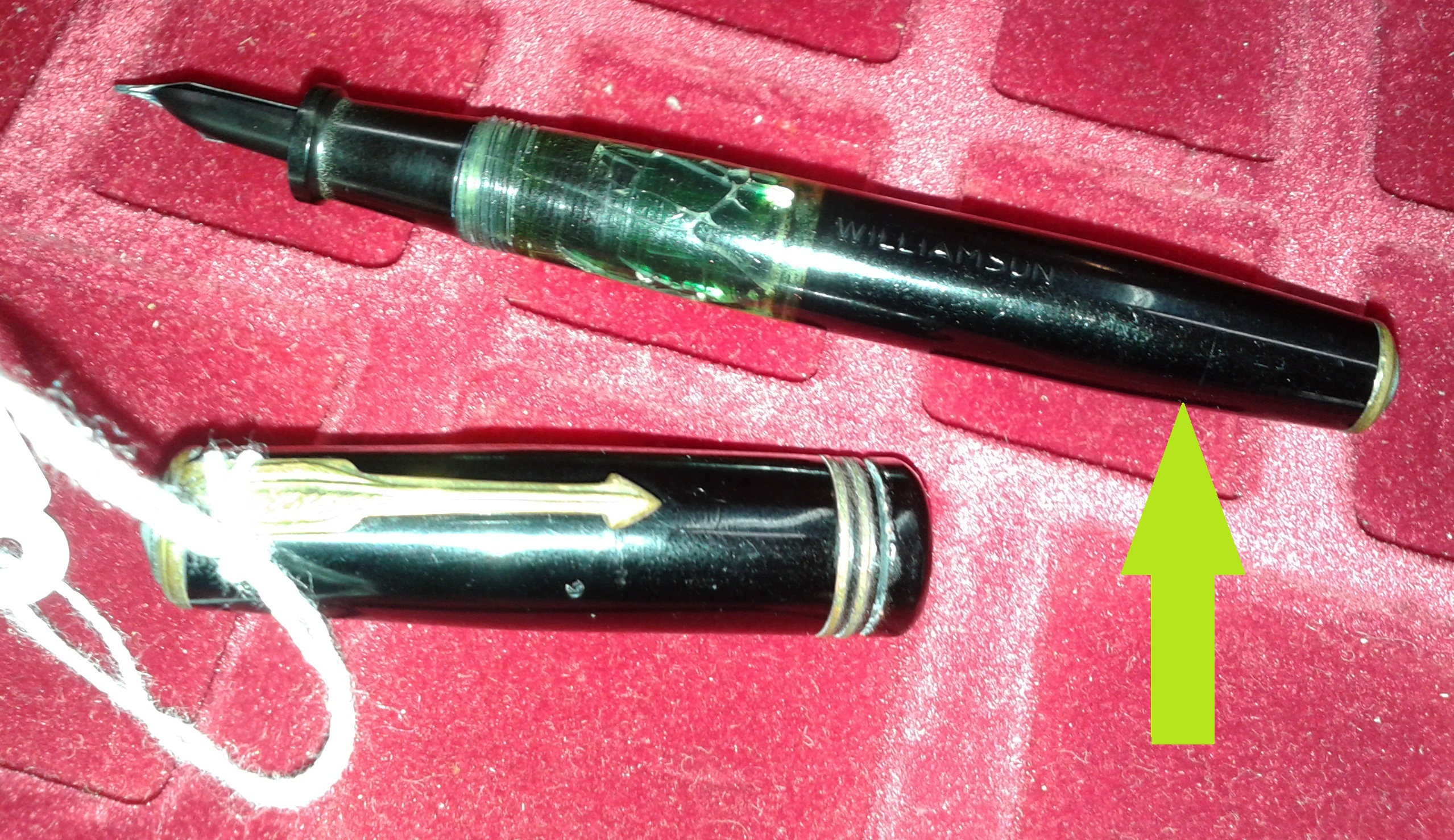 La freccia indica la linea del fondello, piuttosto alta sul fusto, che nasconde il comando dello stantuffo in stile MontBlanc anteguerra.